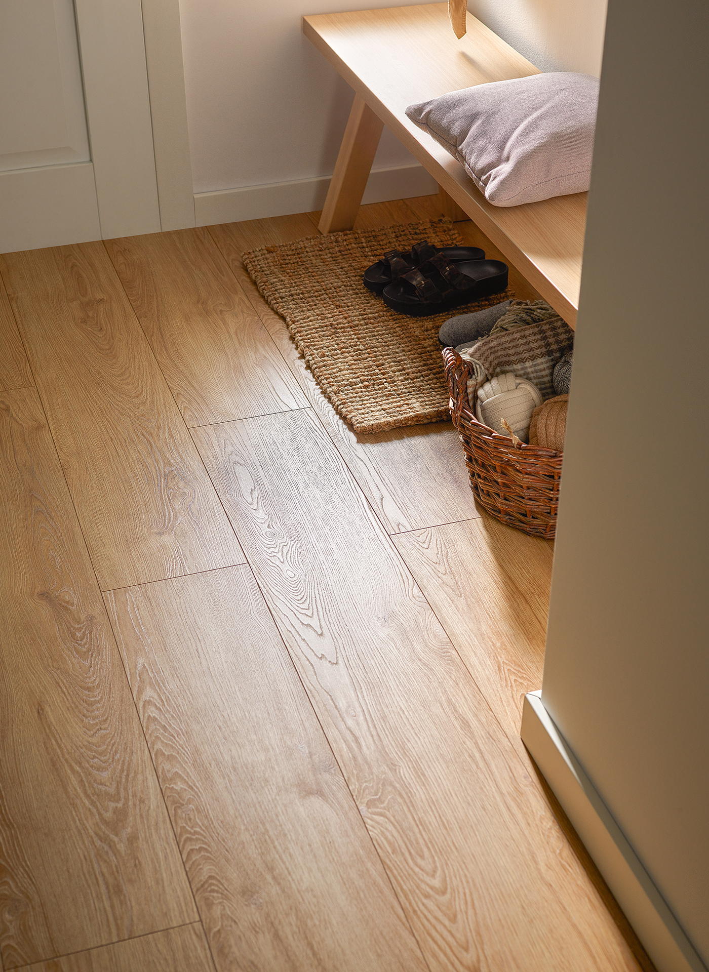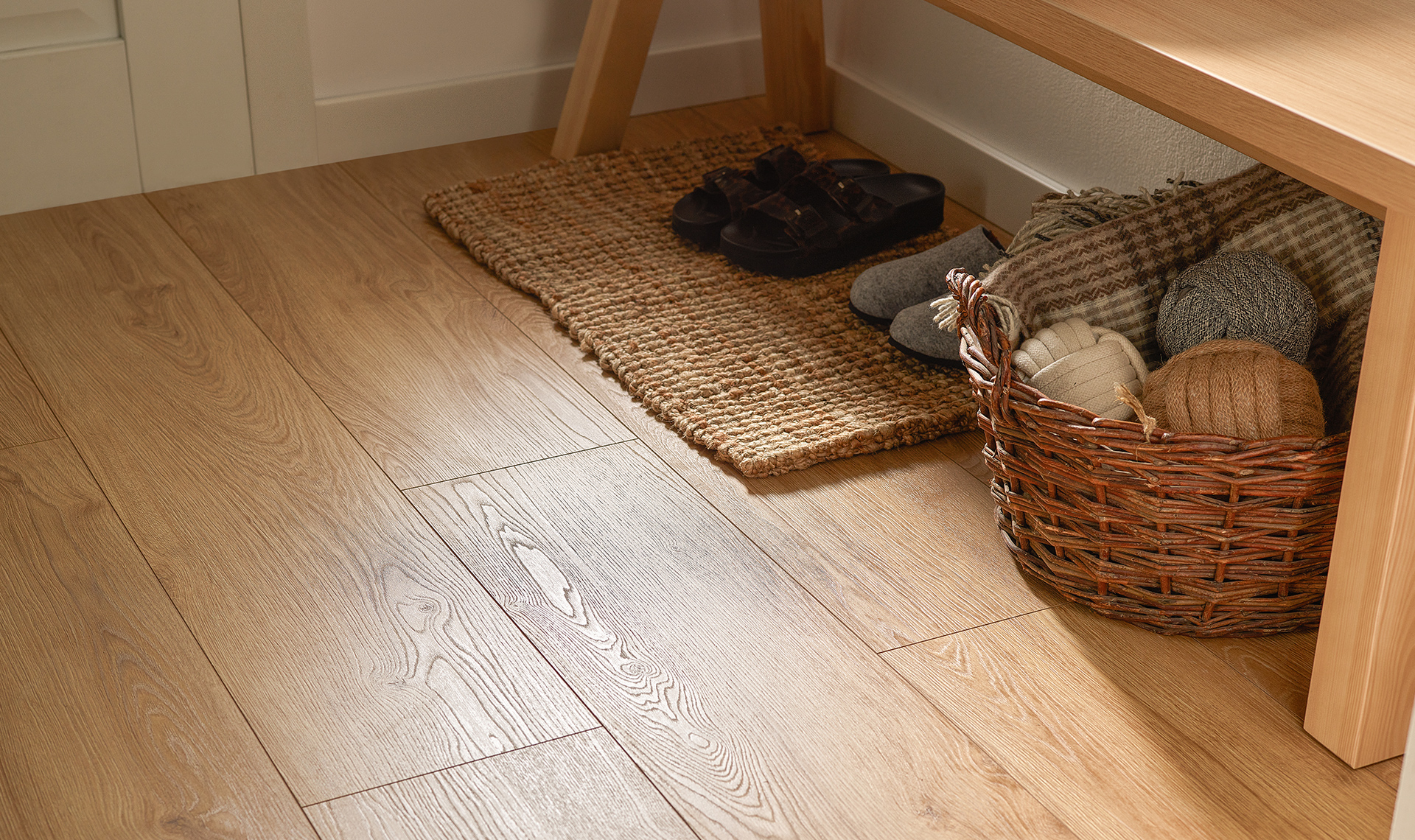 Wzmocniona górna warstwa podłogi Querra Balance WR zapewnia zwiększoną odporność na mikrozarysowania, dzięki czemu jej struktura postarzonego drewna utrzymuje się przez lata. Panel Dąb Vente o wysokiej klasie ścieralności AC5, dzięki bardziej szczelnemu zamkowi i dodatkowym zabezpieczeniom umożliwia montaż paneli w pomieszczeniach o zwiększonej wilgotności (z wyłączeniem sauny i strefy prysznica).