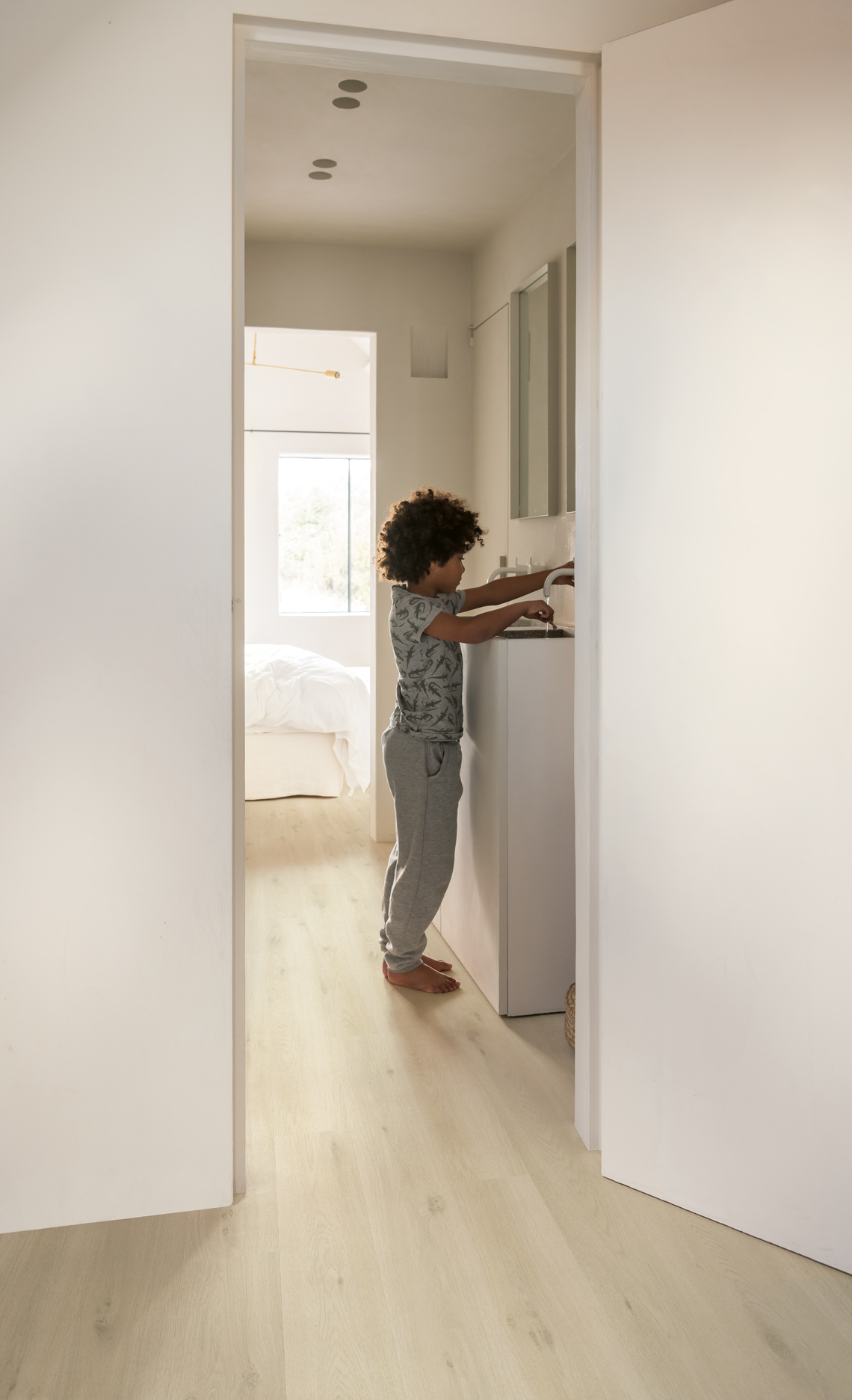 Kolekcja Liv oferuje eleganckie, funkcjonalne deski małej wielkości, które zapewnią wygodę i dobre samopoczucie. Idealnie pasują do nowoczesnych wnętrz, zwłaszcza w małych przestrzeniach. Wybierając wodoodporne podłogi Quick-Step, zyskujesz 100% odporności na wilgoć, co ułatwia czyszczenie. Dodatkowo, technologia Scratch Guard zapewnia dziesięciokrotną odporność na zarysowania w porównaniu do tradycyjnych podłóg.
