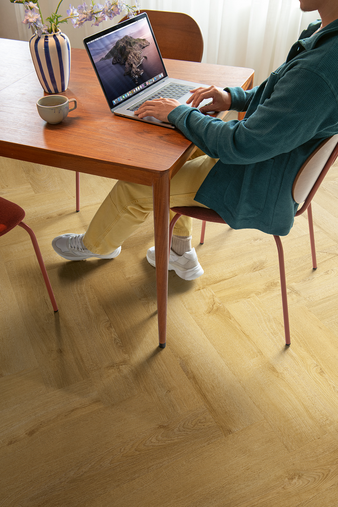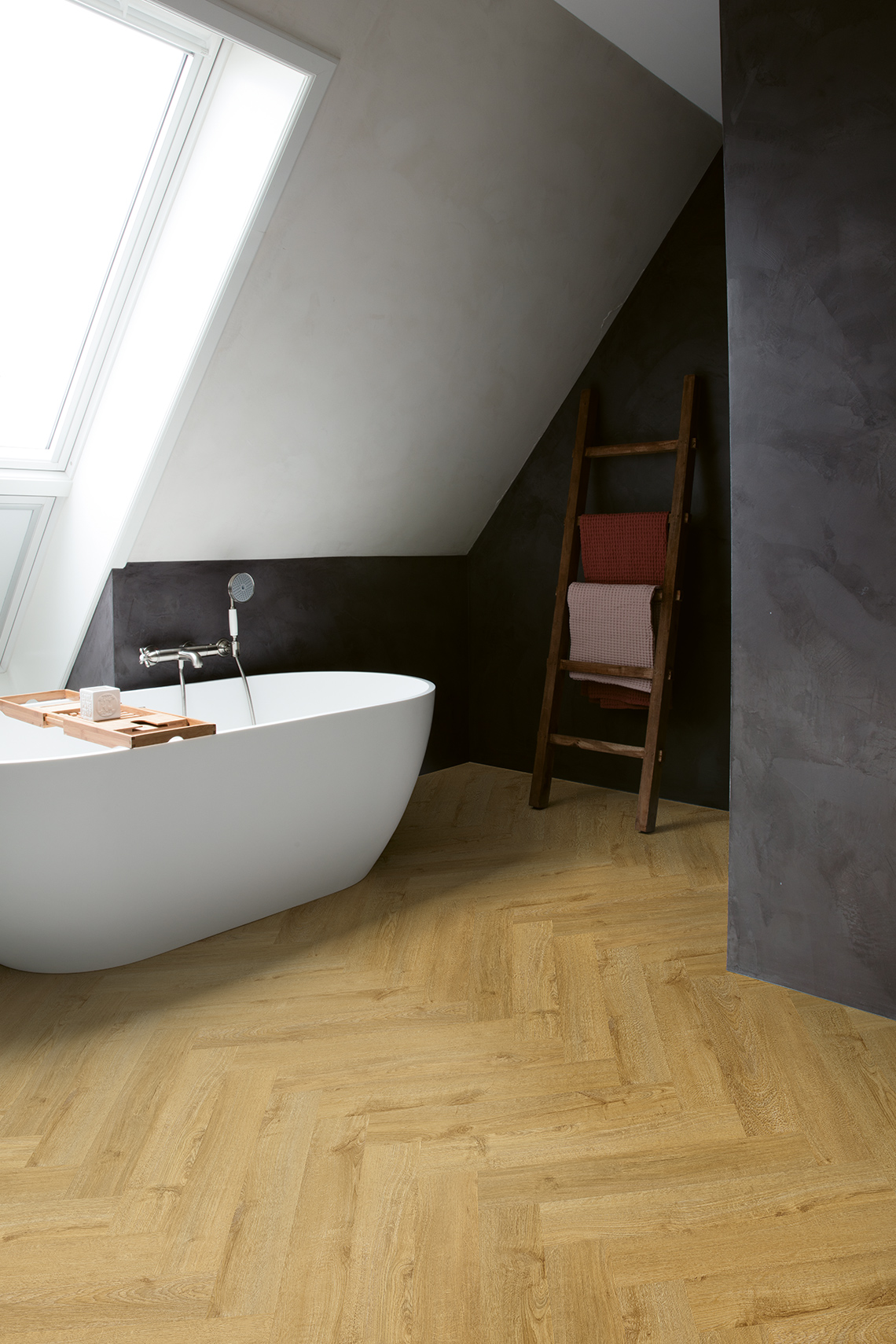 Kolekcja winylowych podłóg Pristine w jodełkę łączy klasyczny styl z nowoczesnym wzornictwem, nadając wnętrzu wyjątkowy charakter. Wybierając wodoodporne podłogi Quick-Step, nie musisz martwić się o wilgoć – oferują 100% odporność na wodę, co ułatwia czyszczenie. Dodatkowo, technologia Scratch Guard zapewnia dziesięciokrotną odporność na zarysowania w porównaniu do tradycyjnych podłóg.