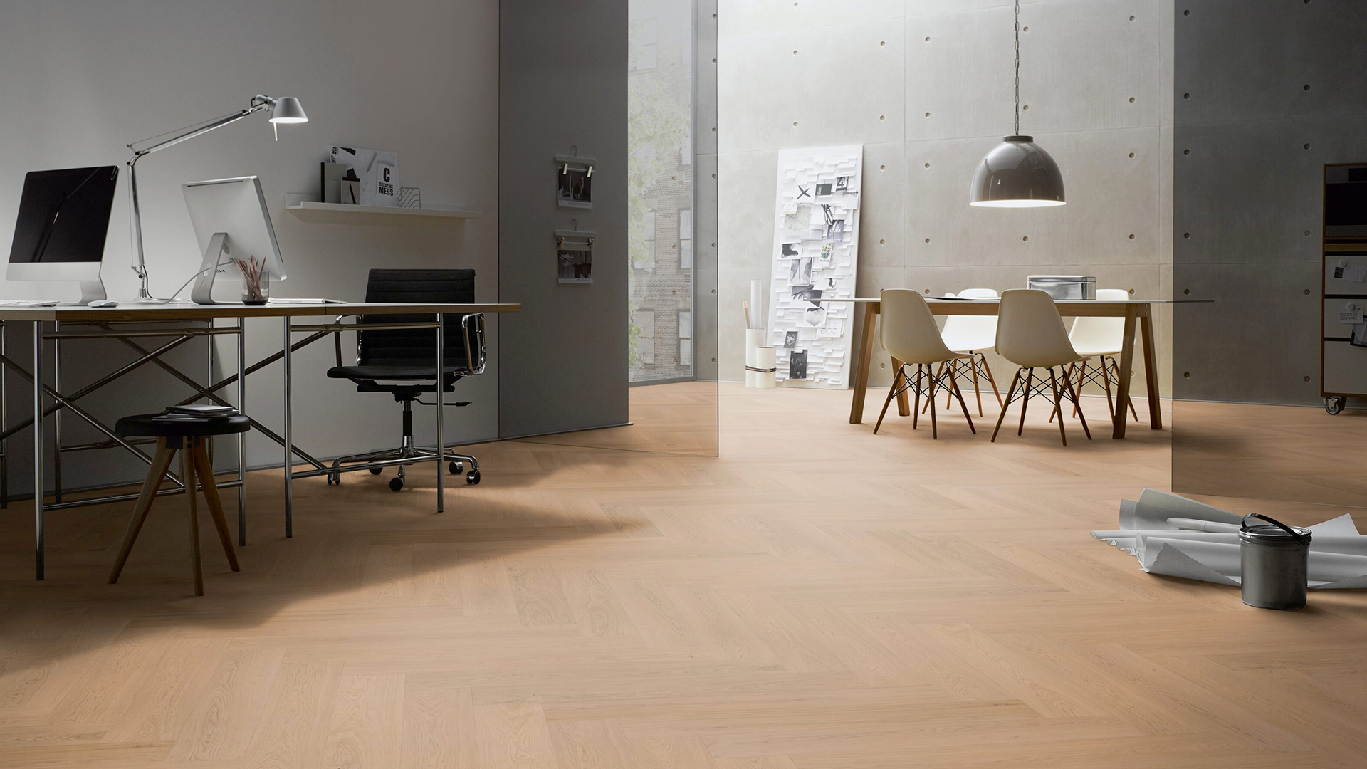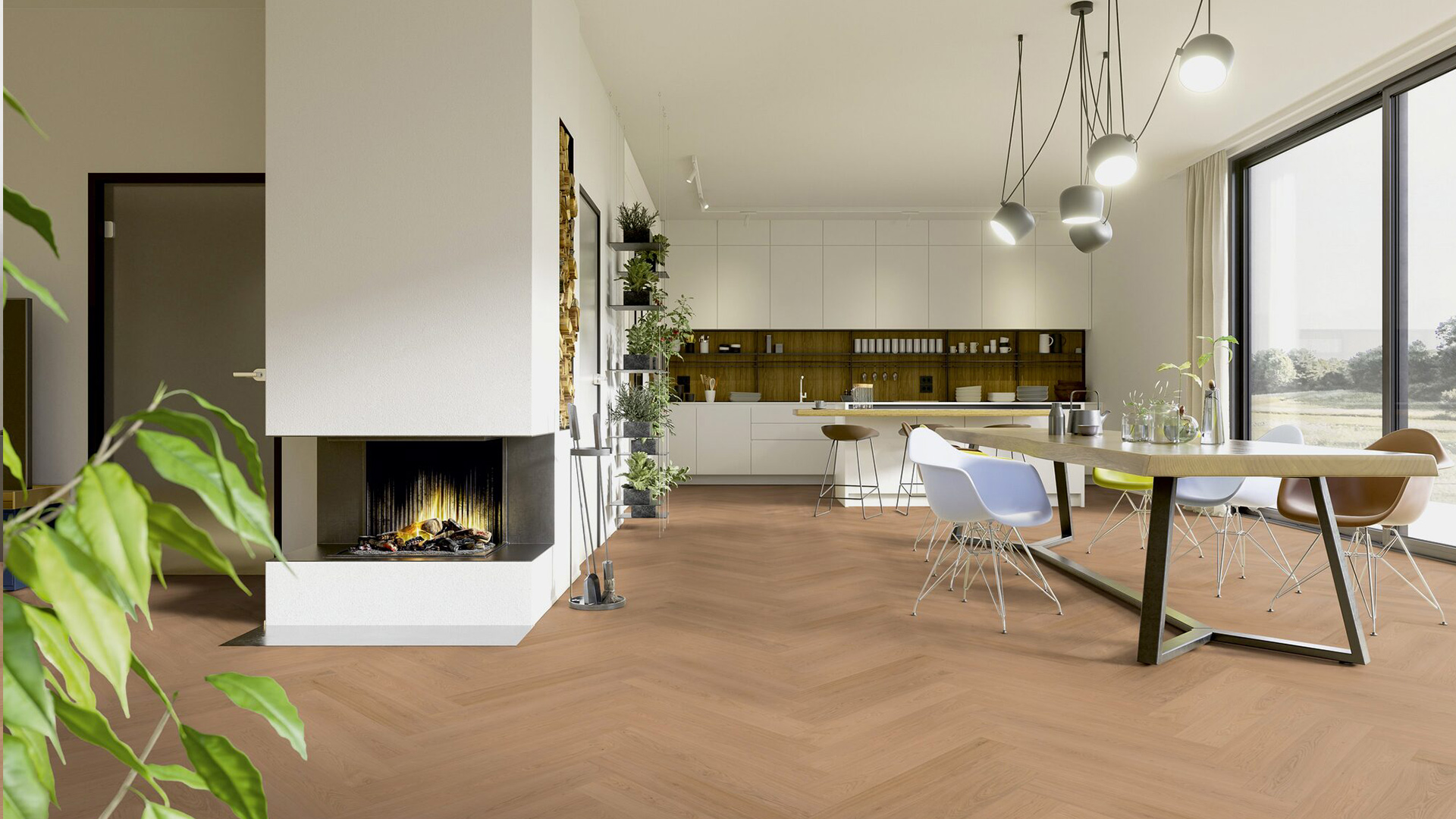 Układ Herringbone (jodełka) nadaje przestrzeni wyjątkowego charakteru i głębi, tworząc elegancki wzór. Panele mają standardowe wymiary i są dostępne w łatwym do montażu systemie, co sprawia, że podłoga jest szybka i komfortowa do zainstalowania.