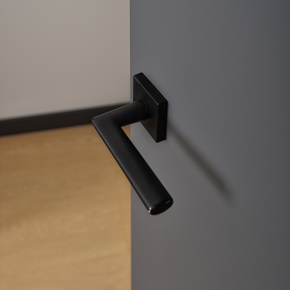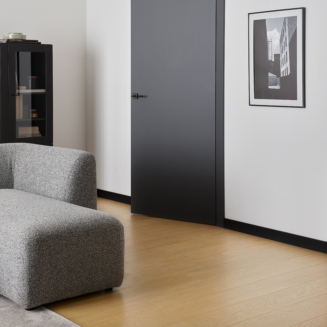 Matto to solidne drzwi o konstrukcji płytowej w sześciu nasyconych kolorach do wyboru – od jasnej szarości i bieli po głębokie indygo i czerń. Ich powierzchnia wykończona jest wysokiej jakości okleiną z matową powłoką, która zapobiega pozostawianiu śladów po palcach. Wypełnienie płytą wiórową otworowaną w opcji podstawowej zapewnia dobrą izolację akustyczną.