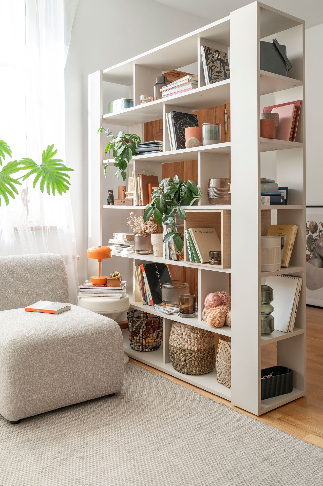 The double-sided bookcase from the 4 You Fresh collection will easily organize any space, while allowing for creative personalization with colorful boxes. From now on, you don't have to choose which side you'll place the furniture on, or decide what items can go on it. The sturdy double-sided bookcase will hold everything you want to display and divide the room perfectly.