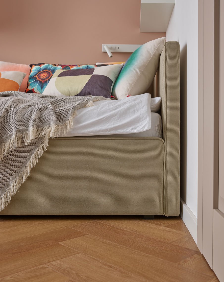 Choose the Nook corner bed and get a space perfect for sleeping, playing with friends and reading together. The corner headrest design provides a cozy place to sit during the day and protects the wall from dirt. The option to choose a left- or right-sided version and the type of upholstery fabric makes it easy to match the furniture to your own style and interior layout.