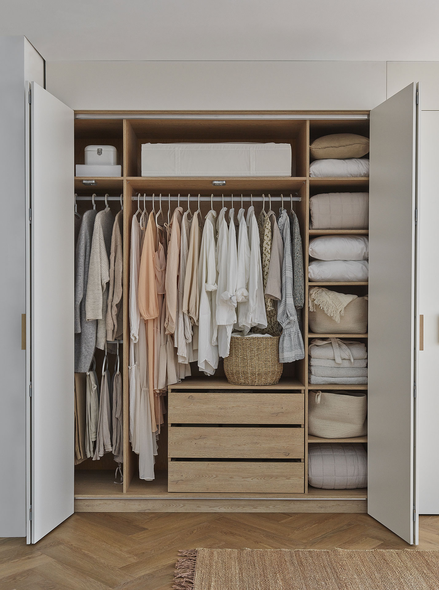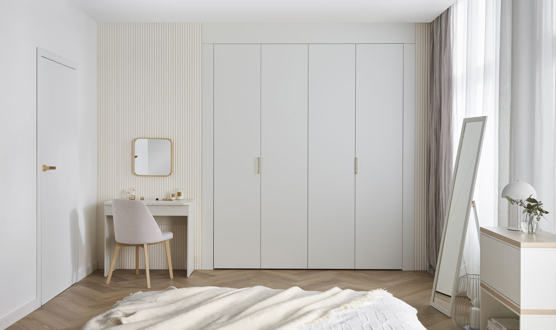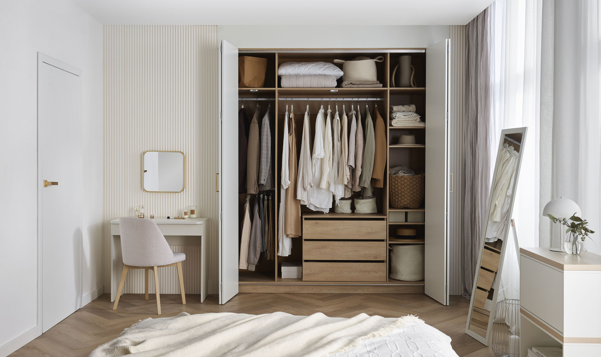 The large 4-door model of the Stor closet can serve as a full-size closet. Behind the accordion doors hides a spacious interior, the furnishings of which you can choose from the available packages or complement individually with additional items. Built-in LED lighting will make it easier to take things out after dark. Thanks to the possibility of personalization, you will create a piece of furniture that will perfectly fit your taste and available space.