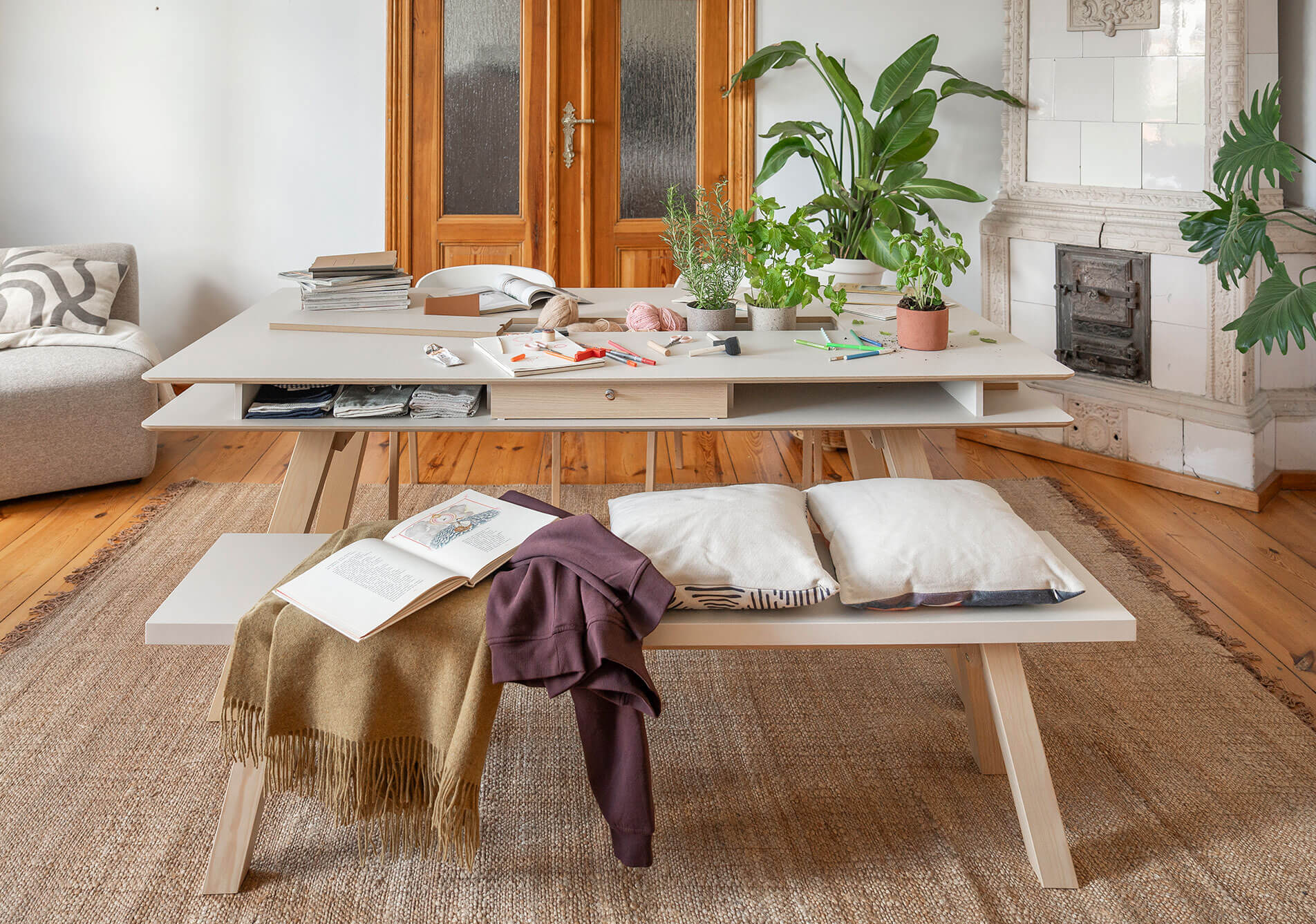 - The wide bench matches any VOX table. However, nothing prevents you from using it as a standalone piece of furniture: it will also work well in a hallway or home office.