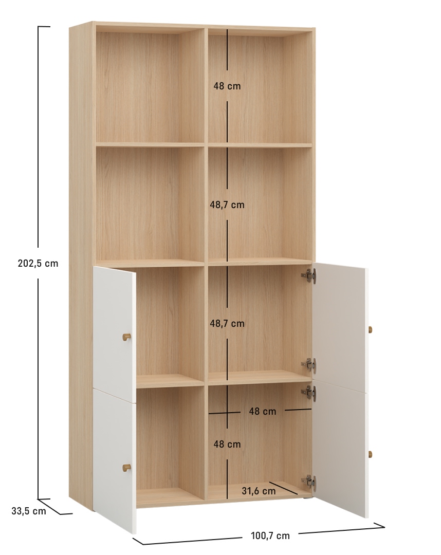 - The bookcase is divided by a vertical partition and 6 horizontal shelves, which divide its interior into 8 equal spaces. To make it easier to organize your items, you can buy additional shelves and practical fillers to help keep things in order.