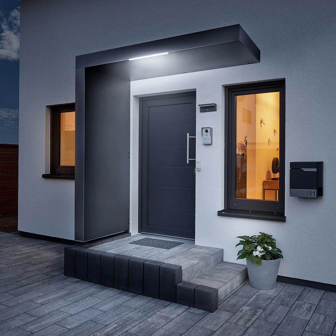Dzięki prostokątnemu zadaszeniu BS możesz dodać przysłowiową kropkę nad "i" swojemu domowi i ukoronować architekturę swojego wejścia klasyczno-nowoczesnym kształtem. Zadaszenie wykonane jest z antracytowego, malowanego proszkowo aluminium oraz wypełnione płytami izolacyjnymi EPS, co zapewnia maksymalną stabilność formy. Ale to nie wszystko: płyty izolacyjne sprawiają również, że krople deszczu padające na daszek nie powodują już irytujących hałasów. Kolejnym świetnym rozwiązaniem jest bezpośrednio zintegrowane, mocne oświetlenie LED, które przy minimalnym zużyciu energii zapewnia stałe dobre oświetlenie wejścia. Dzięki temu możesz zrezygnować z dodatkowej zewnętrznej lampy. Dodatkowy efekt uzyskują nasze zadaszenia, będące gwiazdami designu, dzięki atrakcyjnej i użytecznej ściance bocznej. W ten sposób wejście staje się wielofunkcyjną przestrzenią atrakcyjnej formie.