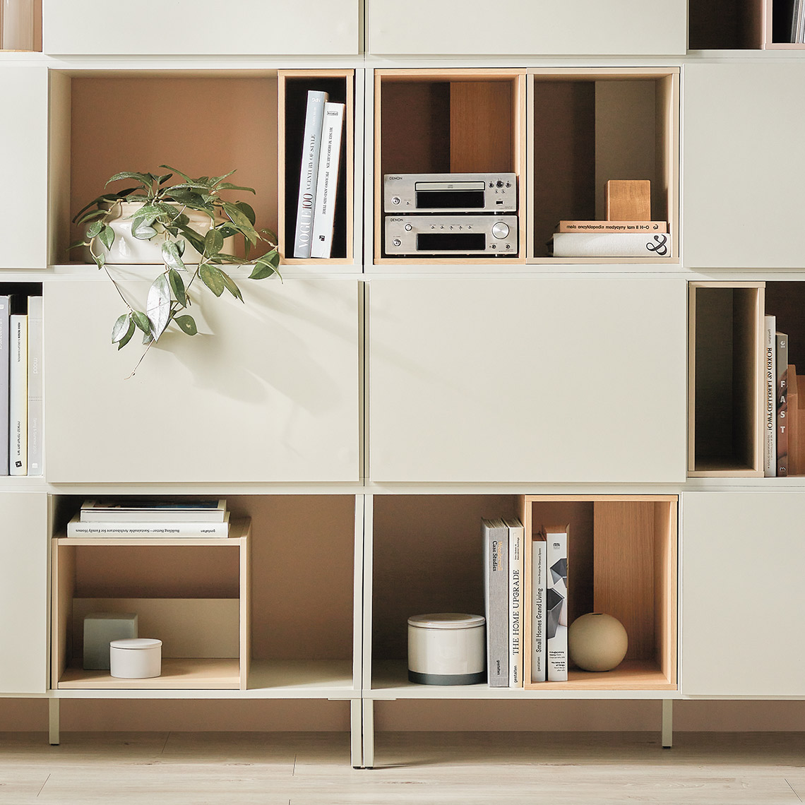 The INTO system allows you to freely compose bookcases, sideboards and cabinets to suit your own needs and different spaces. It consists of a base cabinet, a set of legs and boxes.