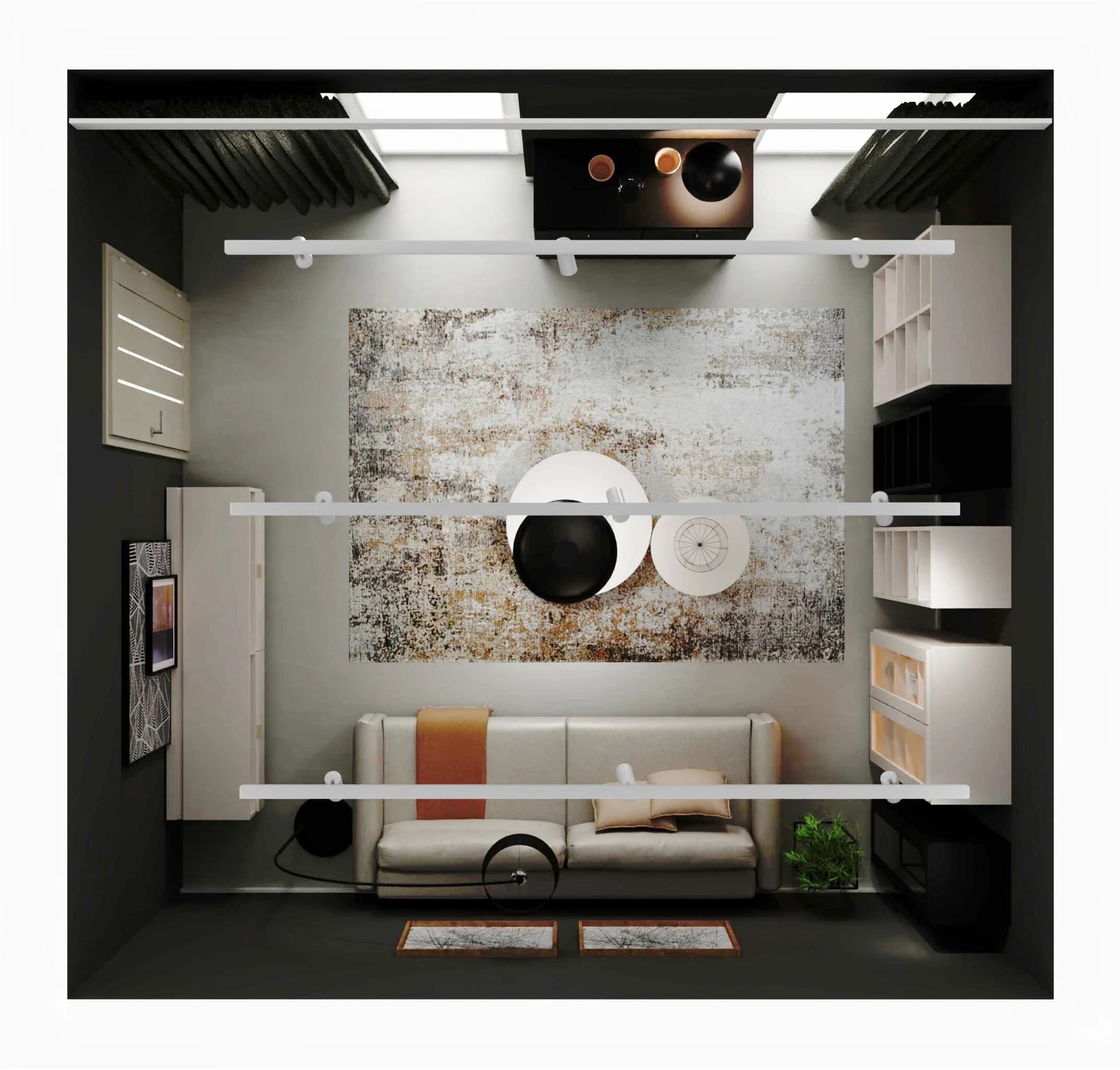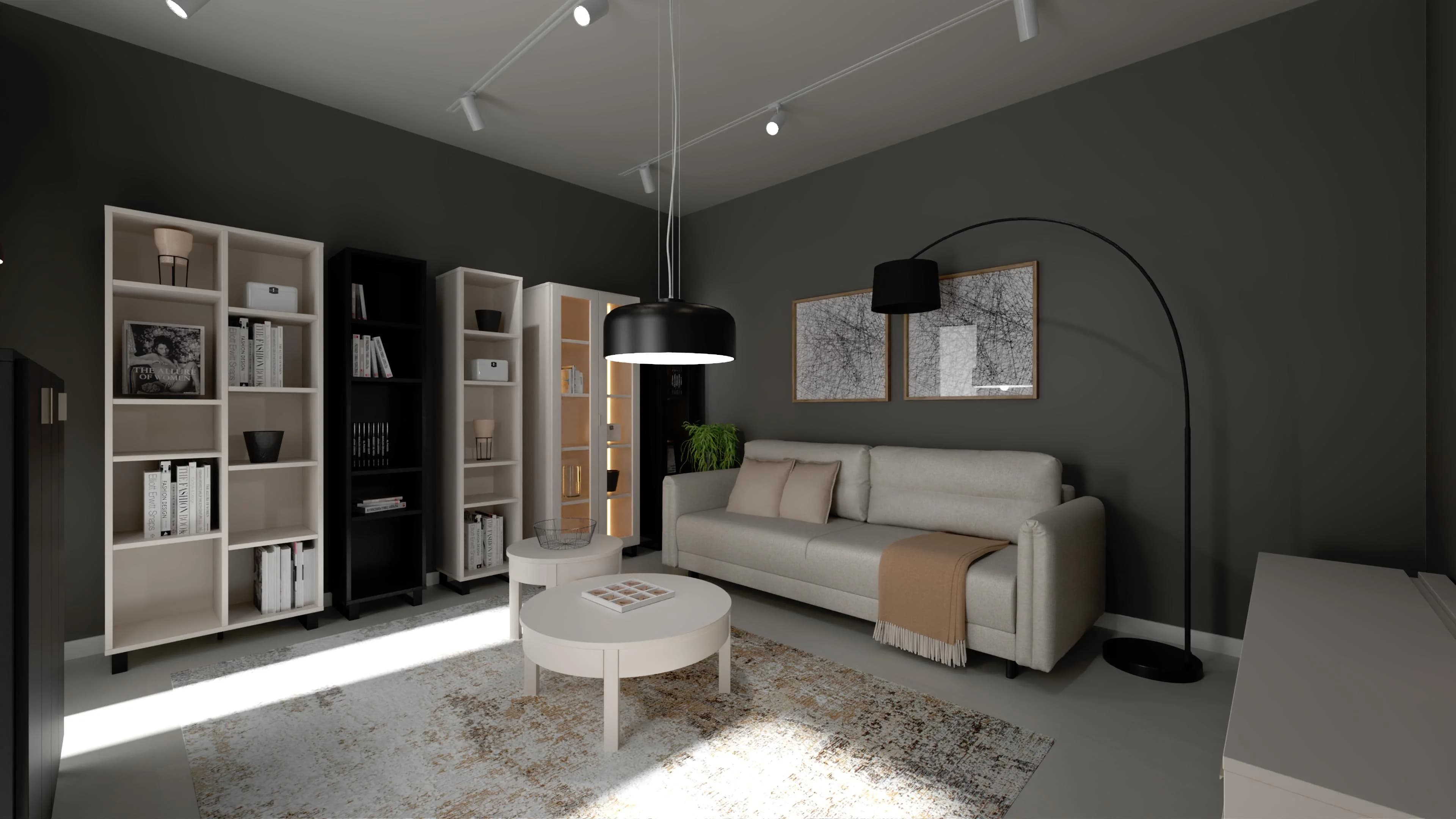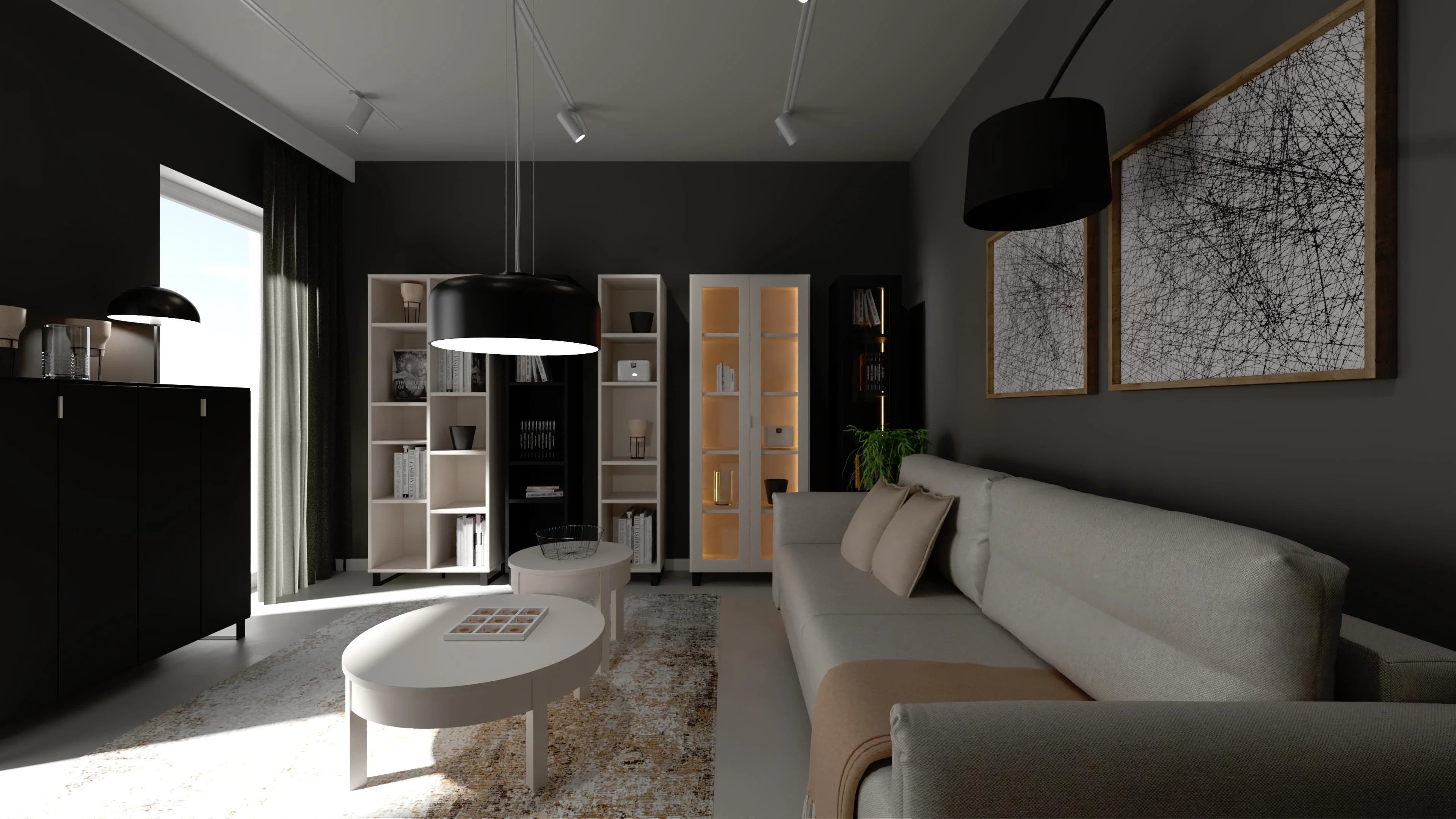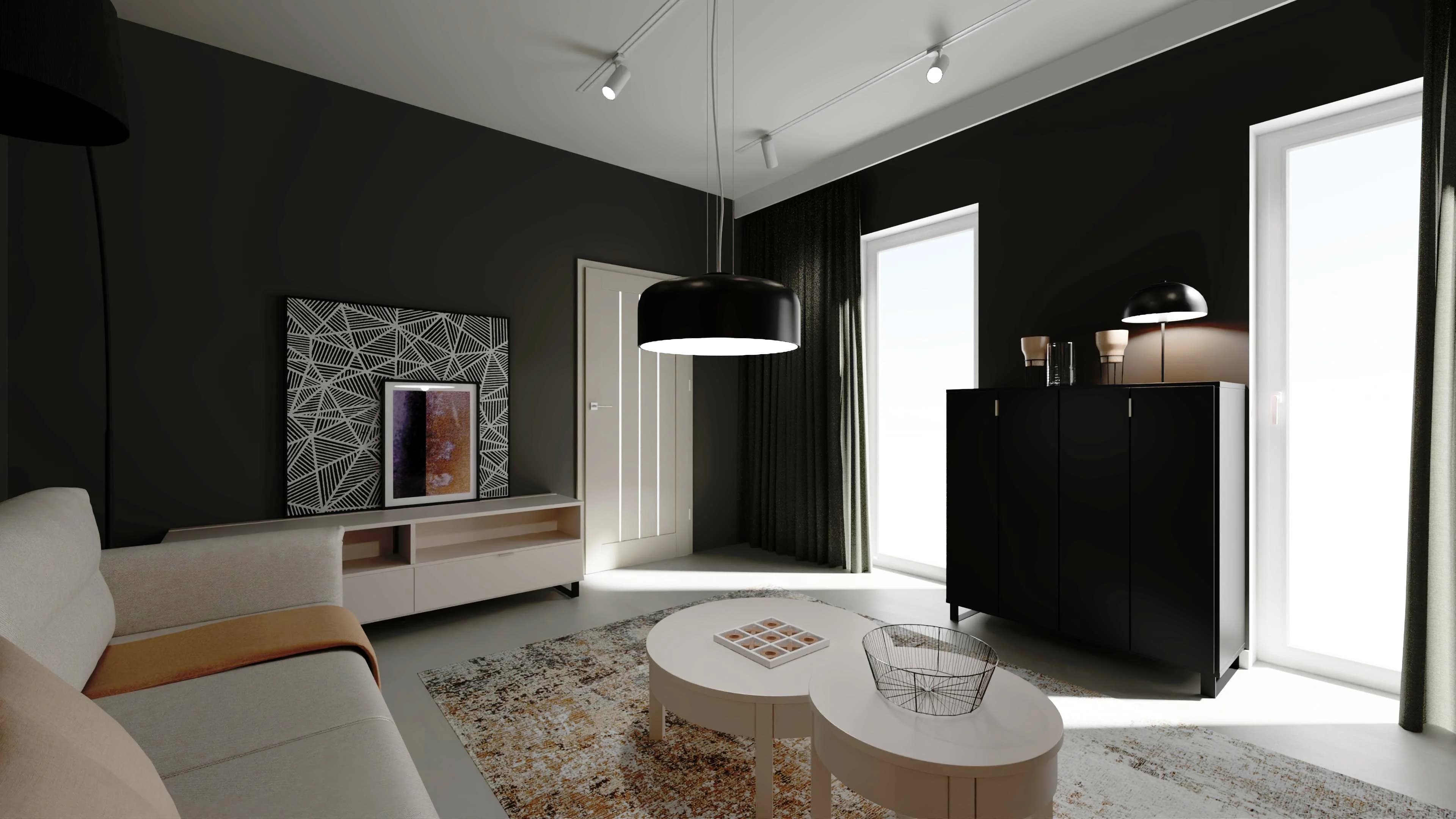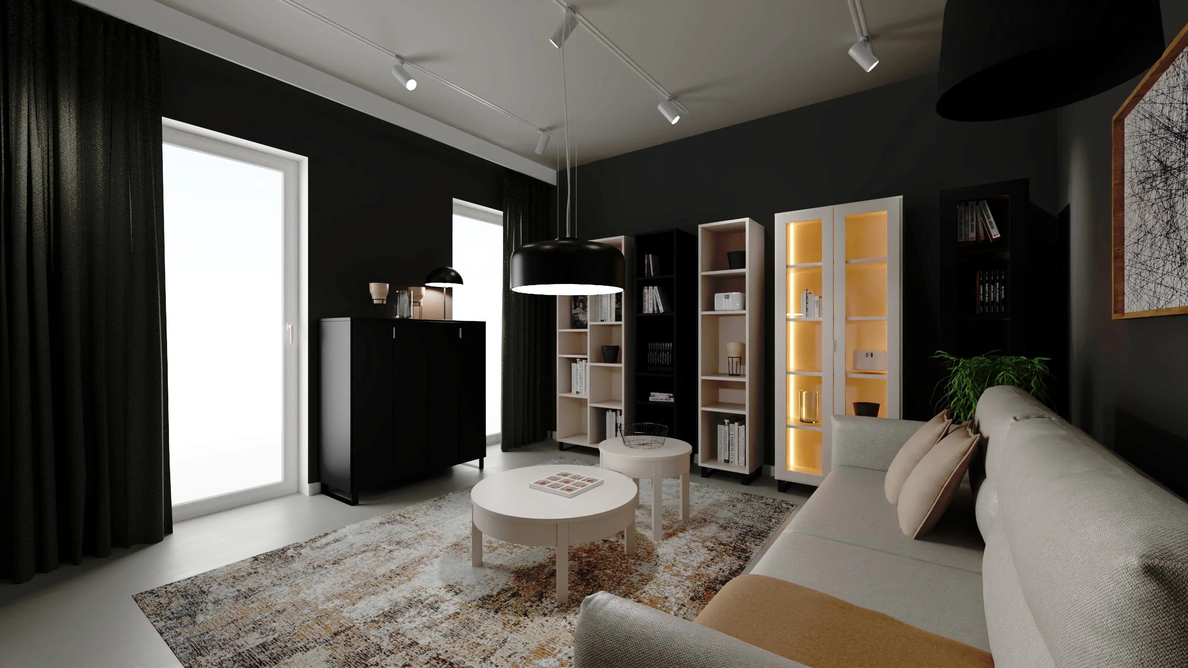 The design of this living room proves that black and beige make the perfect duo. The black walls provide a striking backdrop to the light sofa and furniture, emphasising their form. The two tables on the soft carpet are illuminated by a low-hanging black lamp, which adds character to the interior. The light ceiling and floor balance the space and give it a light feel. The elegant living room is conducive to relaxation and gatherings.