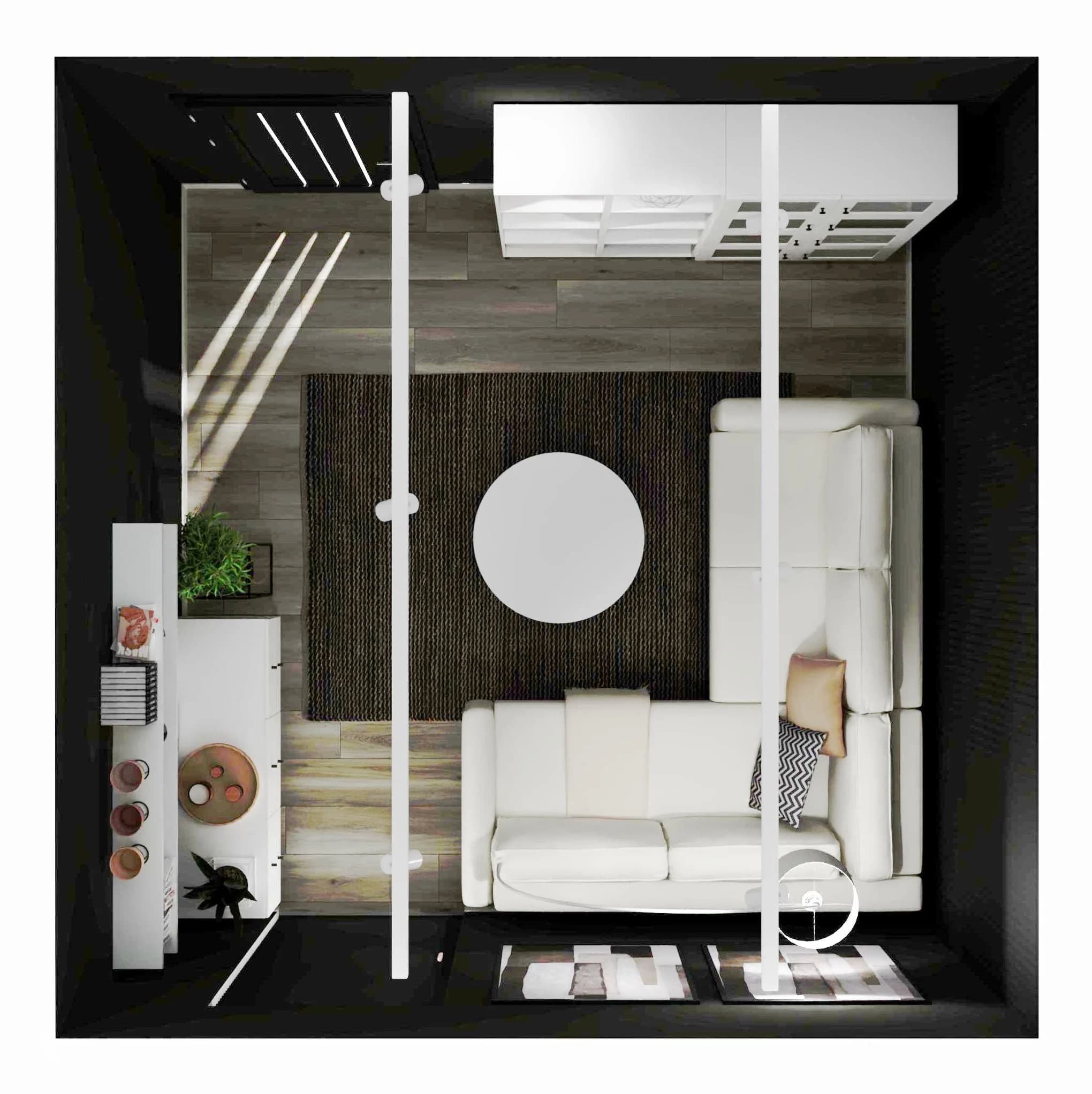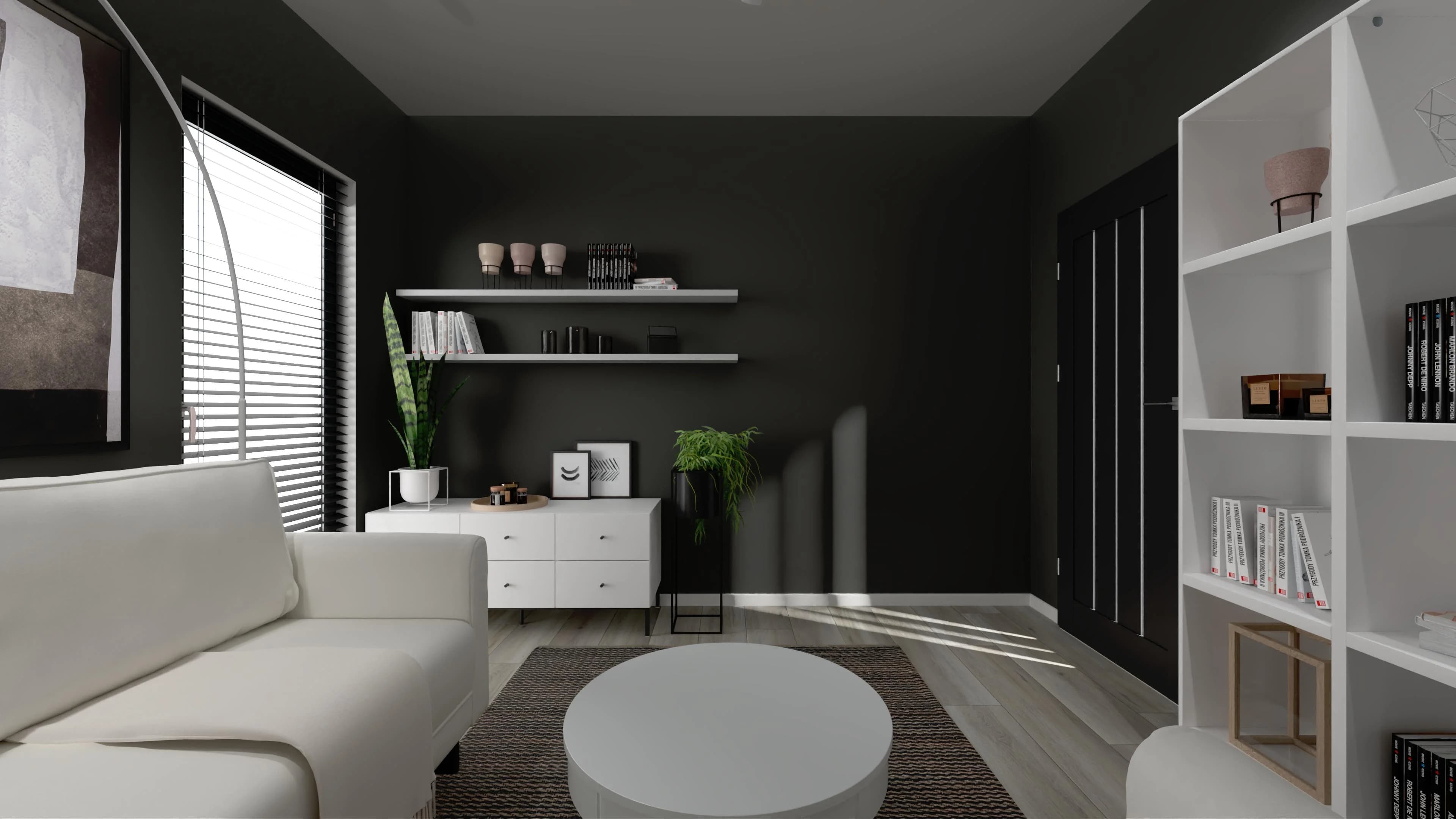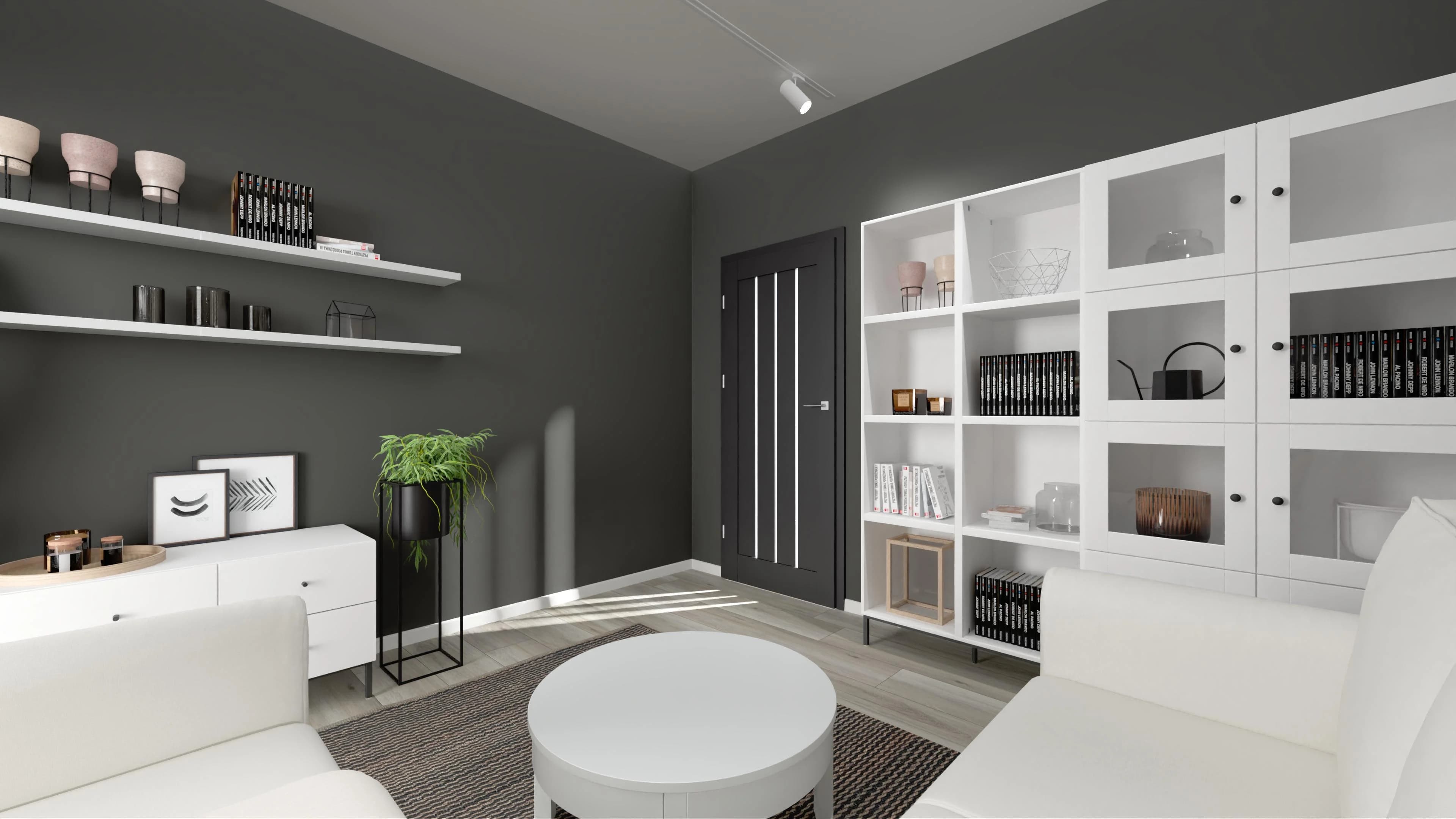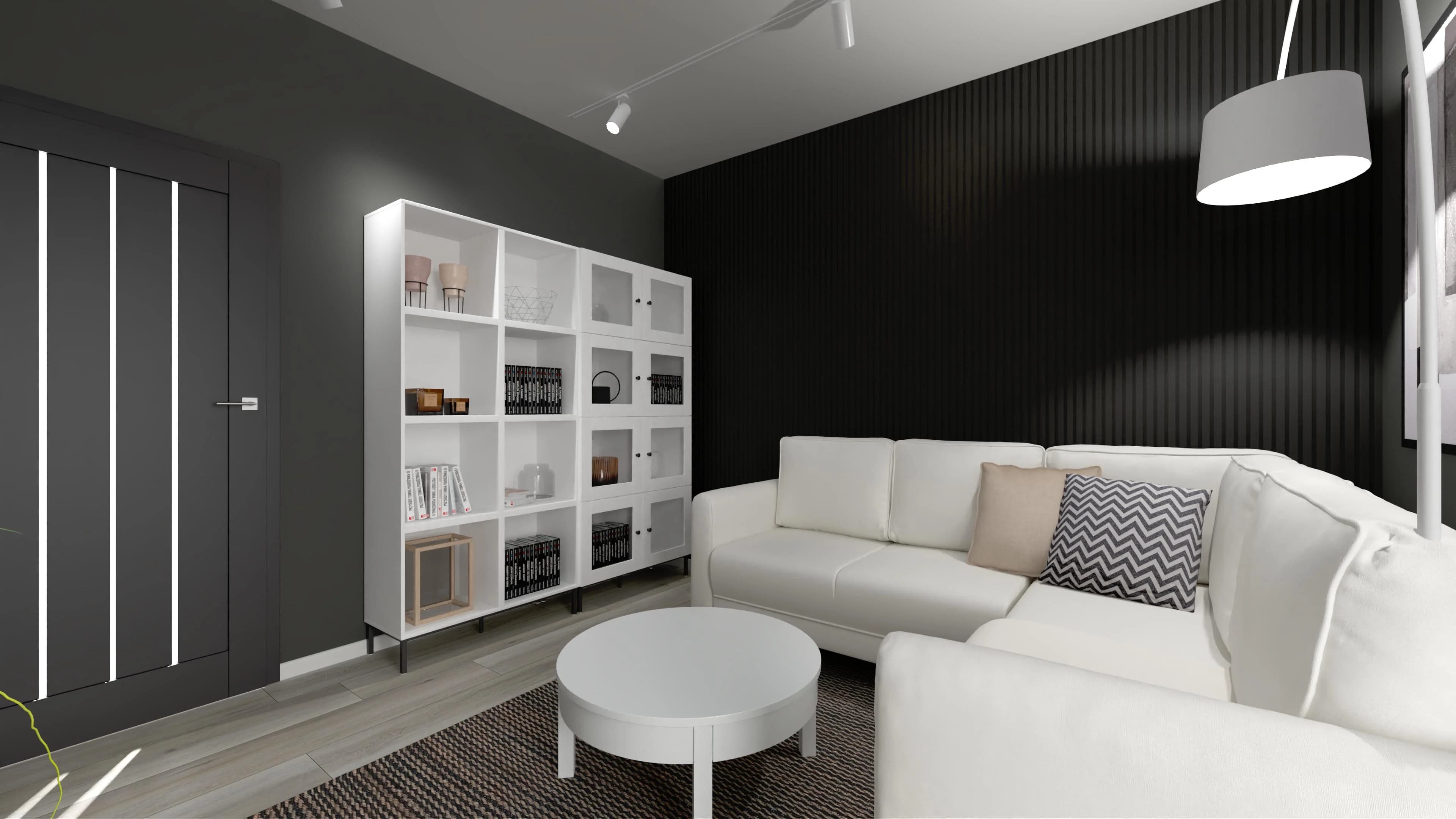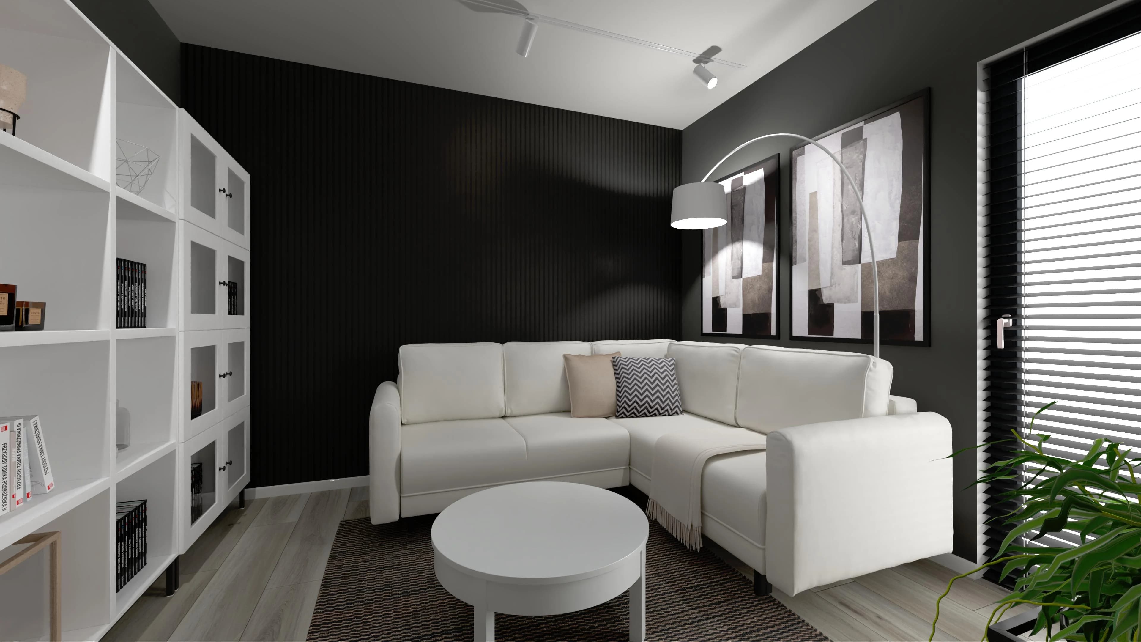 This is a living room where the contrast of black and white plays first fiddle. Dark walls and decorative laths form the backdrop for the snow-white bookcases and chests of drawers that organise the space. The focal point of the interior is a large corner sofa with a coffee table. A soft carpet wraps the space and keeps the living room cosy despite the monochrome colours.