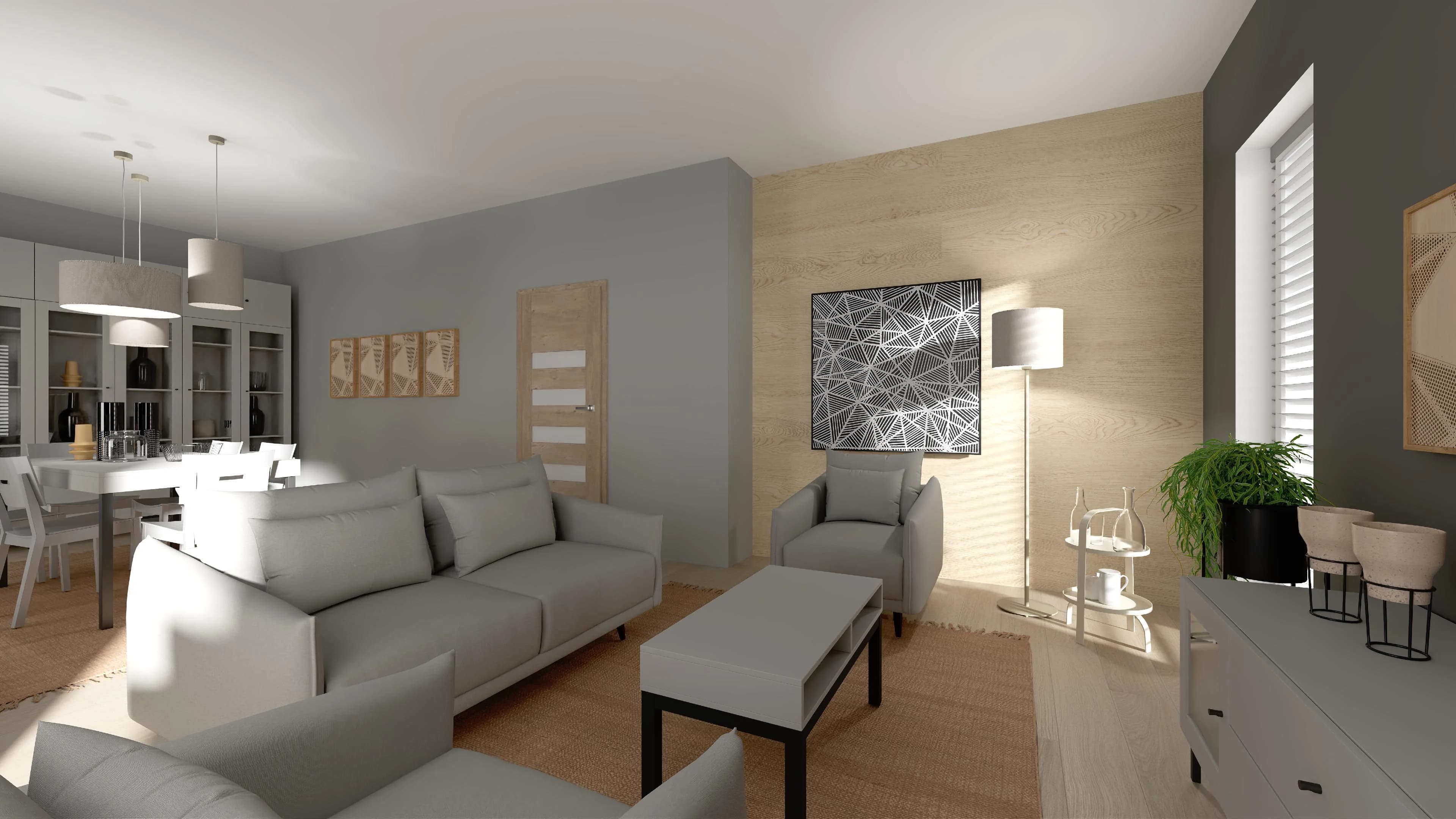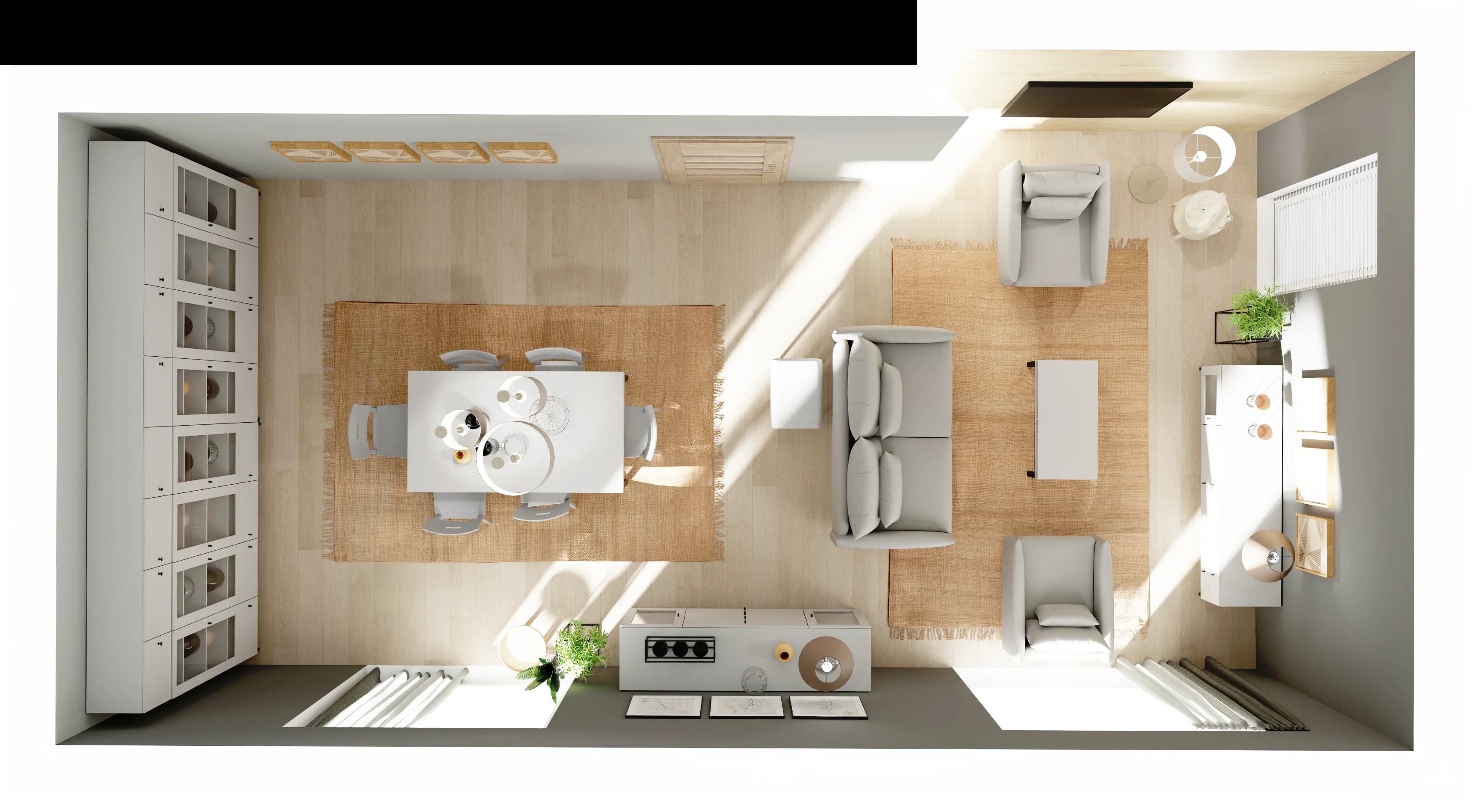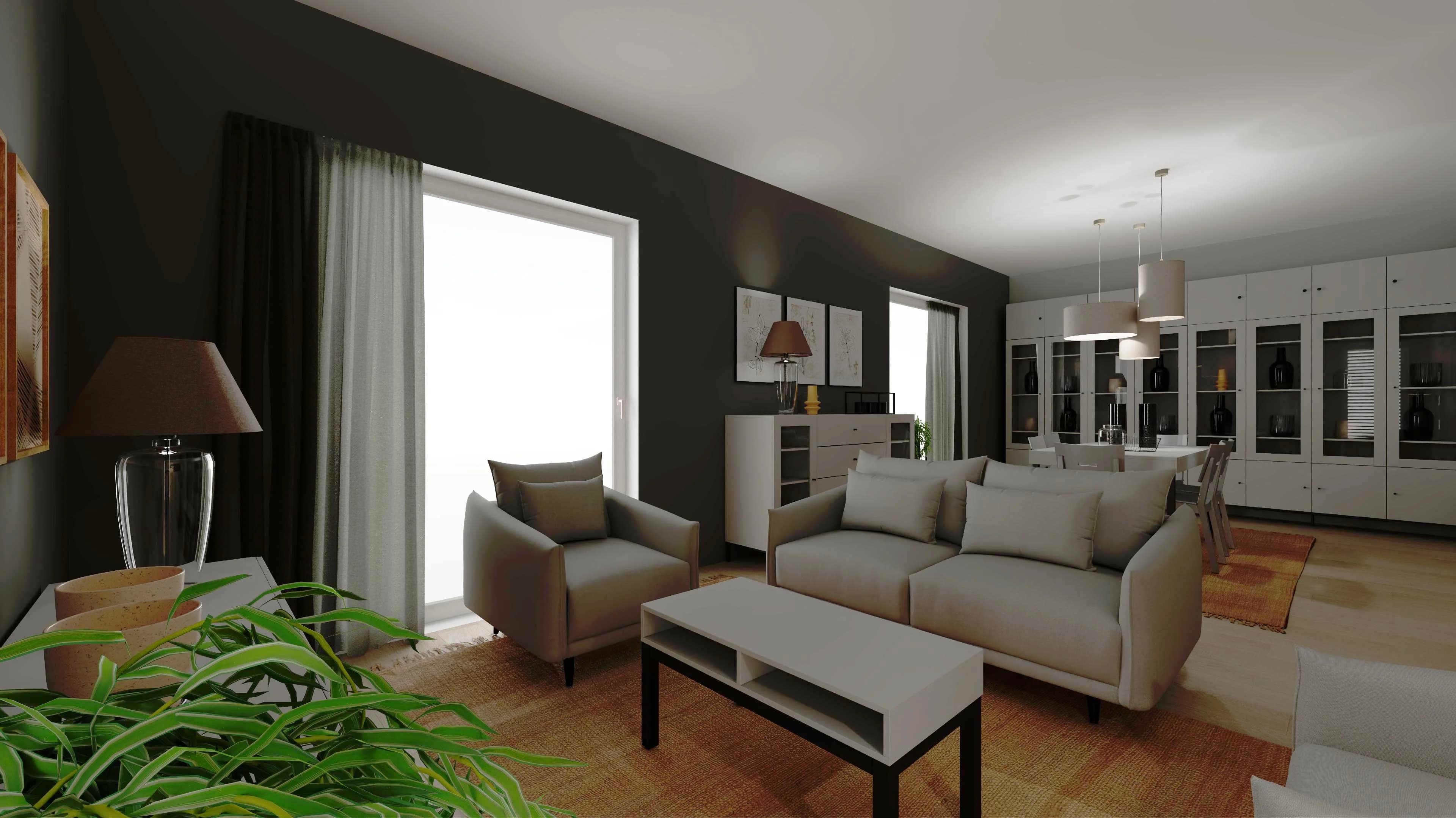 The spacious interior has been divided into a relaxation and communal dining area. The large table can accommodate the whole family and guests. Elegant display cases can showcase crockery and souvenirs from travels. Moments of serenity are provided by comfortable lounge furniture and an accompanying coffee table. The warm colour scheme makes the interior feel cosy.