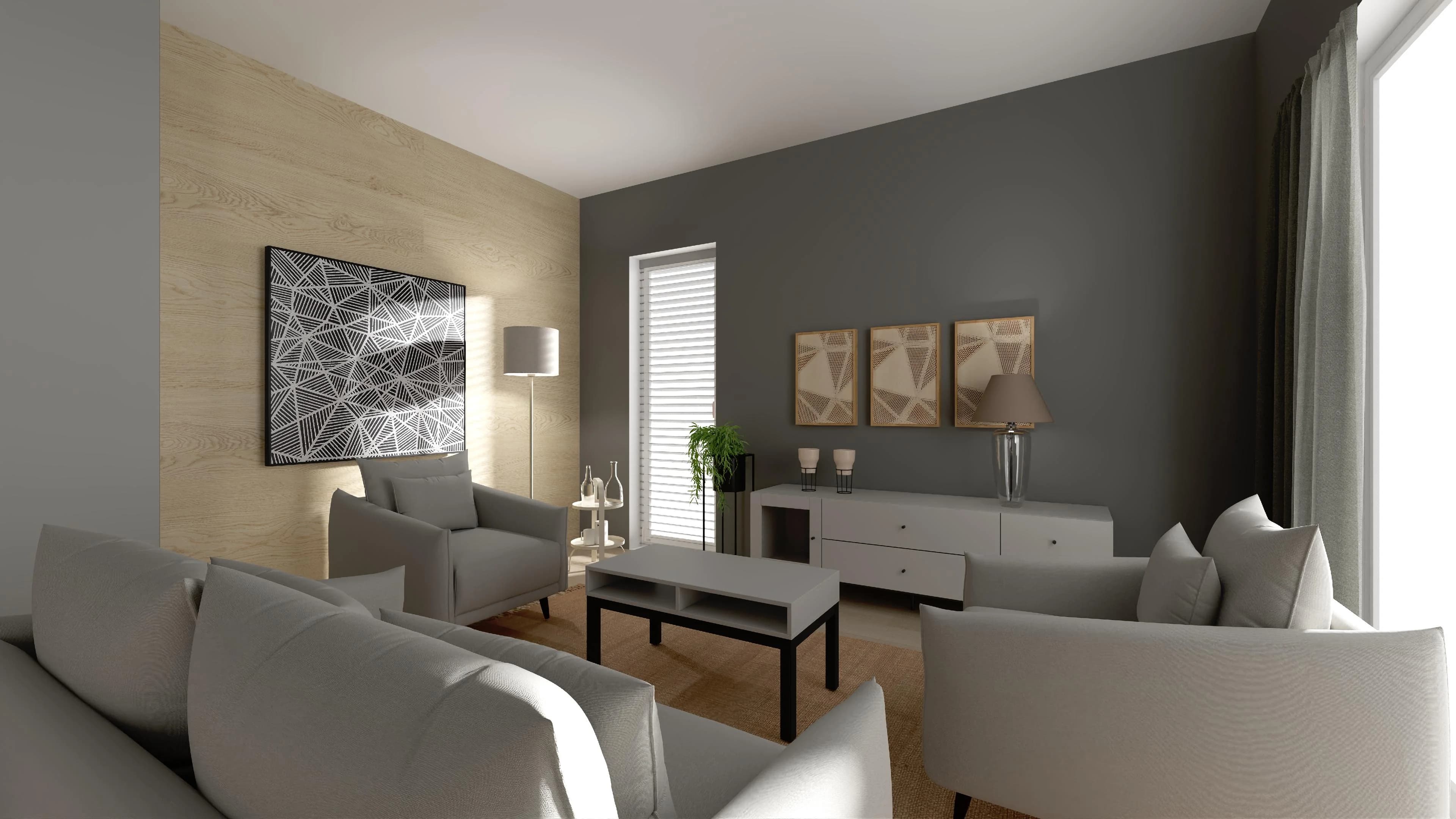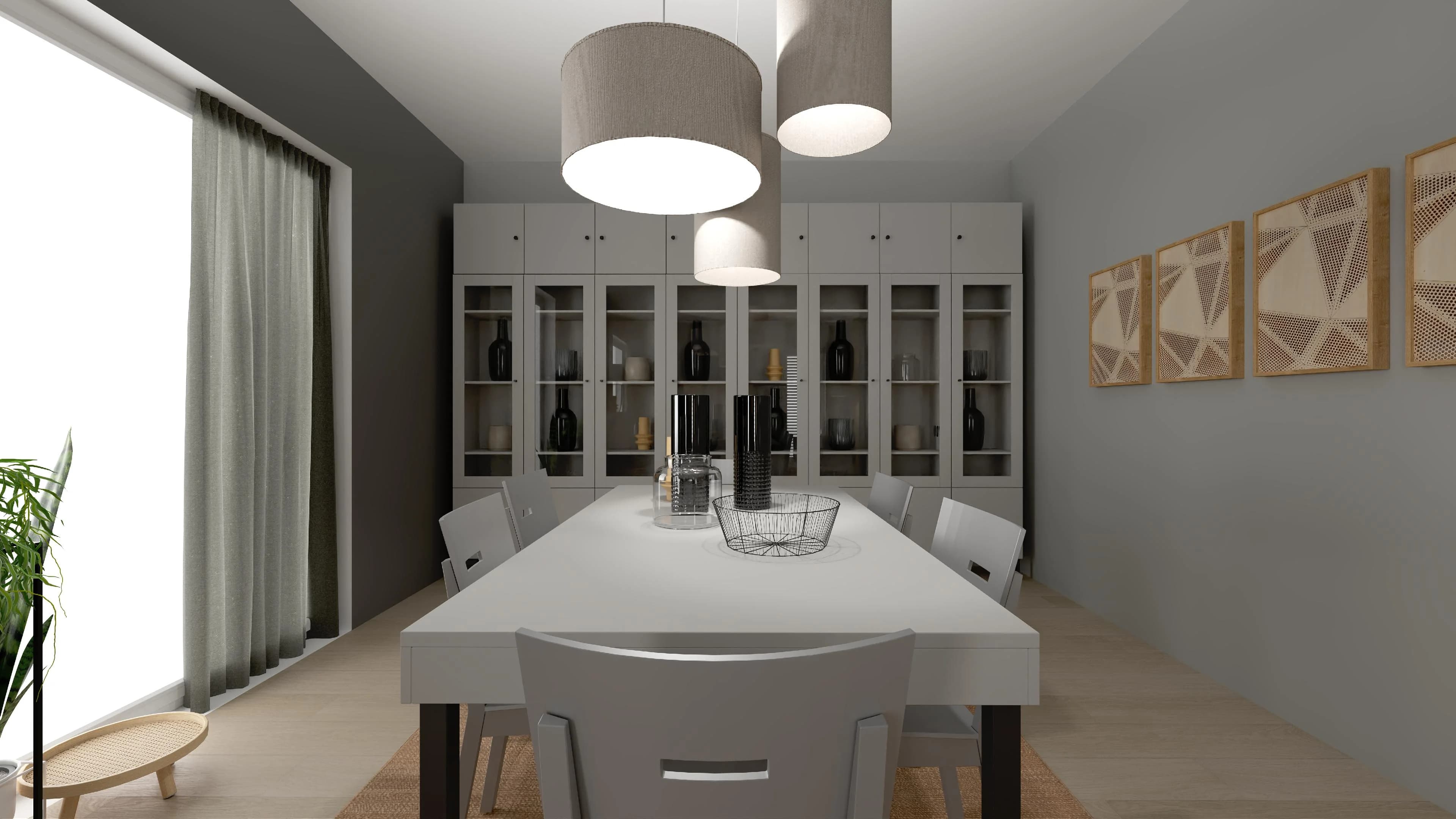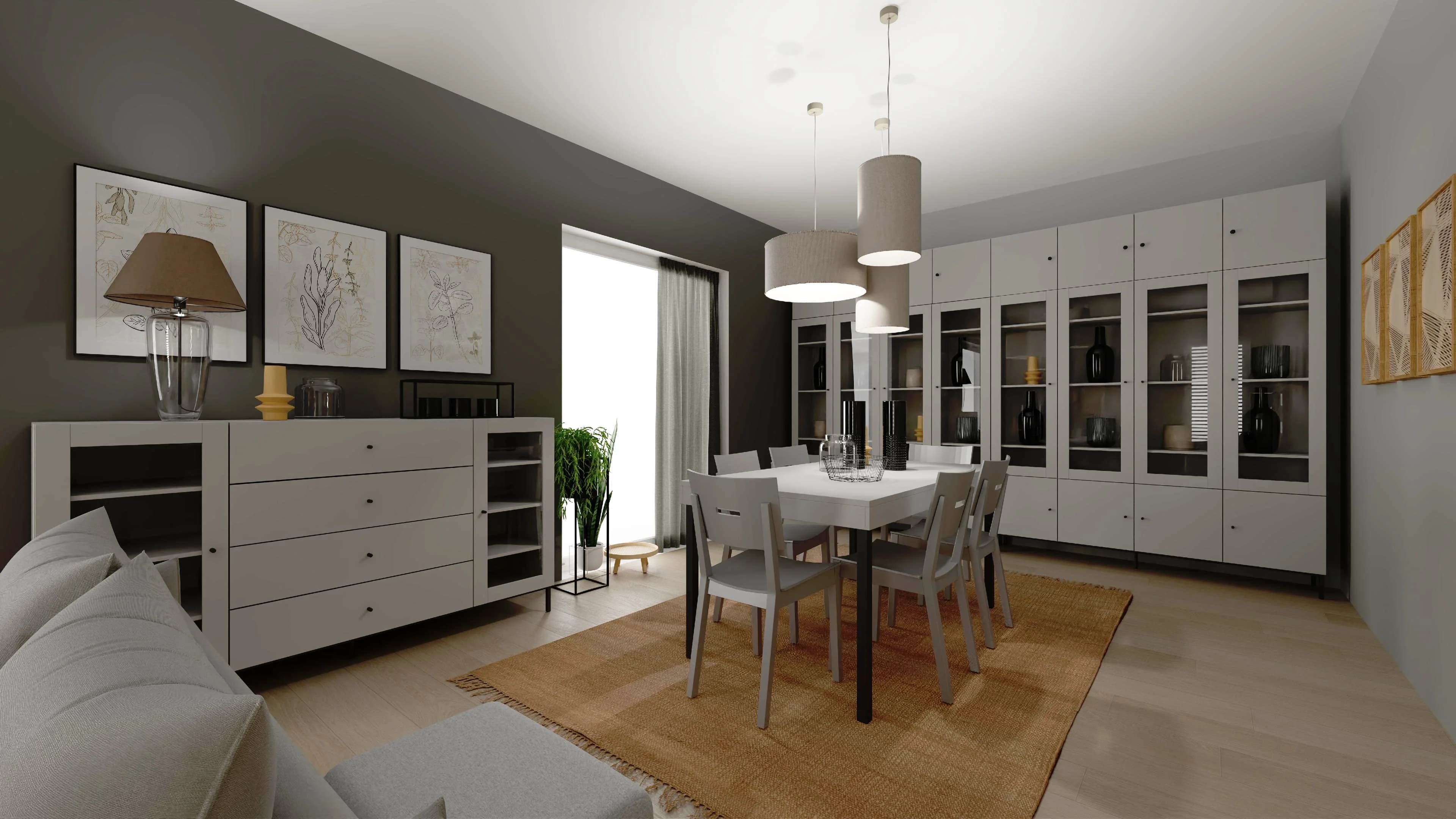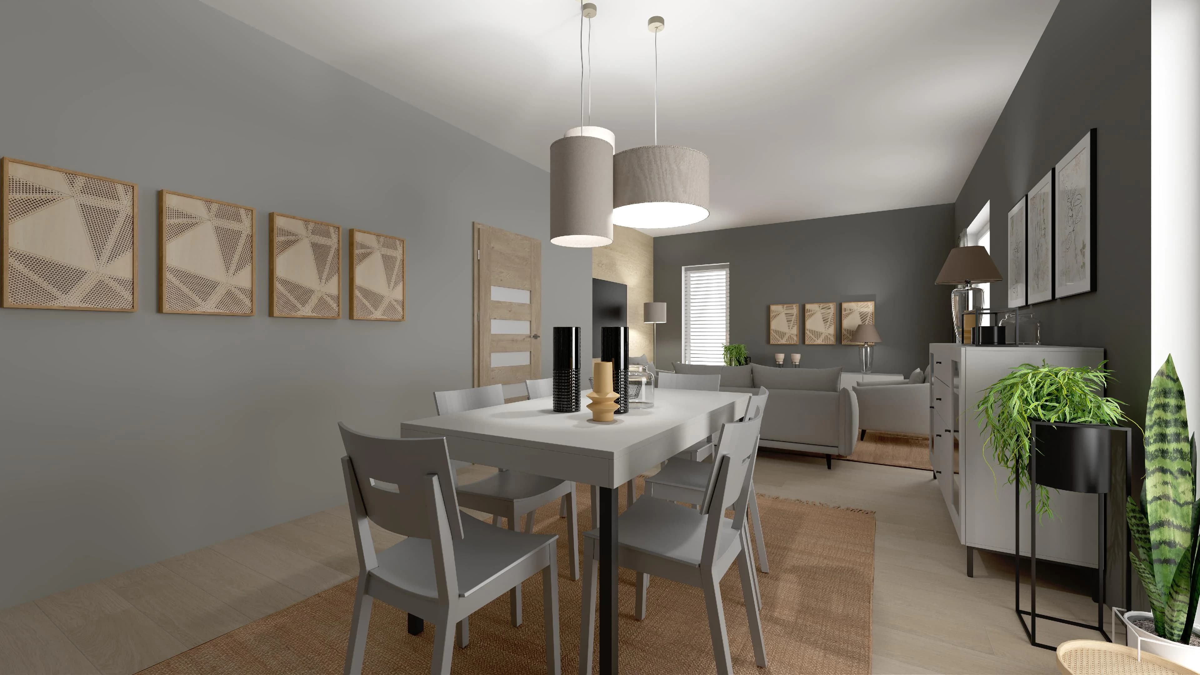 The spacious interior has been divided into a relaxation and communal dining area. The large table can accommodate the whole family and guests. Elegant display cases can showcase crockery and souvenirs from travels. Moments of serenity are provided by comfortable lounge furniture and an accompanying coffee table. The warm colour scheme makes the interior feel cosy.