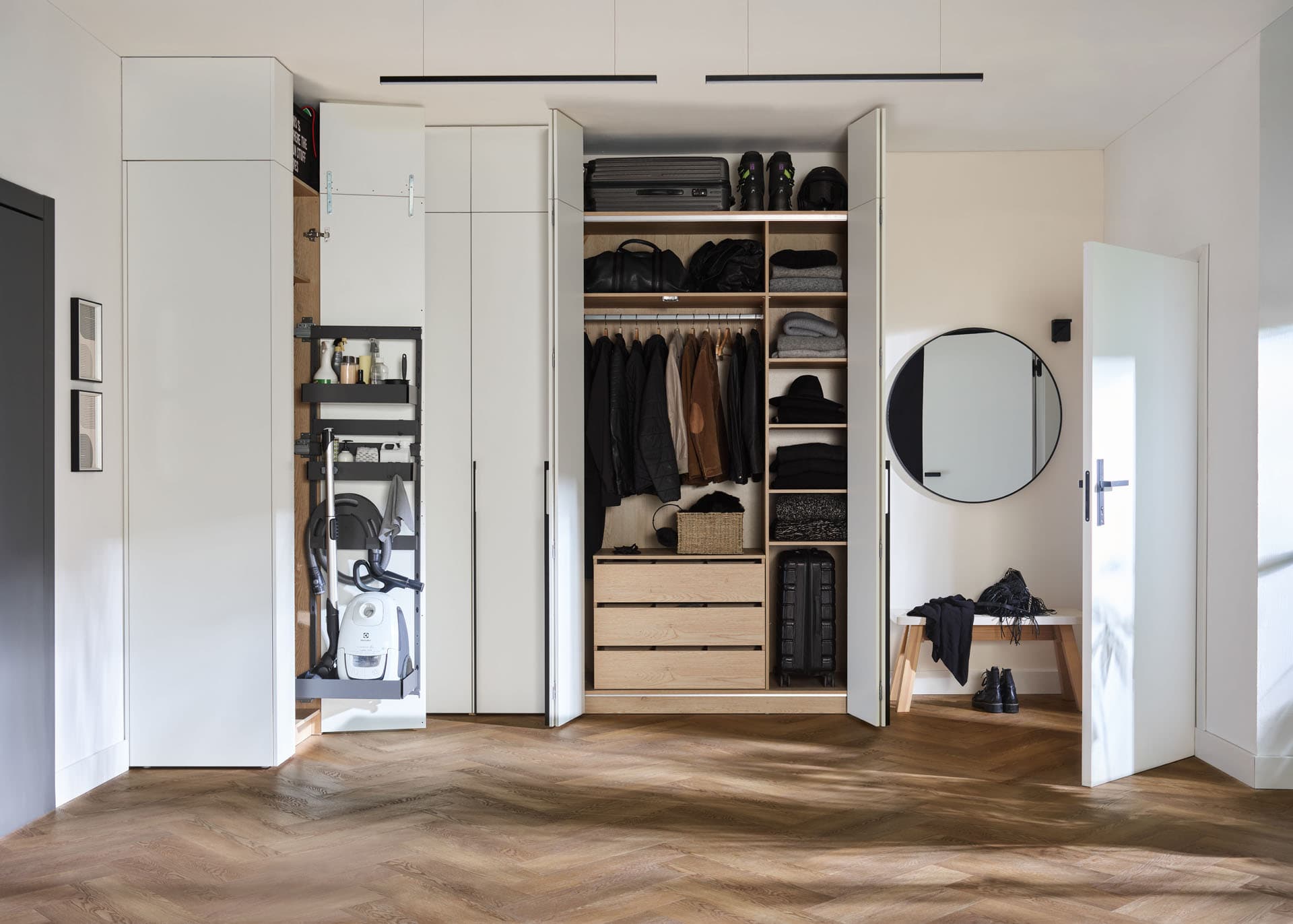 A utility closet with a pull-out cargo basket is a practical solution for organizing tall and hard-to-store items in a closet. It facilitates storage by providing quick and full access to the entire contents of the wardrobe. The wardrobe with a cargo basket will prove useful as a stand-alone unit or as part of a larger custom-made wardrobe. The pull-out cargo mechanism allows you to comfortably reach for stored items, and the well-thought-out arrangement of baskets makes it easier to maintain daily order and good organization of the interior.