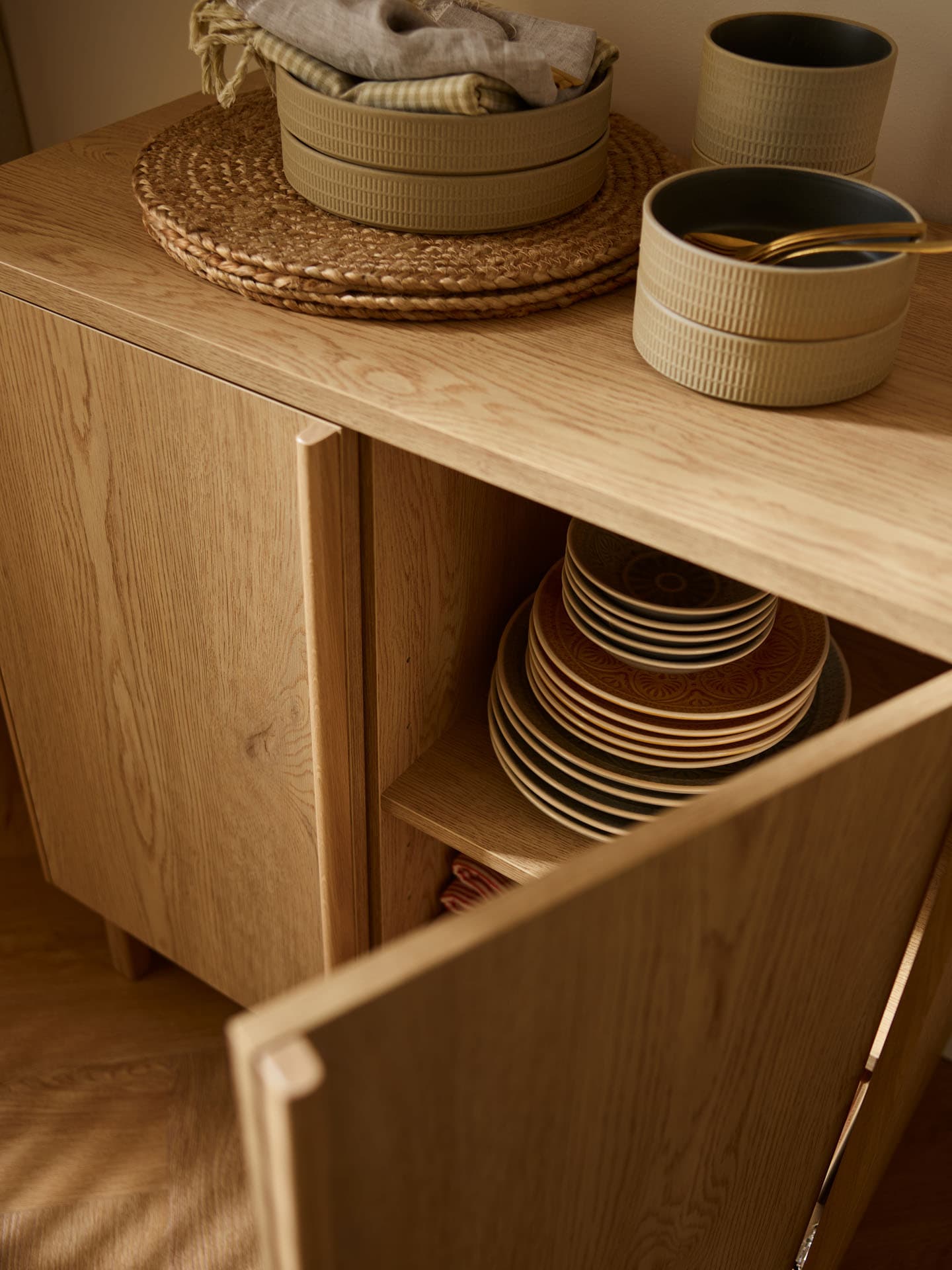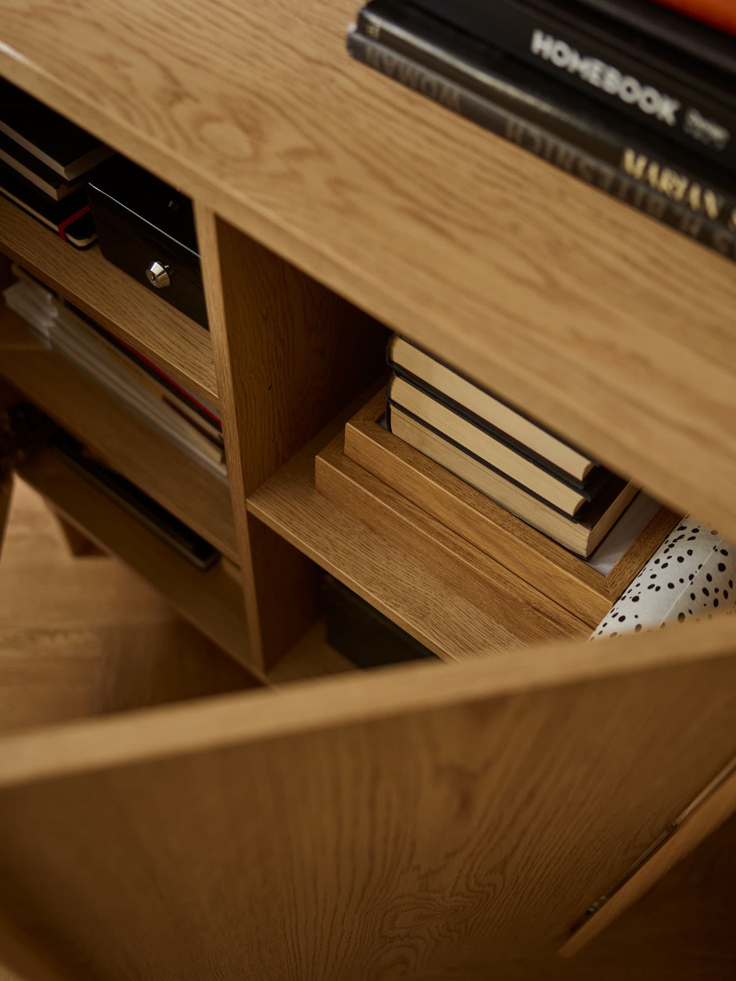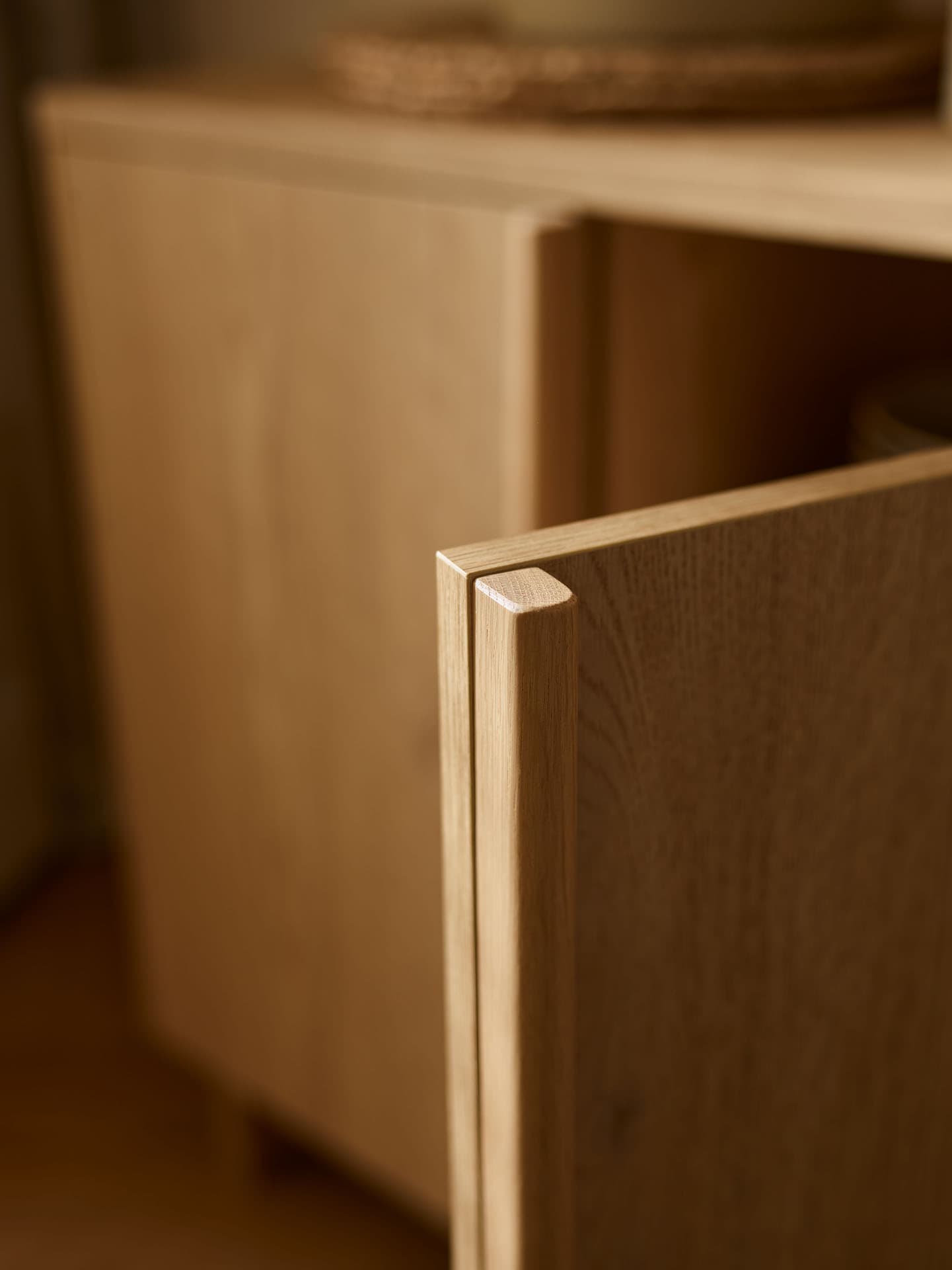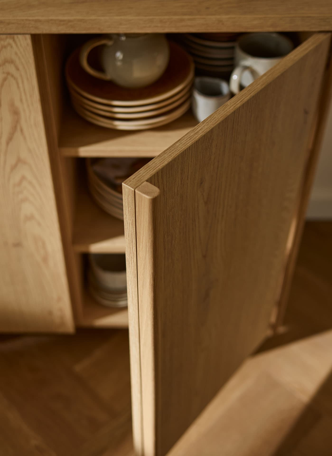 - The rounded tops and wooden dovetailed sides made of solid oak subtly soften the geometry of the furniture, emphasizing its calm, timeless character.