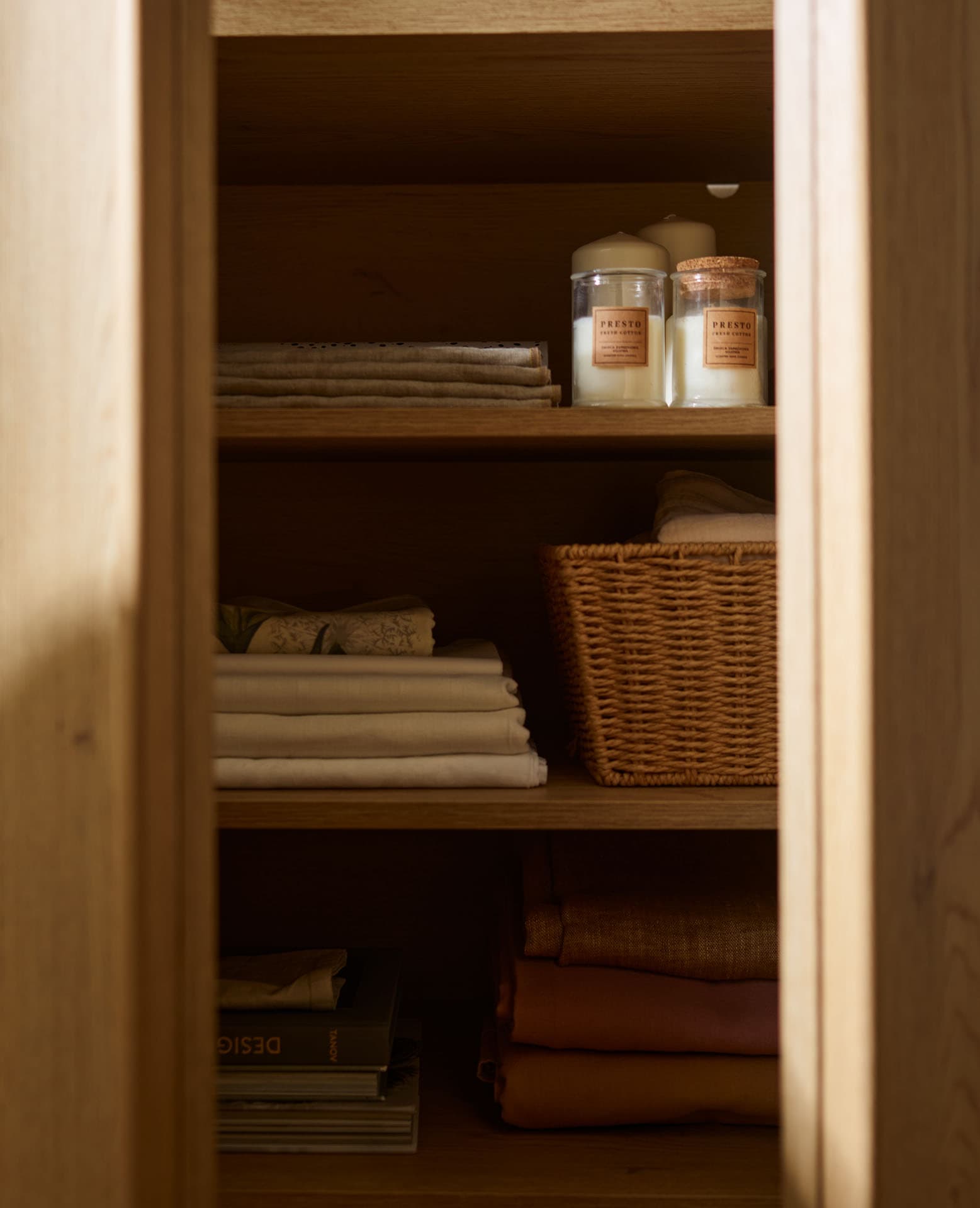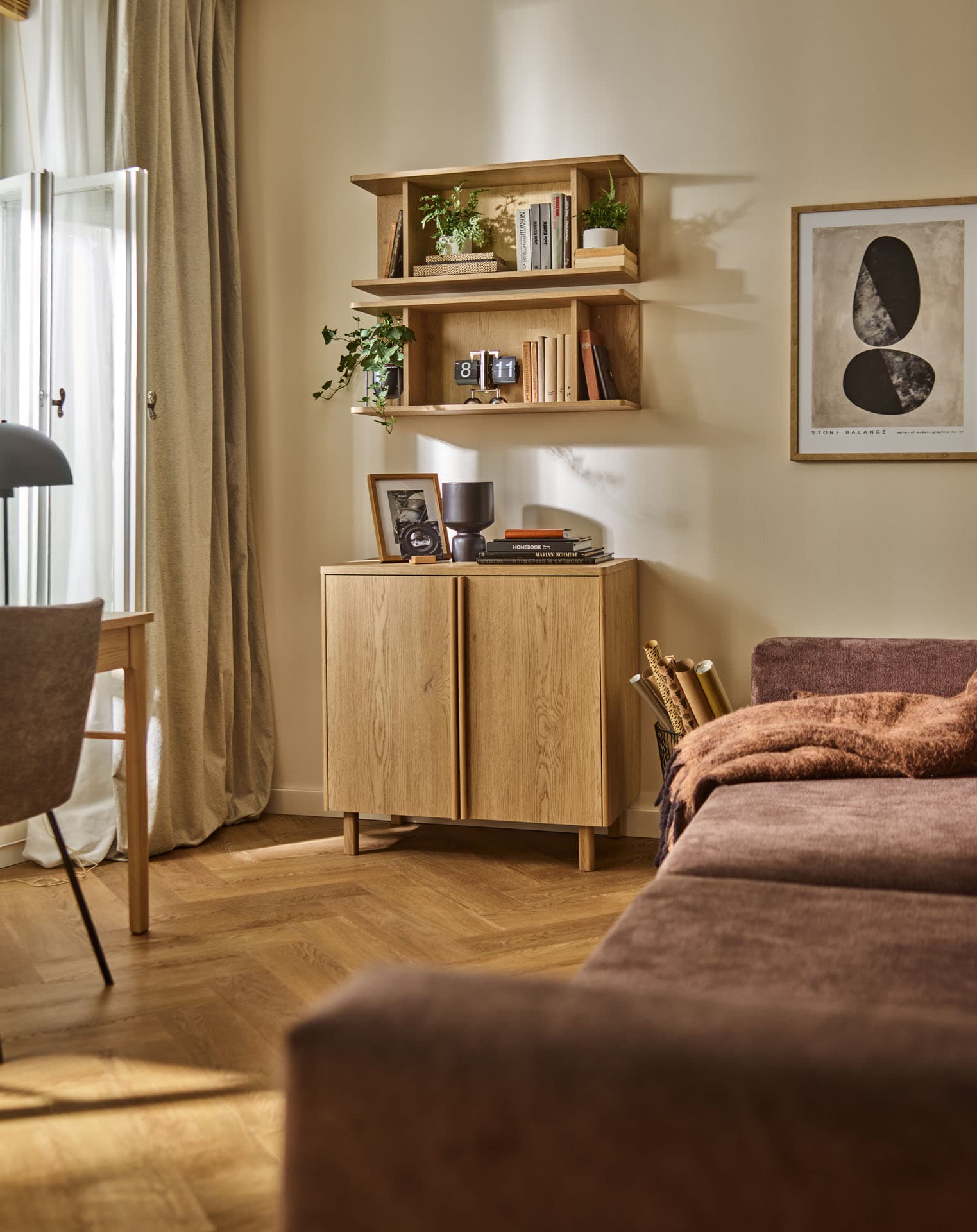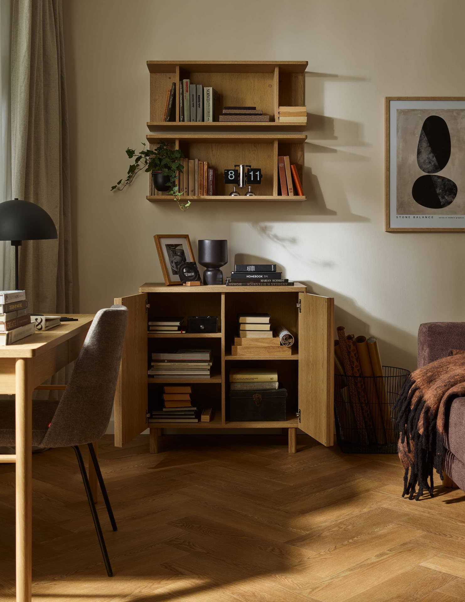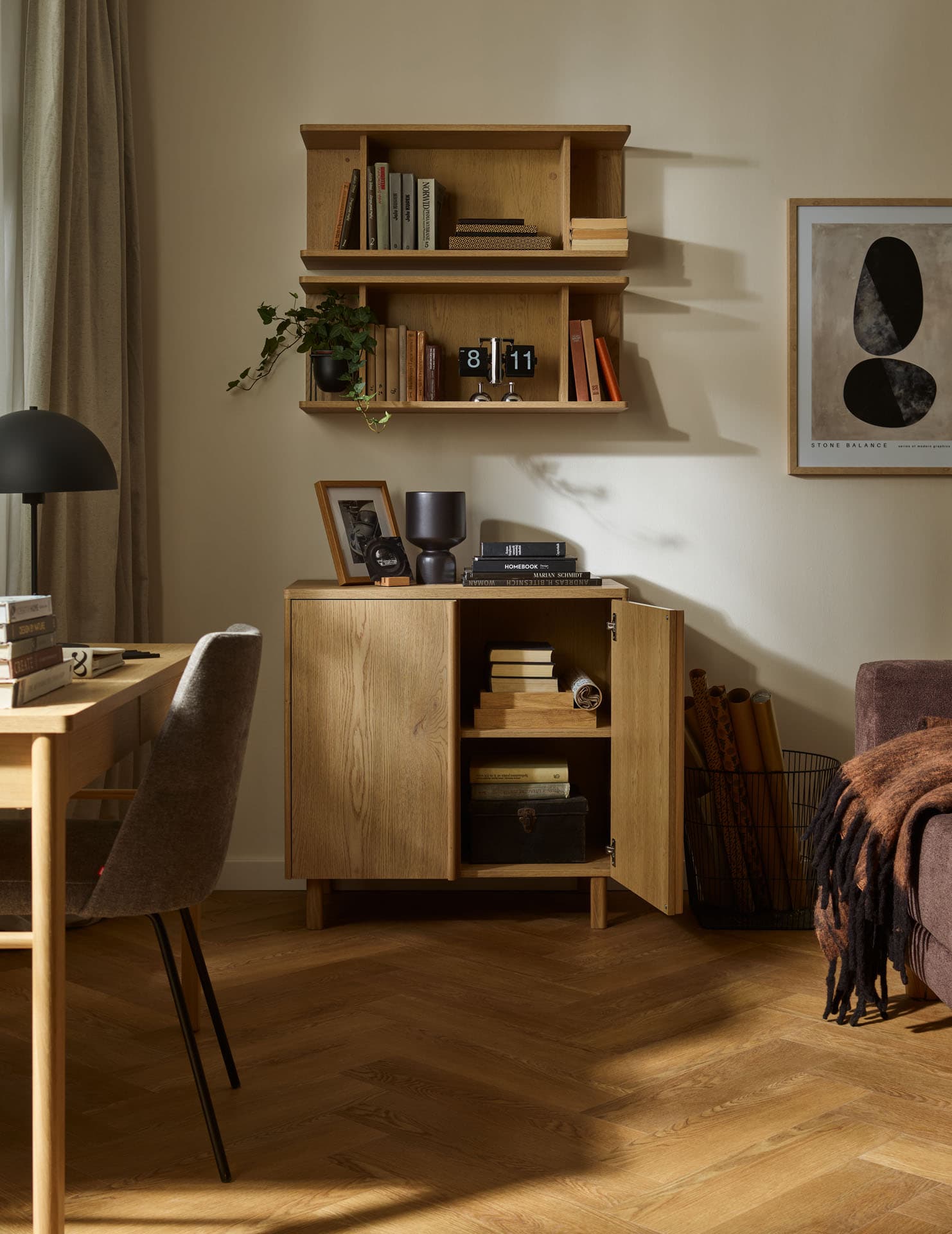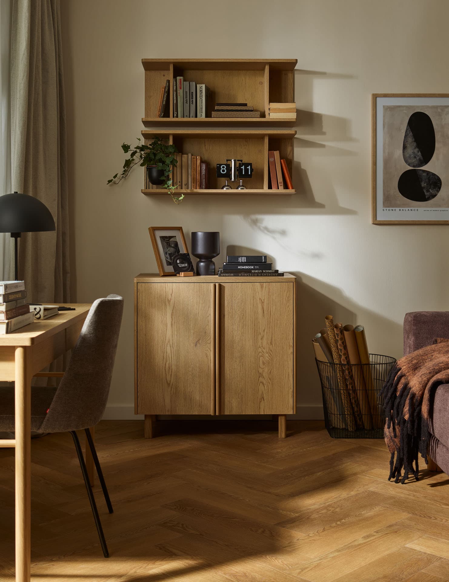 - The rounded tops and wooden dovetailed sides made of solid oak subtly soften the geometry of the furniture, emphasizing its calm, timeless character.