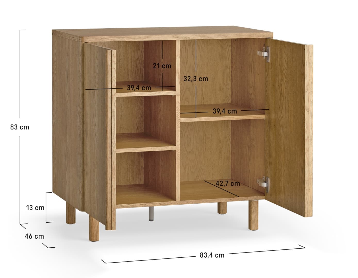 - On the left side there are 2 adjustable shelves, and on the right 1 shelf also adjustable in height, which allows you to flexibly adjust the interior to the contents you store - from documents and books to dishes or home textiles. The well-thought-out layout promotes organization and makes it easy to stay organized without excess form.