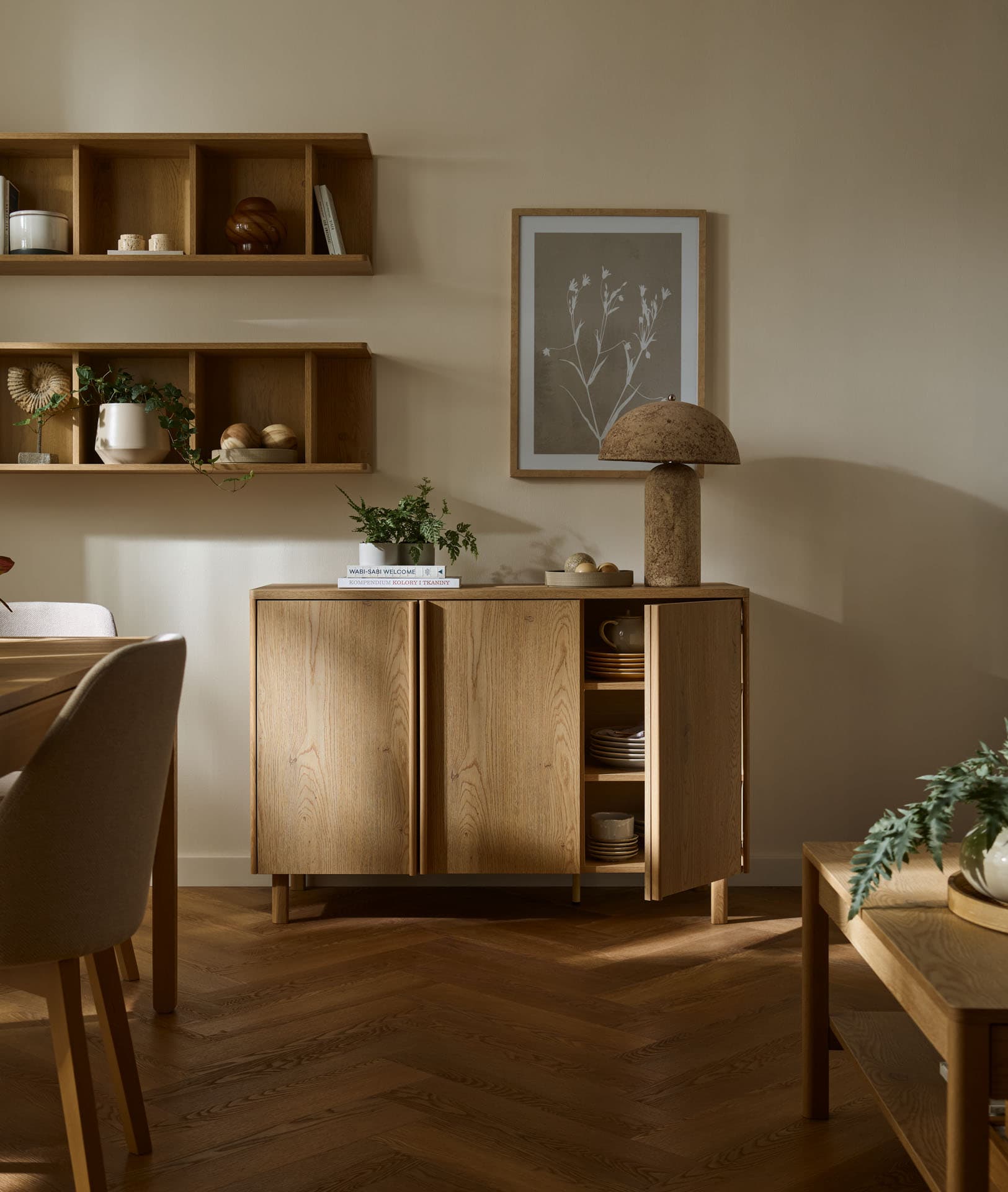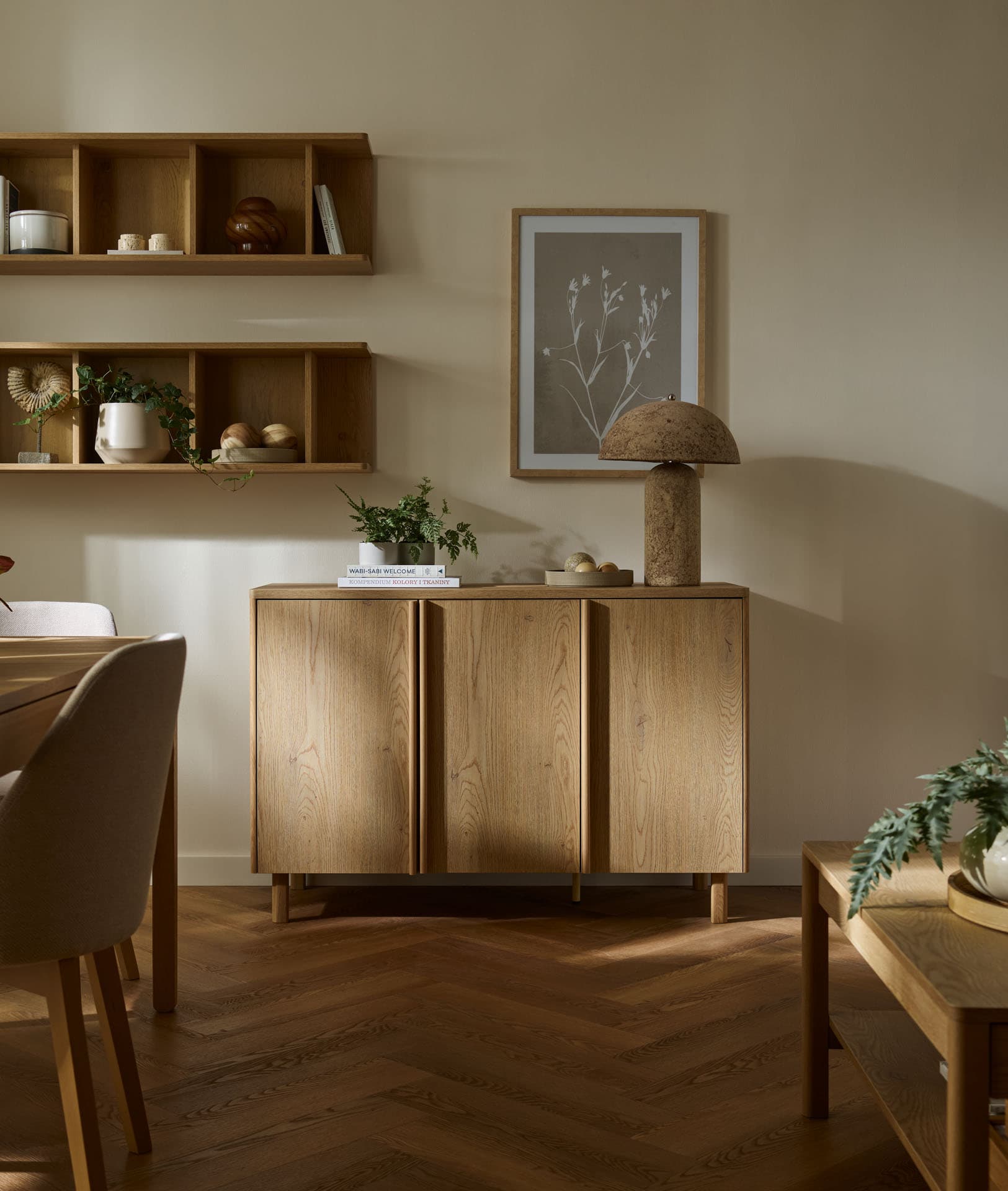 Well 3-door chest of drawers brings peace, harmony and a sense of well-planned everyday life to the interior. Its form is based on soft lines and balanced proportions. A stable solid with a well-planned interior will organize the space and at the same time will be a natural, warm point of the arrangement.