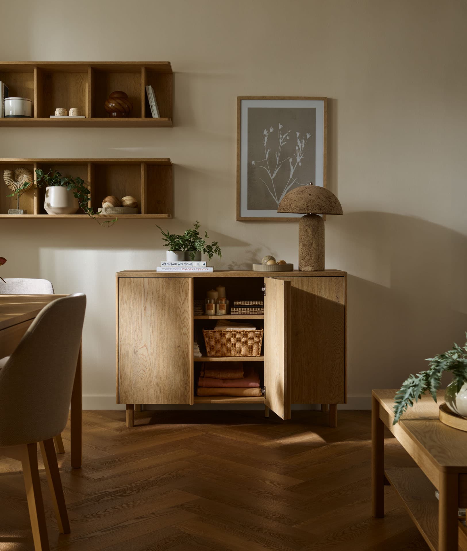 Furniture from the Well collection is in the same color as the oak Stor wardrobes. This is ideal if you want to complement your arrangement with elements from another series, while keeping the identical shade and texture of the material.