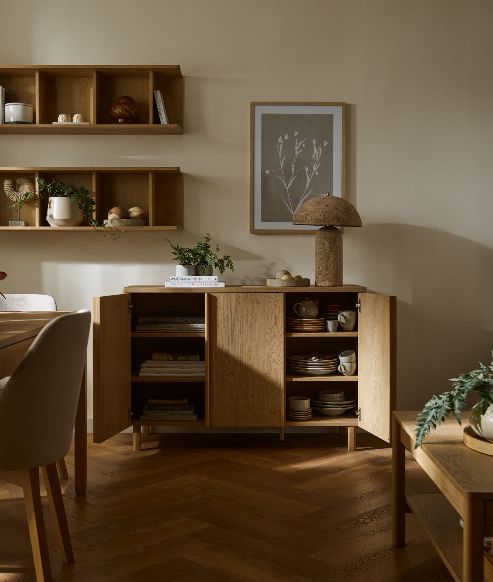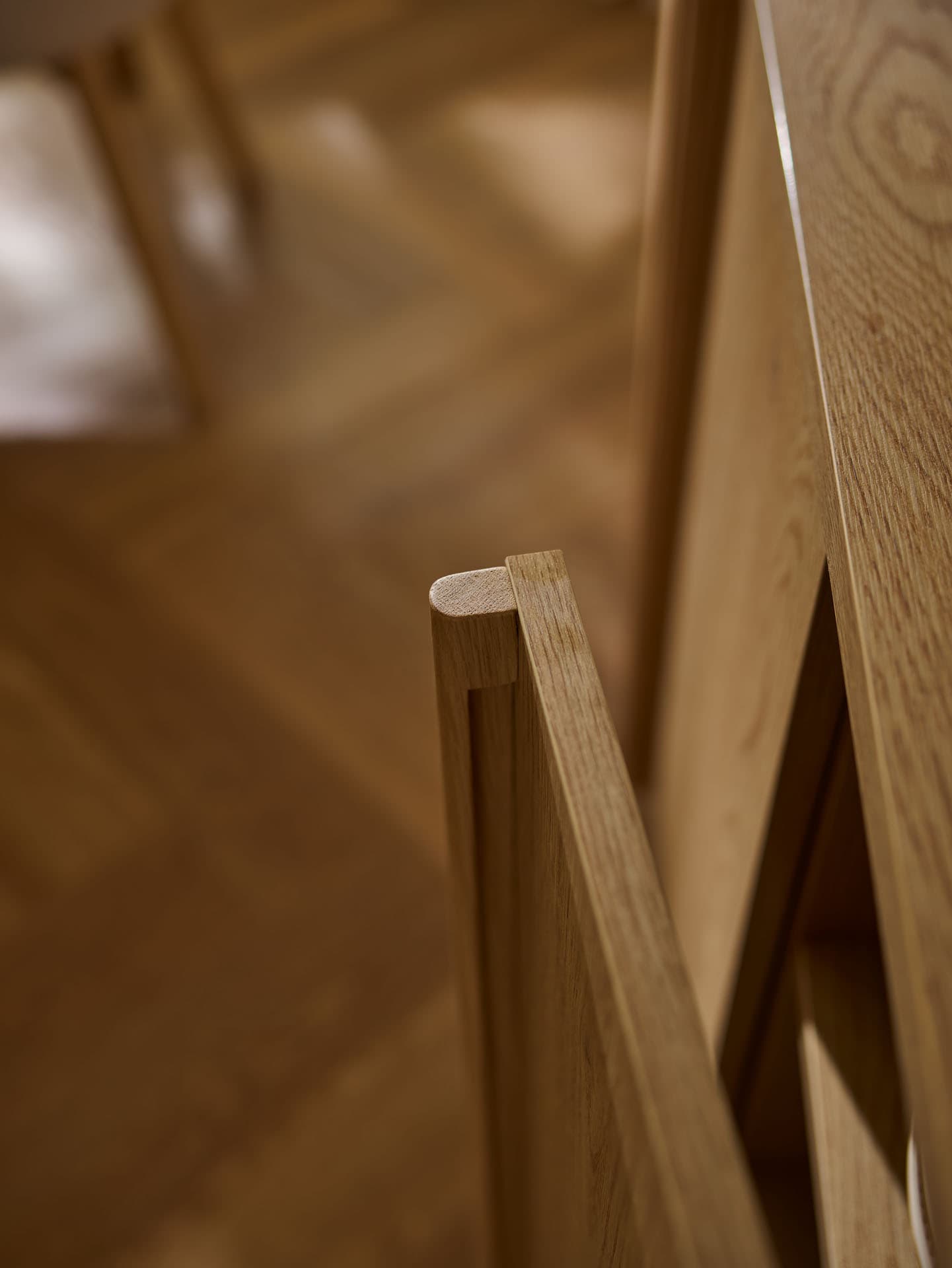 - The rounded tops and wooden dovetailed sides made of solid oak subtly soften the geometry of the furniture, emphasizing its calm, timeless character.