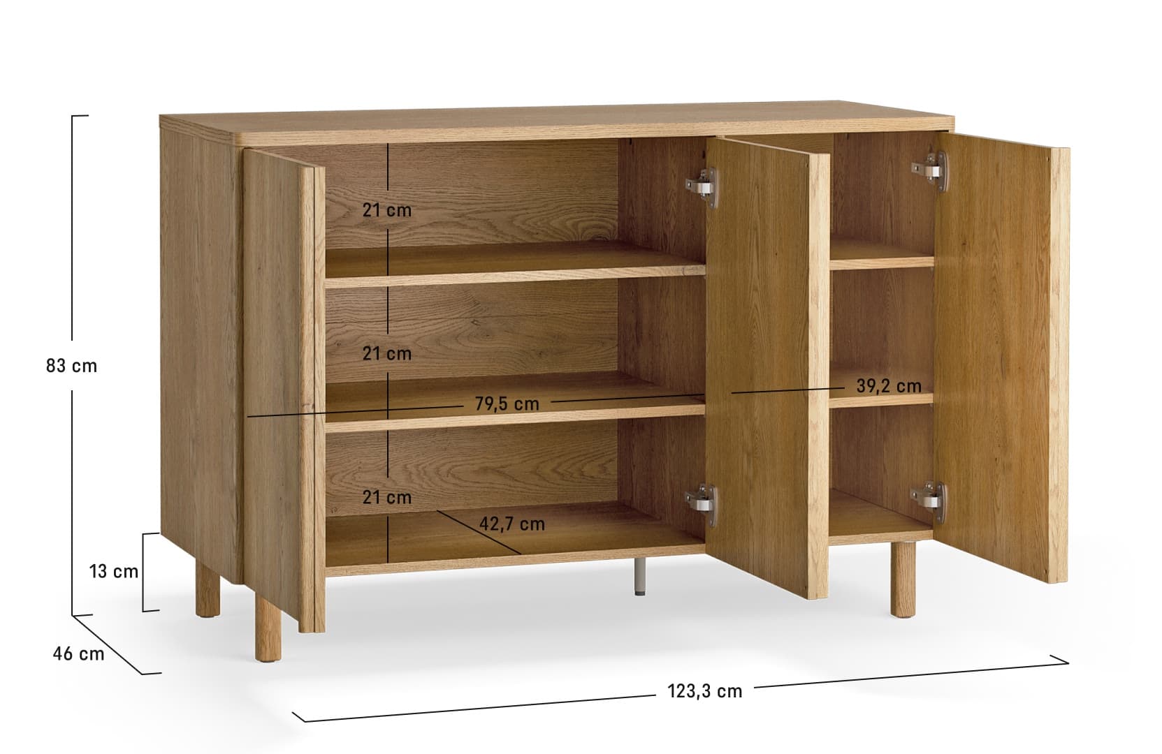 - The interior of the dresser was designed with order and flexibility in mind. Behind the three doors there are reliable slides with a silent closing mechanism, which ensures comfortable and smooth opening.