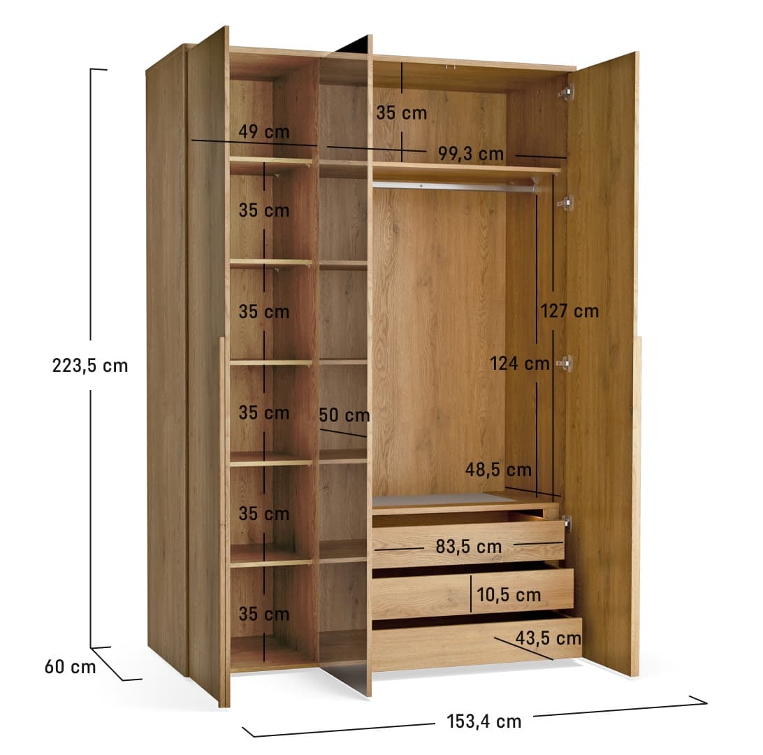 The 3-door wardrobe with mirror and lighting from the Well collection is a functional, capacious storage piece of simple form with natural wood details. Thoughtful division of the interior makes it easy to organize clothes and accessories, and integrated lighting makes the wardrobe more convenient for everyday use. Mirrored doors introduce lightness and light, while allowing you to close the styling without leaving the room.