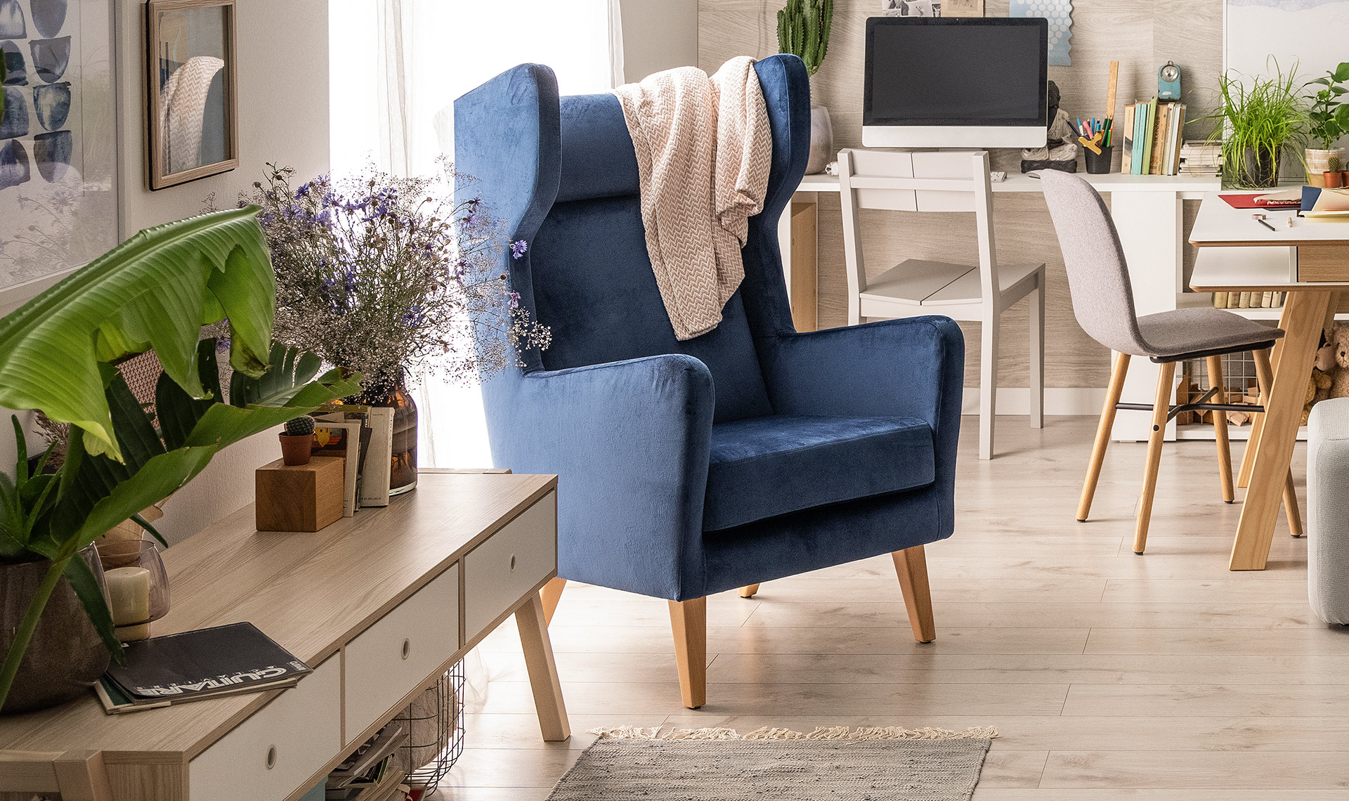 - The classic armchair is placed on 4 high legs, which make it light and make vacuuming easier. You can choose the finish of the legs from the following colors: wenge, dark brown, light brown, beech, black or white.