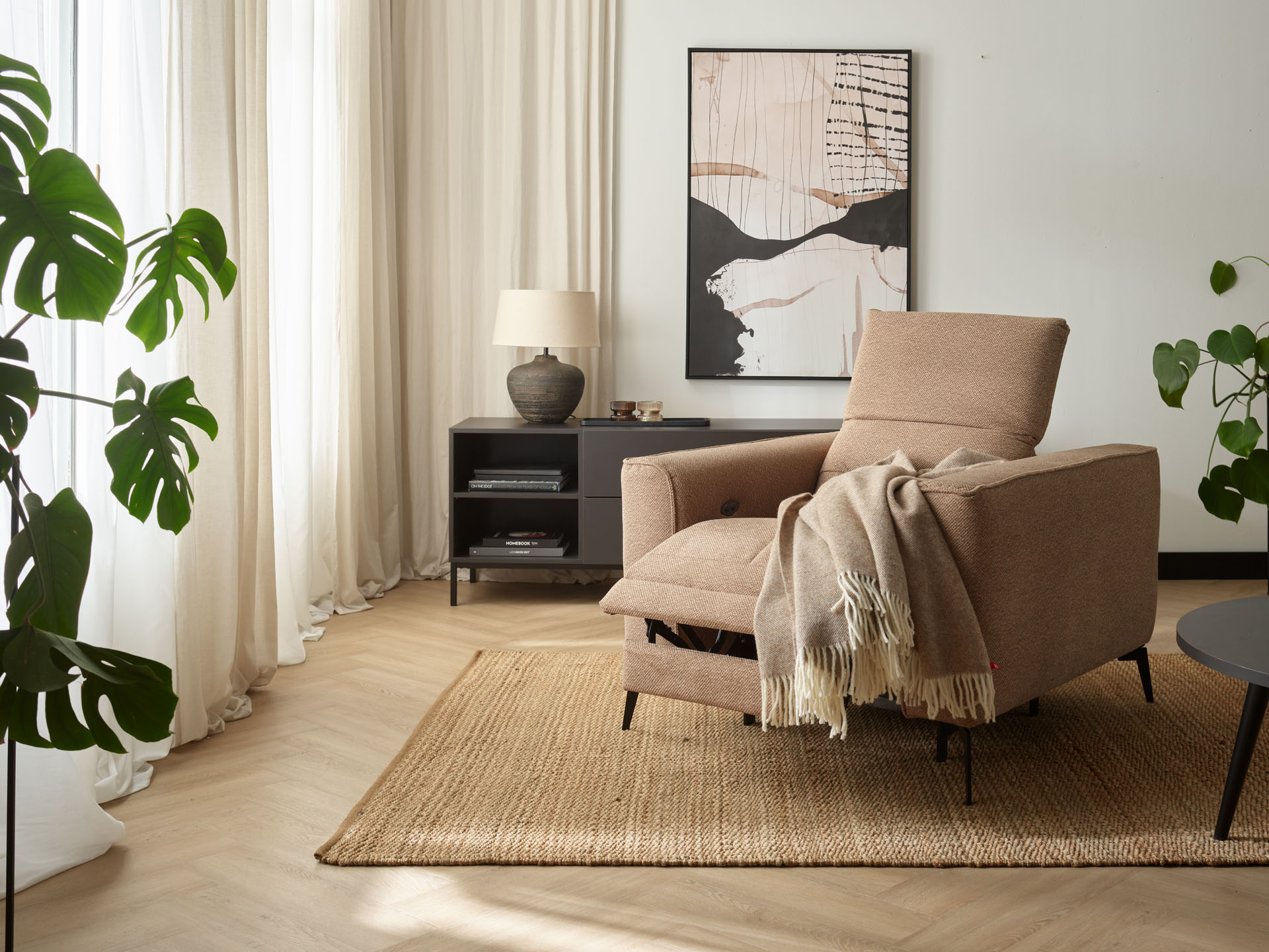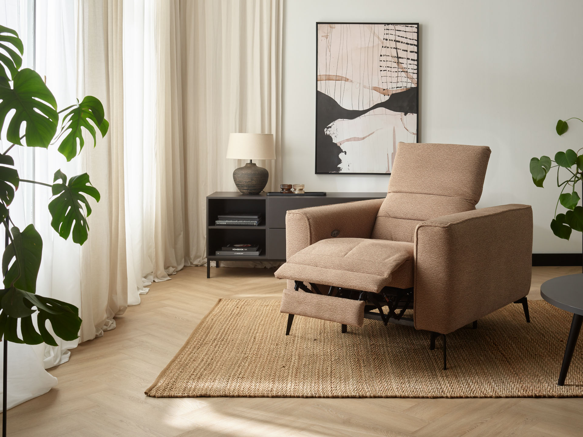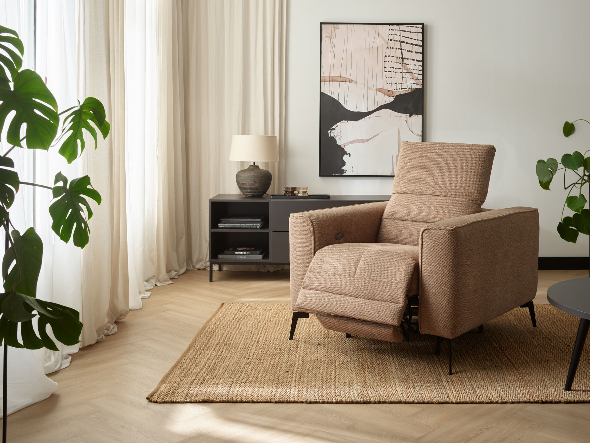 - When you change the position of the footrest, the position of the backrest also changes. A great advantage of the Motio armchair is that it can be placed in a horizontal position, ideal for an afternoon nap. Unfolding the furniture requires moving it slightly away from the wall.