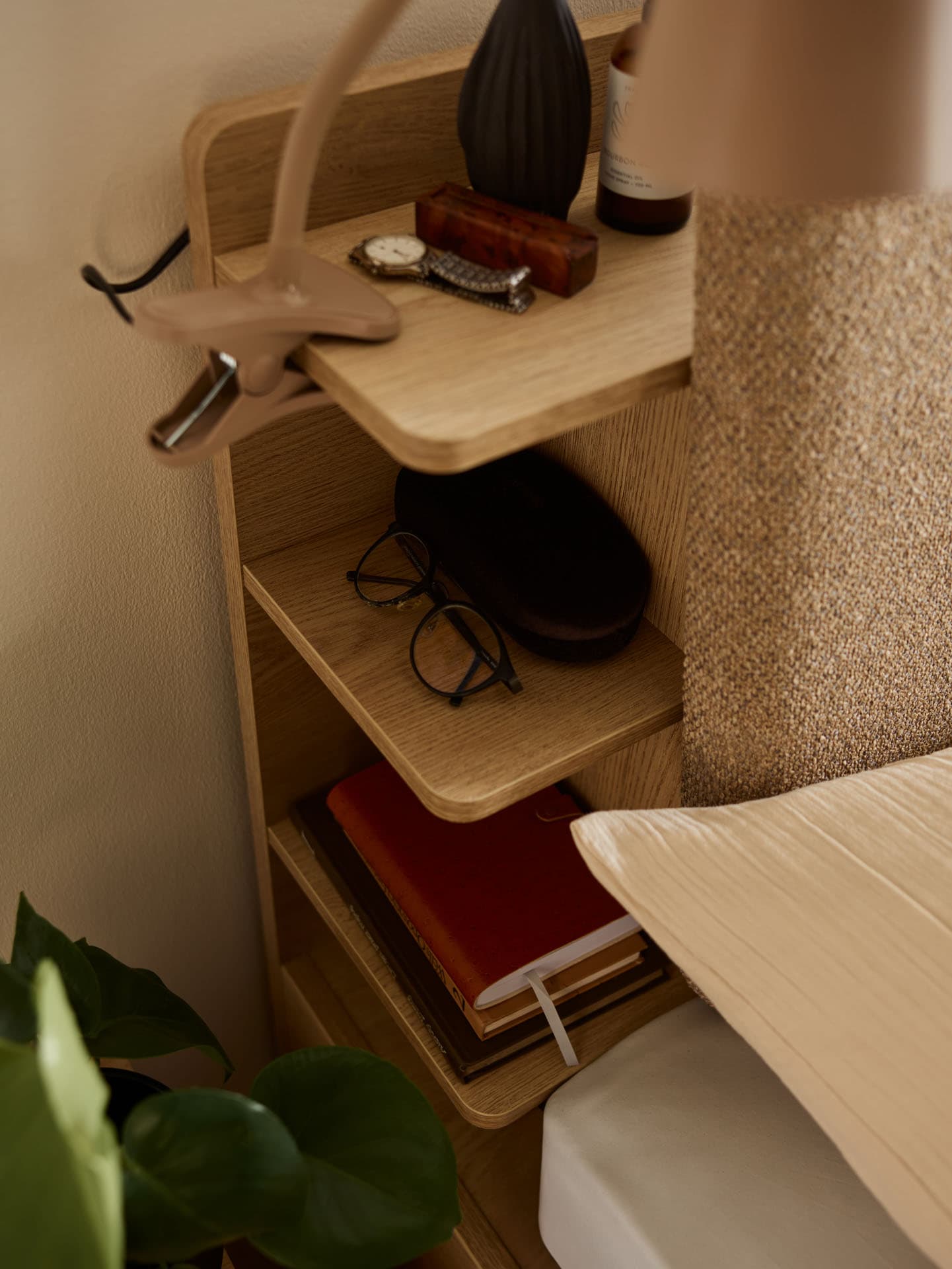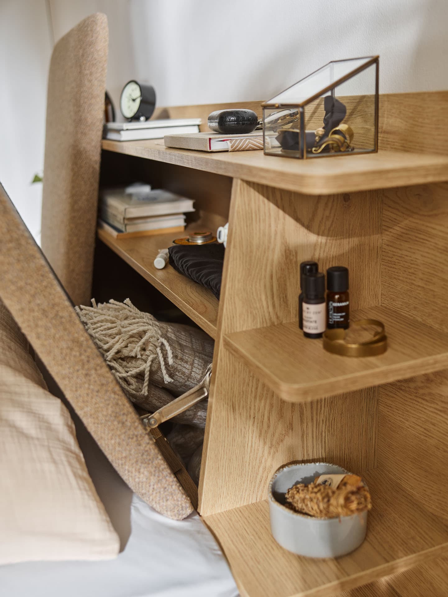 - Behind the two upholstered backrests, mounted independently vertically or horizontally, there is a container with a shelf, ideal for books, small accessories or items used just before bedtime.