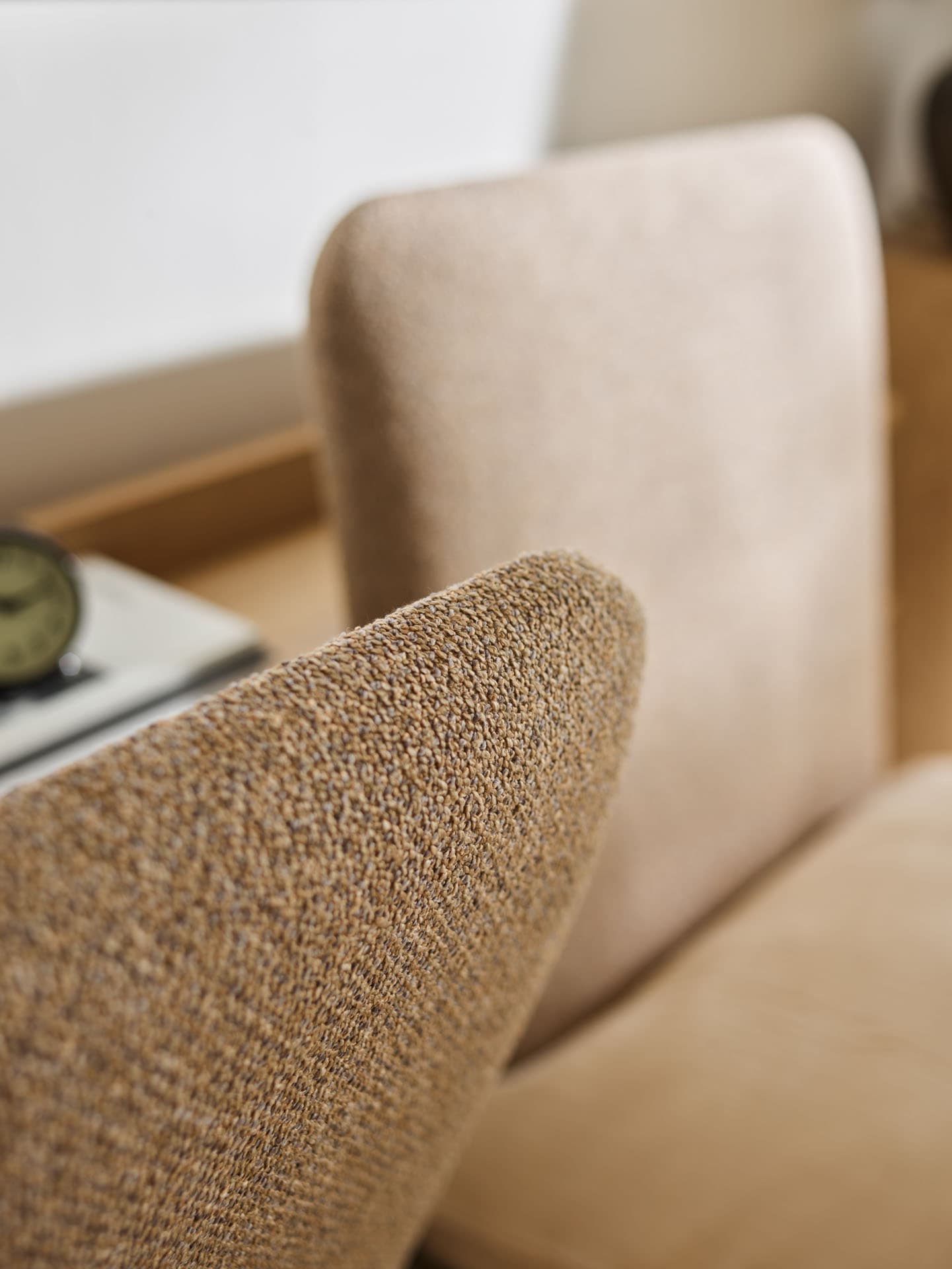 - Soft, upholstered backrest cushions increase comfort when reading or relaxing in a sitting position, and their neutral color scheme blends harmoniously with the warm shade of wood.