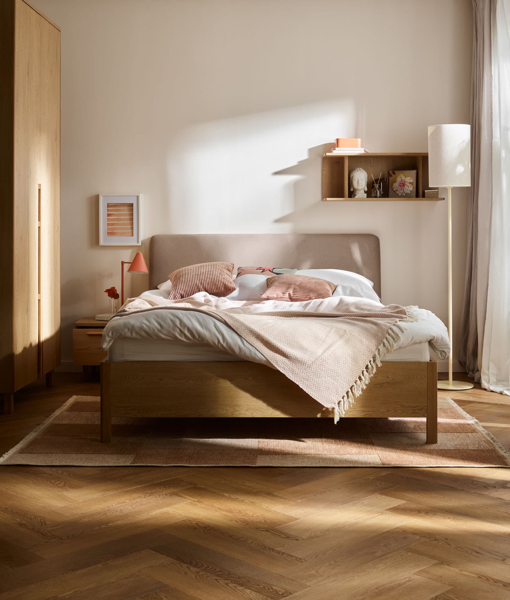 - The soft, upholstered form of the headrest brings a sense of coziness to the interior and balances the simple, calm line of the wooden bed frame.