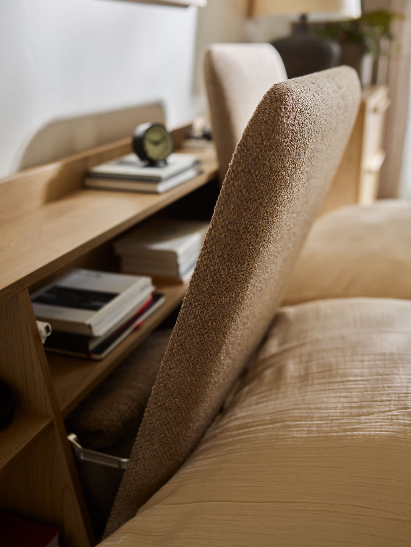 - Soft, upholstered backrest cushions increase comfort when reading or relaxing in a sitting position, and their neutral color scheme blends harmoniously with the warm shade of wood.