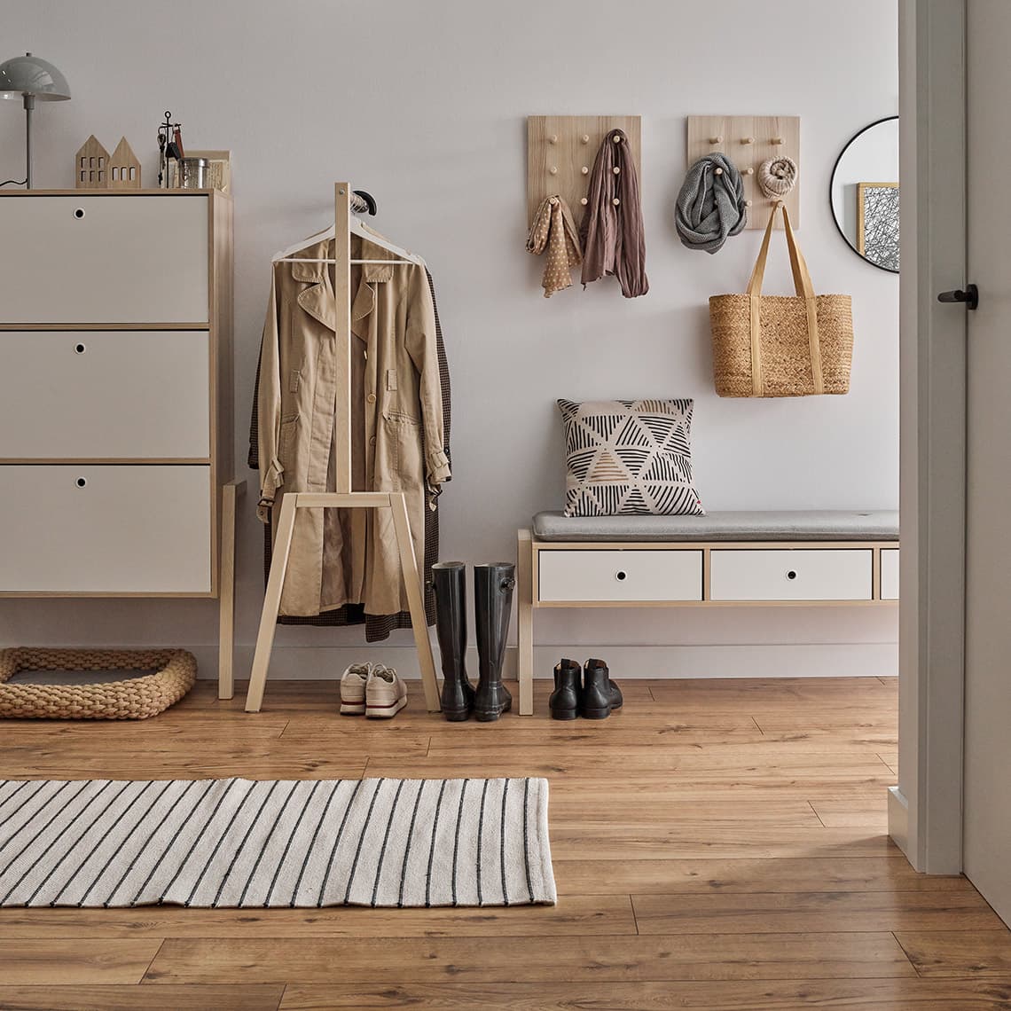 - High legs give the bench lightness and make cleaning easier. The free space underneath can be used to store shoes or decorative baskets.