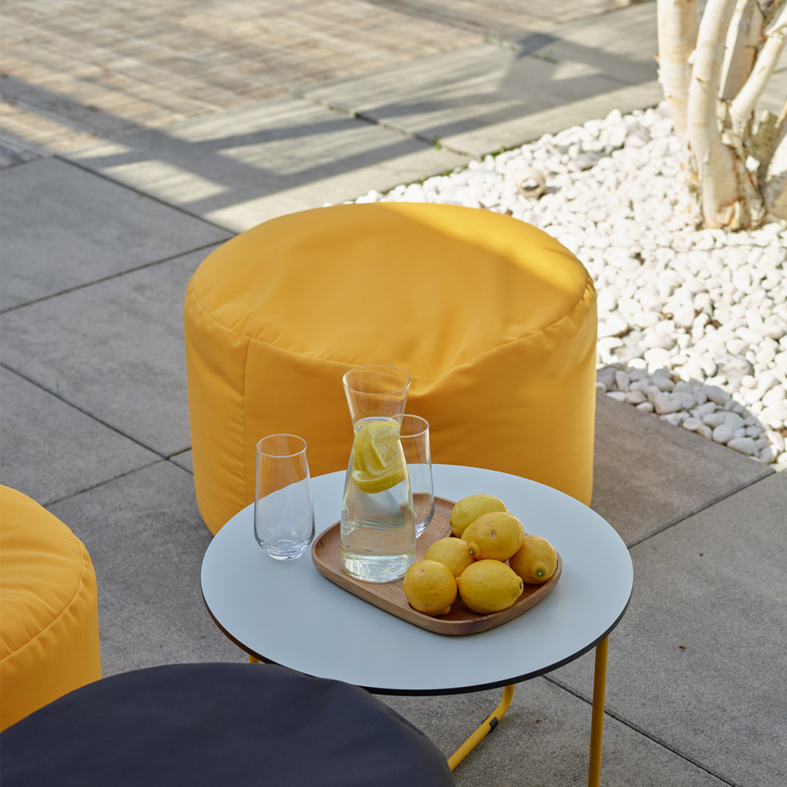 A wide and ultralight pouffe that will also work well as a table. It can function equally well on the terrace and garden, as well as inside the house.