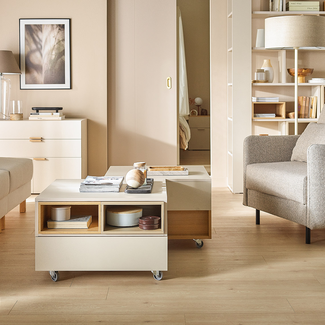 The 4 You Fresh coffee table will enhance your living room decor and help you organize small items with its extra niche and drawer. Mount the included feet or practical casters to easily change its positioning according to your needs. Keeping things organized will be made easier with dedicated boxes. Universal colors and geometric form make the piece of furniture well suited to many interior styles and other VOX collections.