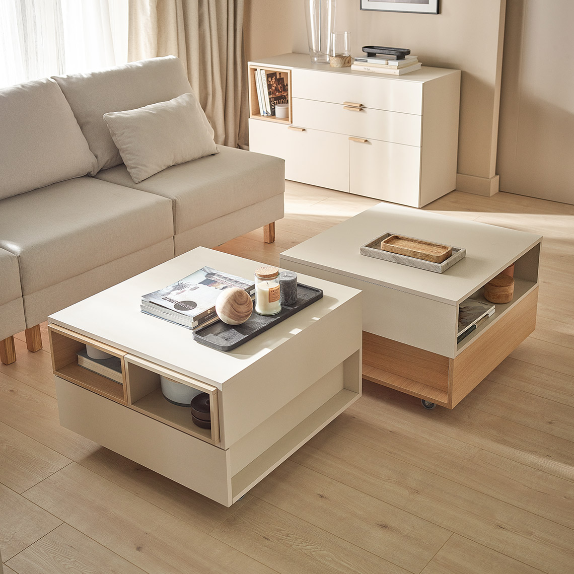 - A small square coffee table takes the form of a spacious cube with an additional niche and a practical drawer - located in the lower part of the table, it allows you to hide many small items and keep them in order. The handles have been discreetly incorporated into the sides. Thanks to the slides with a silent closing system, its use is convenient and quiet. It is enough to gently push the drawer to close itself.
