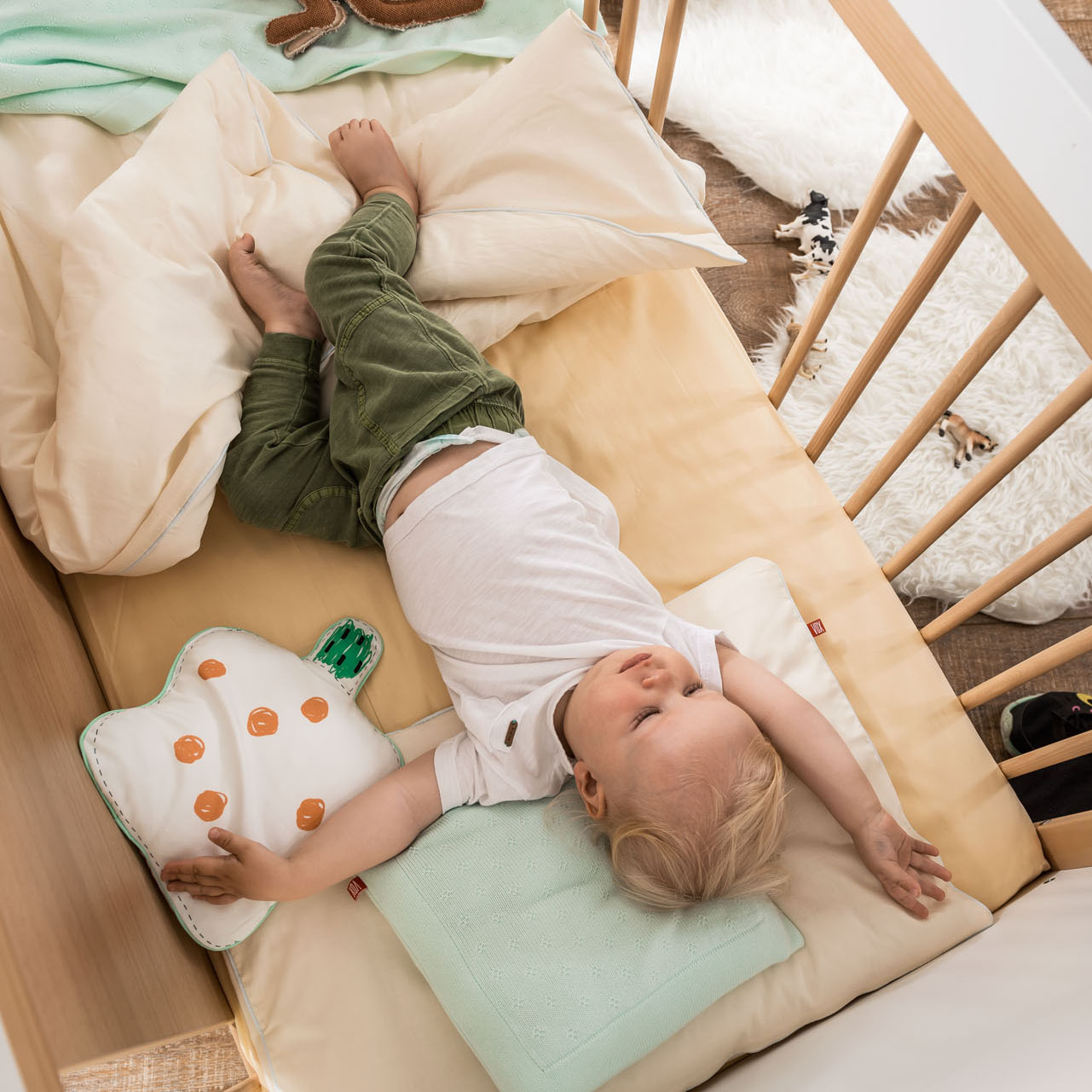 The 4 You crib on wheels can be used as a freestanding piece of furniture or as an extra bed by the parents' bed - just remove one of its sides. Under the 60x120 cm mattress space there are 3 open shelves for children's accessories and toys.