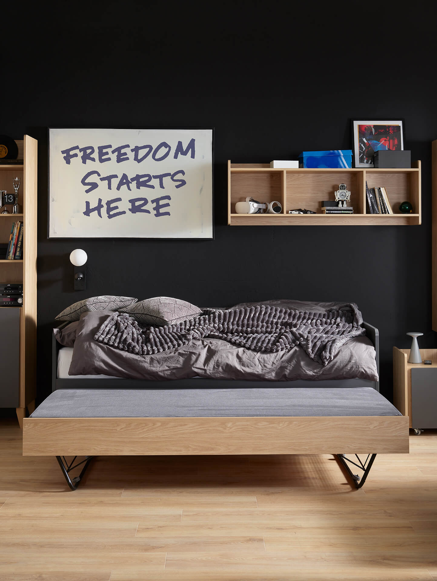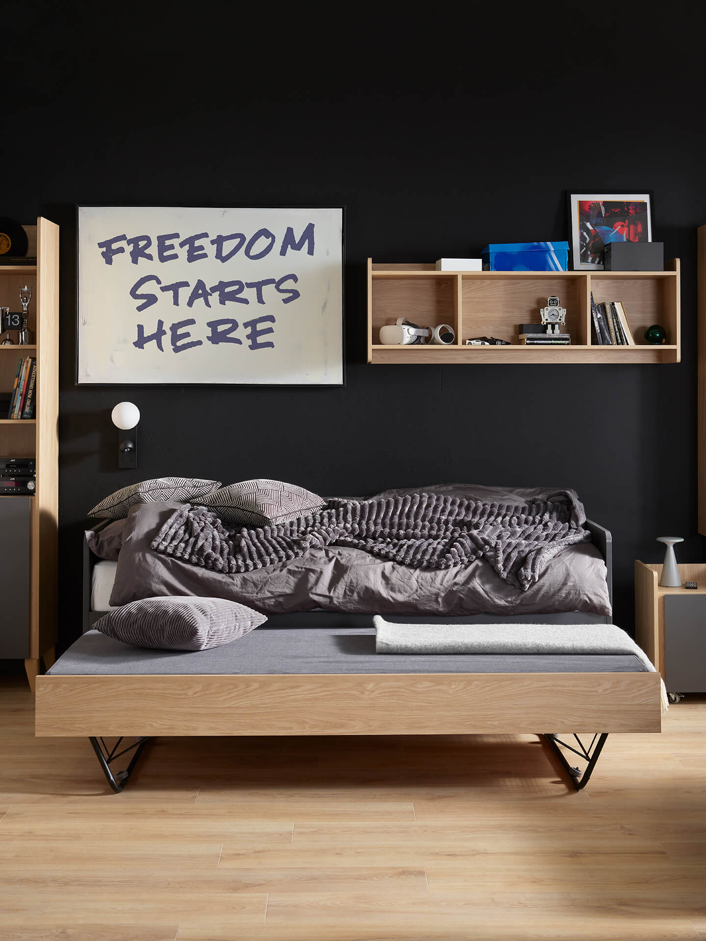 - The sofa looks good with other furniture from the Muve collection. It is worth placing a pedestal next to it to guarantee the child convenient access to all necessary items. The offer also includes other furniture with a sleeping function - a pull-out bed and a fold-out armchair.