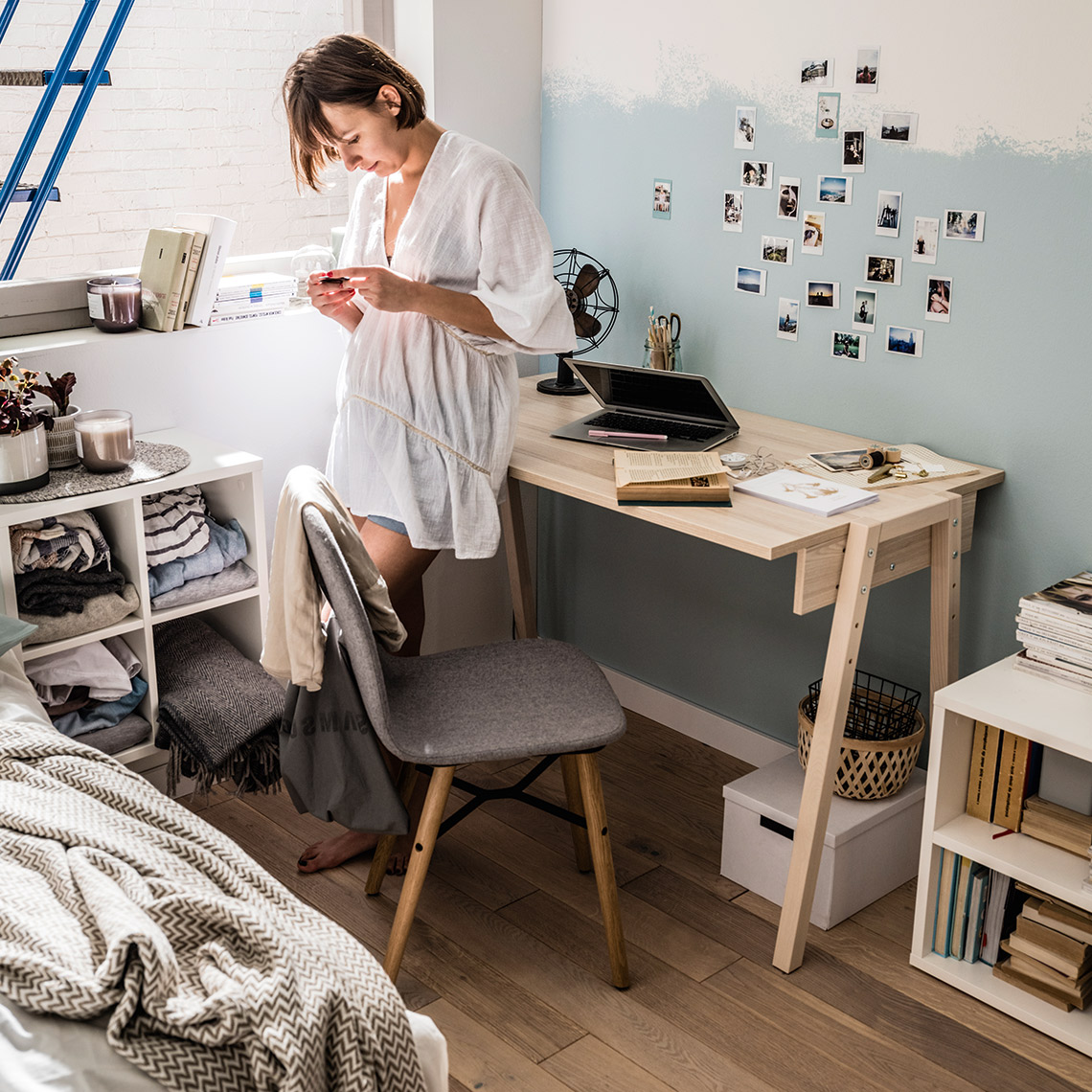 Desk from the Pl Young collection with a height-adjustable top and solid wood legs. Thanks to its universal color scheme, it will work well in both a child's and a teenager's room.
