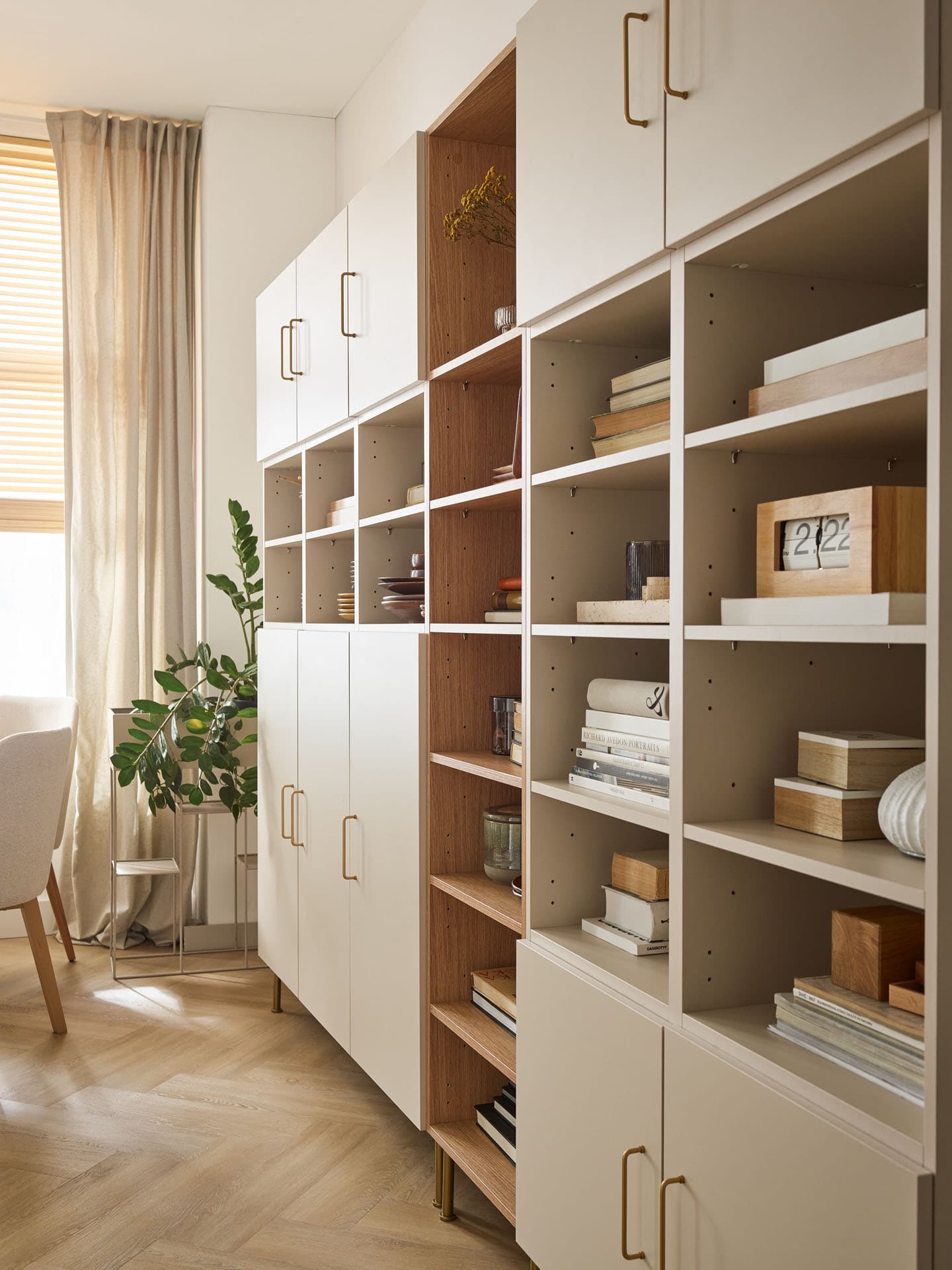- You can leave the shelves of the double bookcase open or match them with fronts in 4 different sizes (single or double). All of them have a silent closing system (the exception is the choice of the Push to open system, which prevents the use of silent closing).