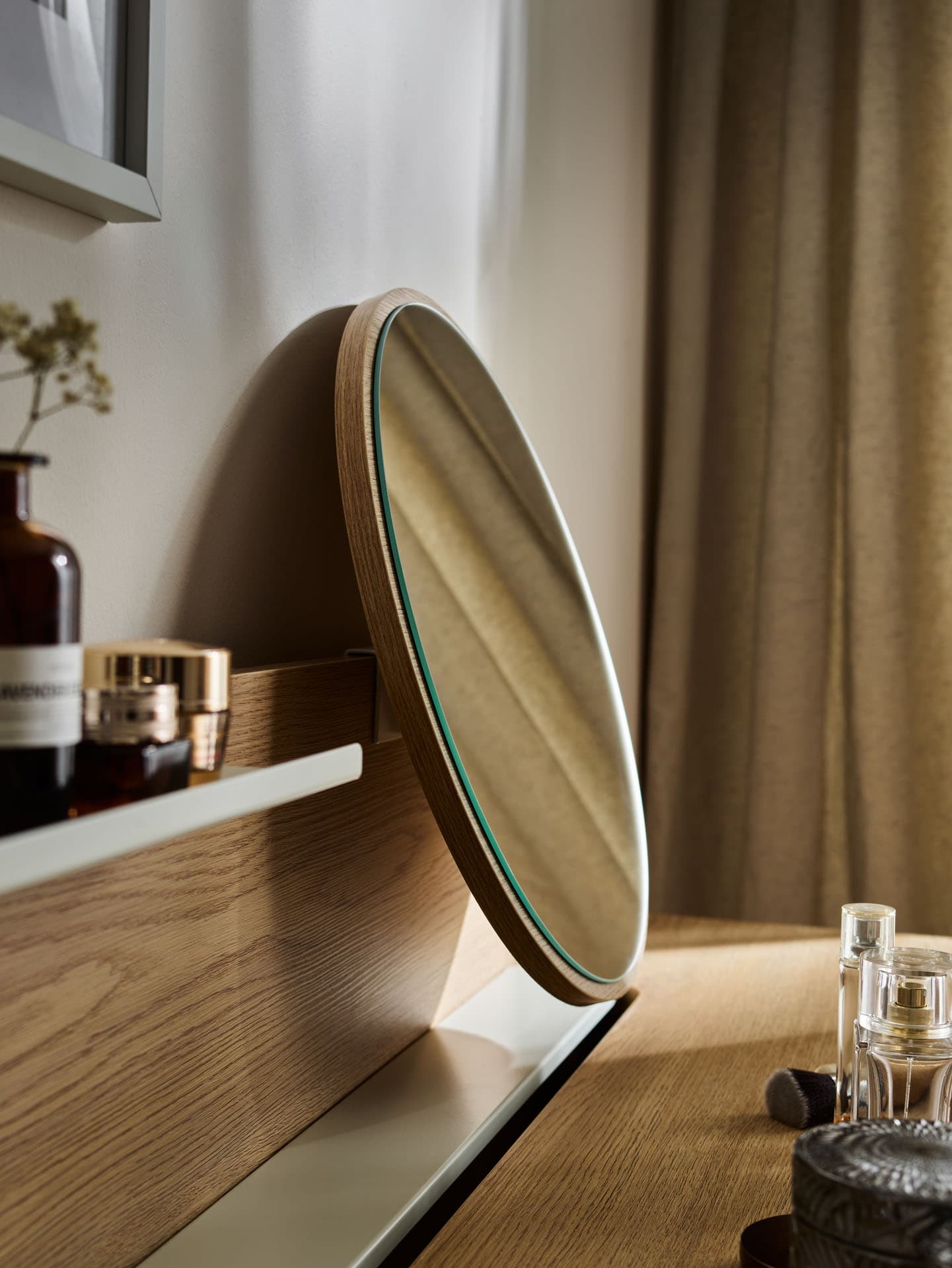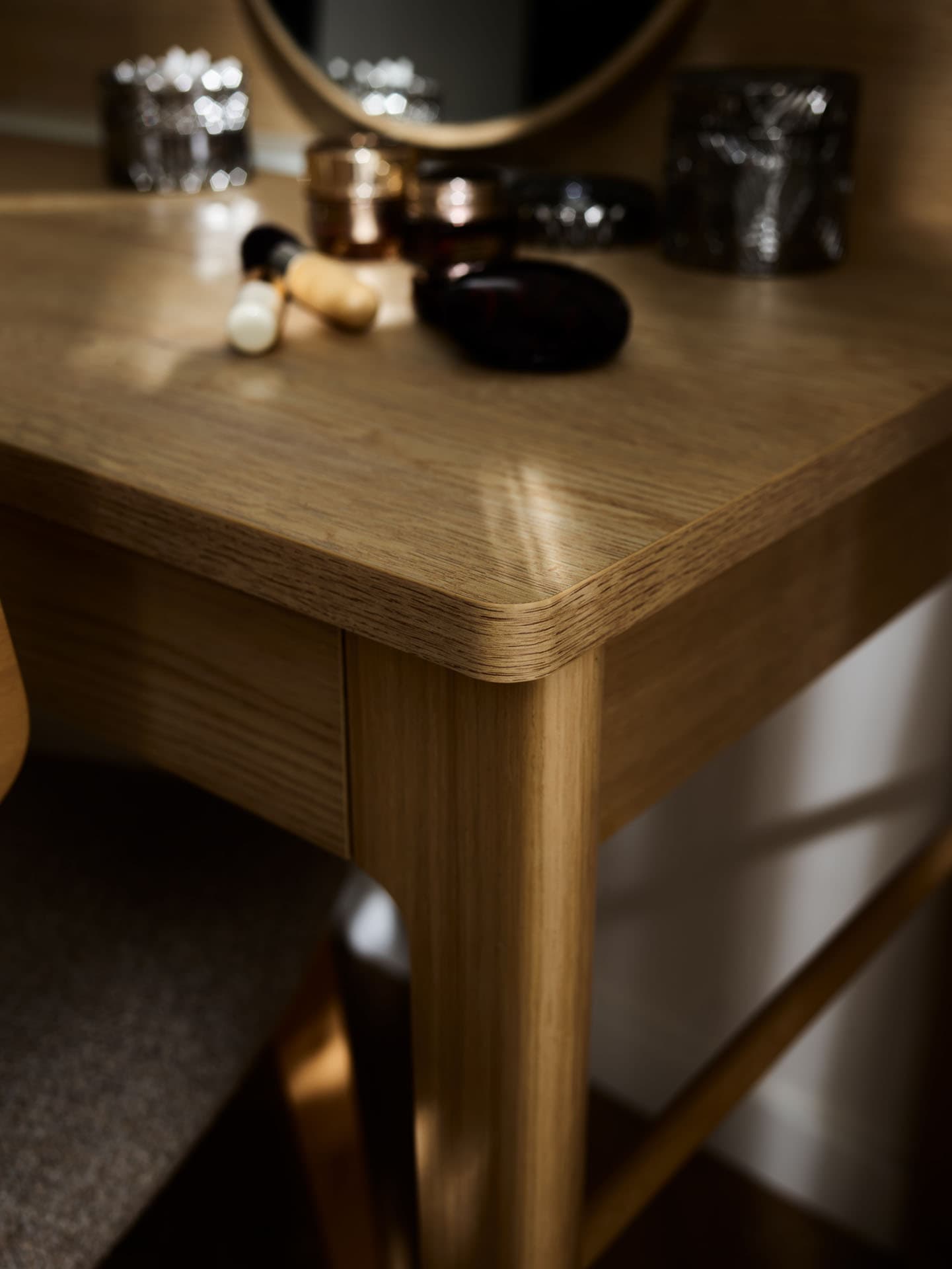Dressing table from the Well collection is a piece of furniture that allows you to slow down and makes moments in front of the mirror a pleasant ritual. The warm shade of oak, the softly profiled edges of the top and the solid wooden frame build an atmosphere of harmony and comfort. The well-thought-out set allows you to keep the tabletop tidy and conveniently store cosmetics and makeup accessories.