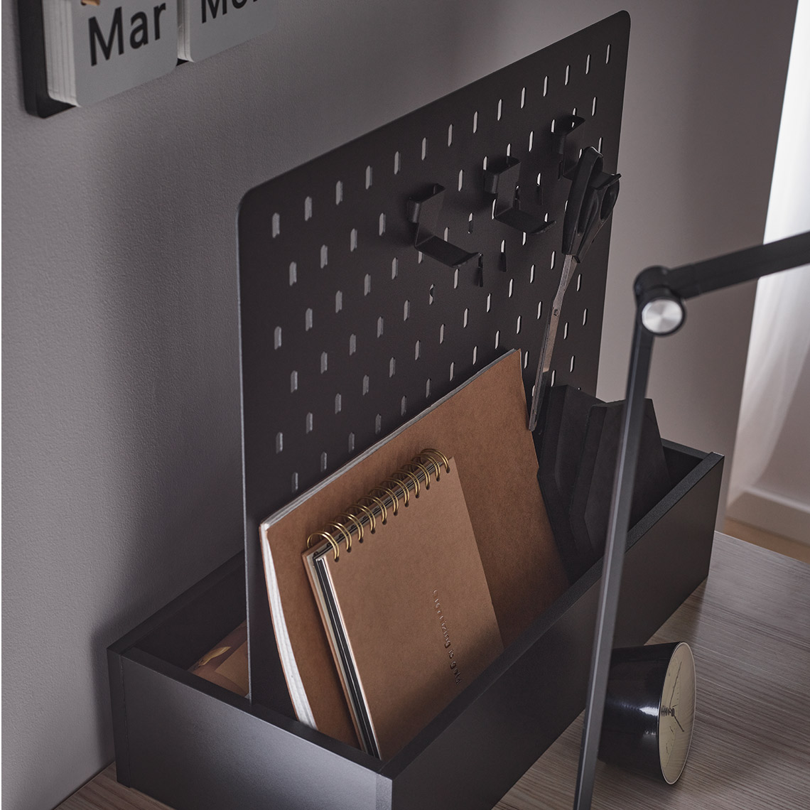 - The perforated board and hooks were manufactured from powder-coated steel sheet with a fine matte texture.