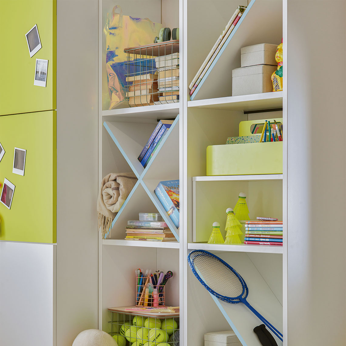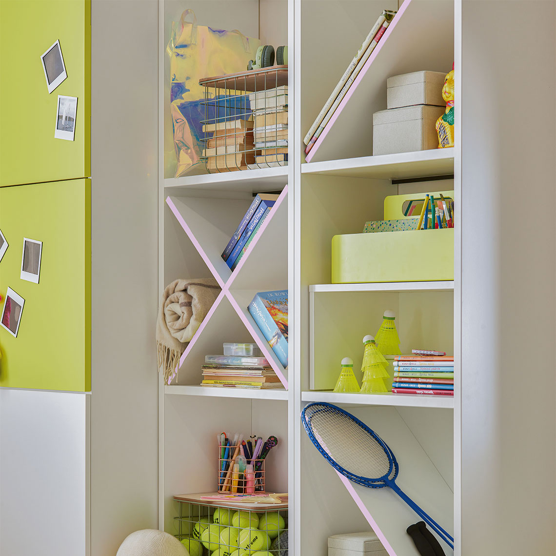 X-shaped filler divides the space inside a piece of furniture and allows aesthetic experimentation. By combining different shapes and colors of geometric fillers in furniture, you can create a functional space that is also an impressive visual installation.