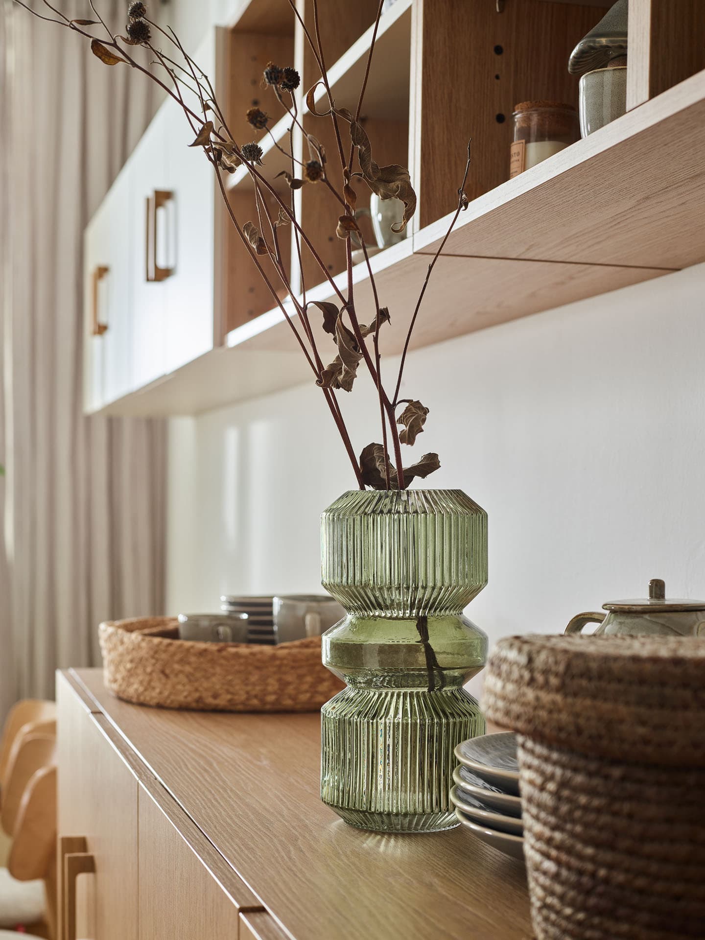 The Flora vase of olive green glass impresses with its sophisticated hourglass form with vertical grooves that create an interesting play of light and shadow.