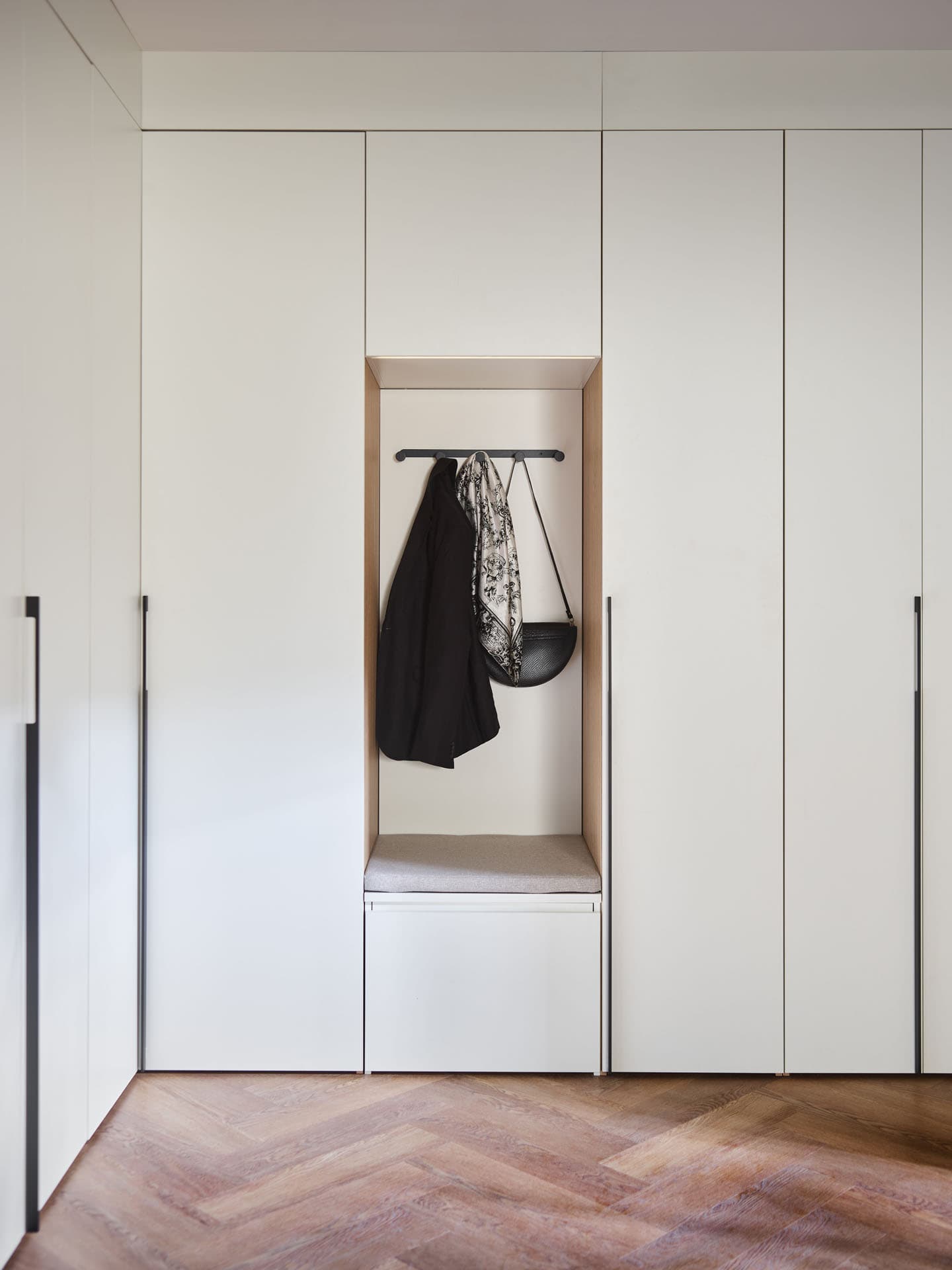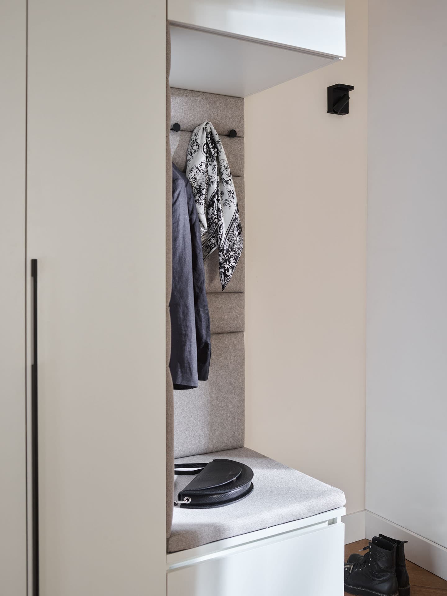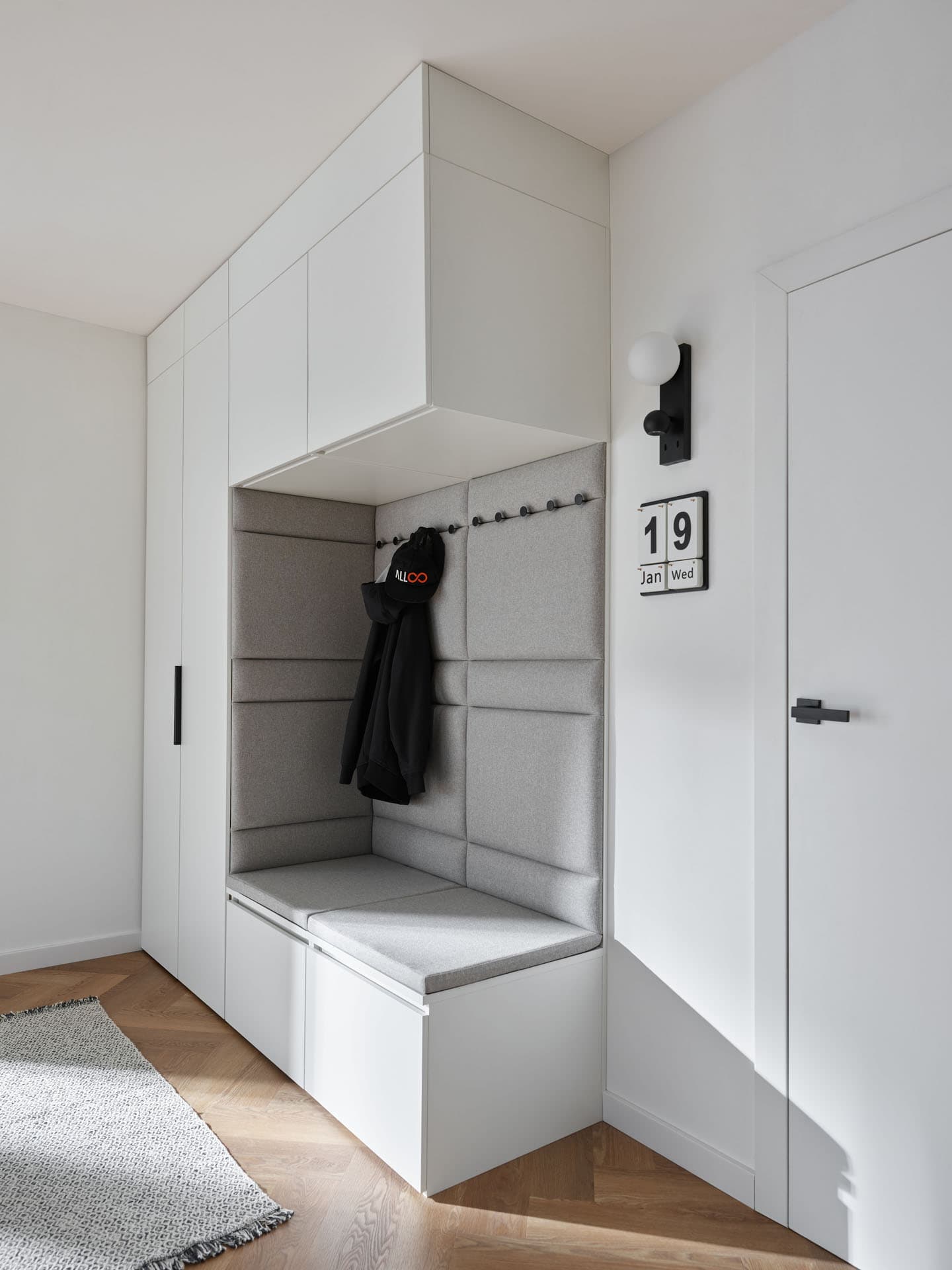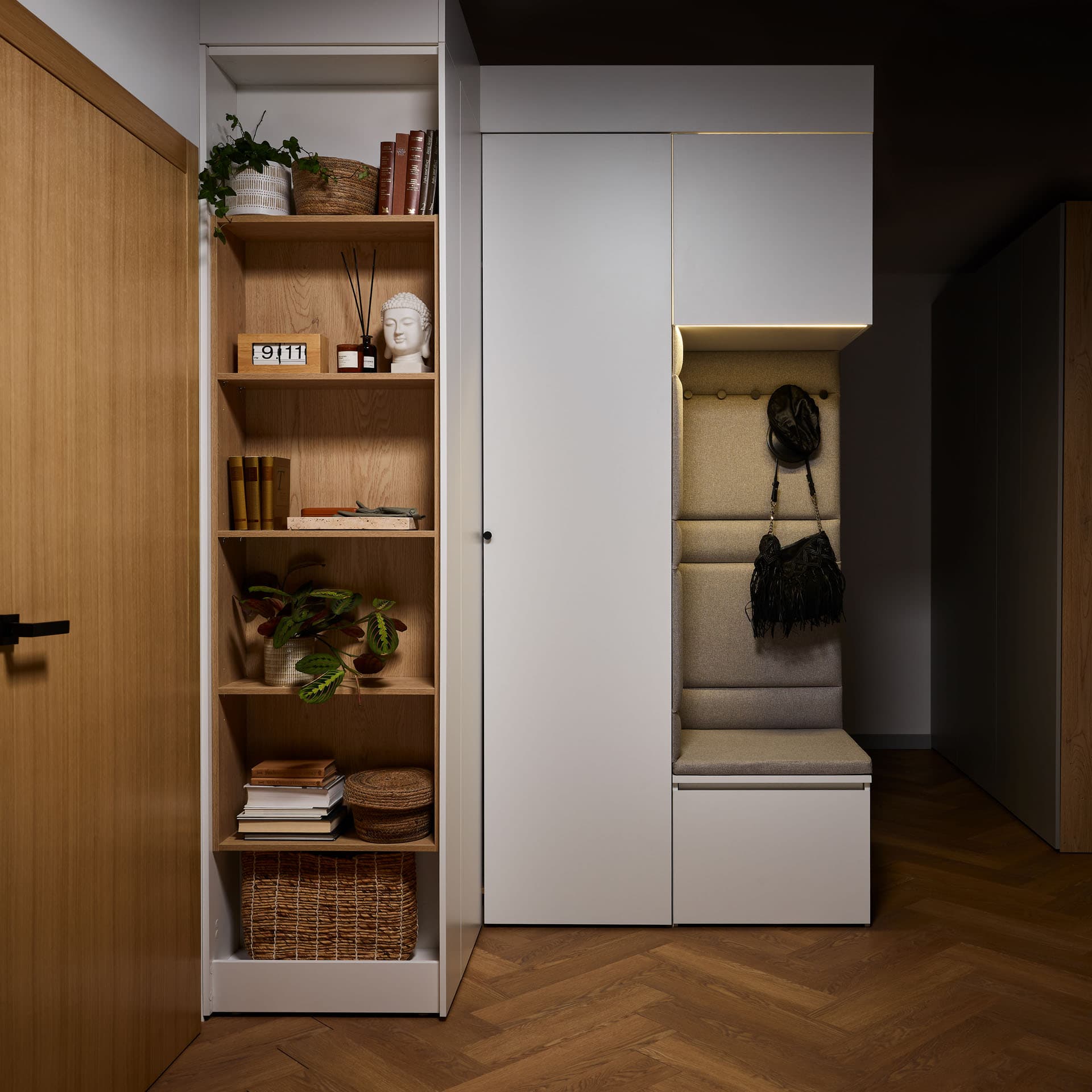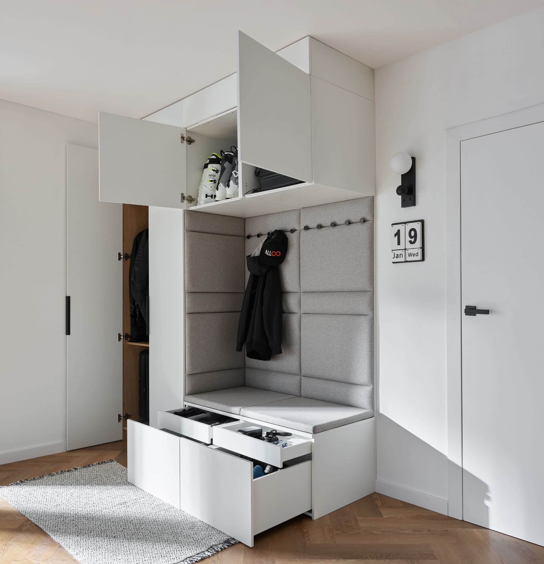 - Comfort Package - The equipment includes a soft-seat cabinet with a bottom drawer for shoes and an inner drawer for small accessories such as umbrellas, keys and small accessories. Also included is a back panel of the board with a lath with hooks, and a top pavilion with LED lighting on the front. In addition, the rear surface of the built-in has been finished with upholstered panels, which increase the comfort of use and give the whole unit a cozier feel.