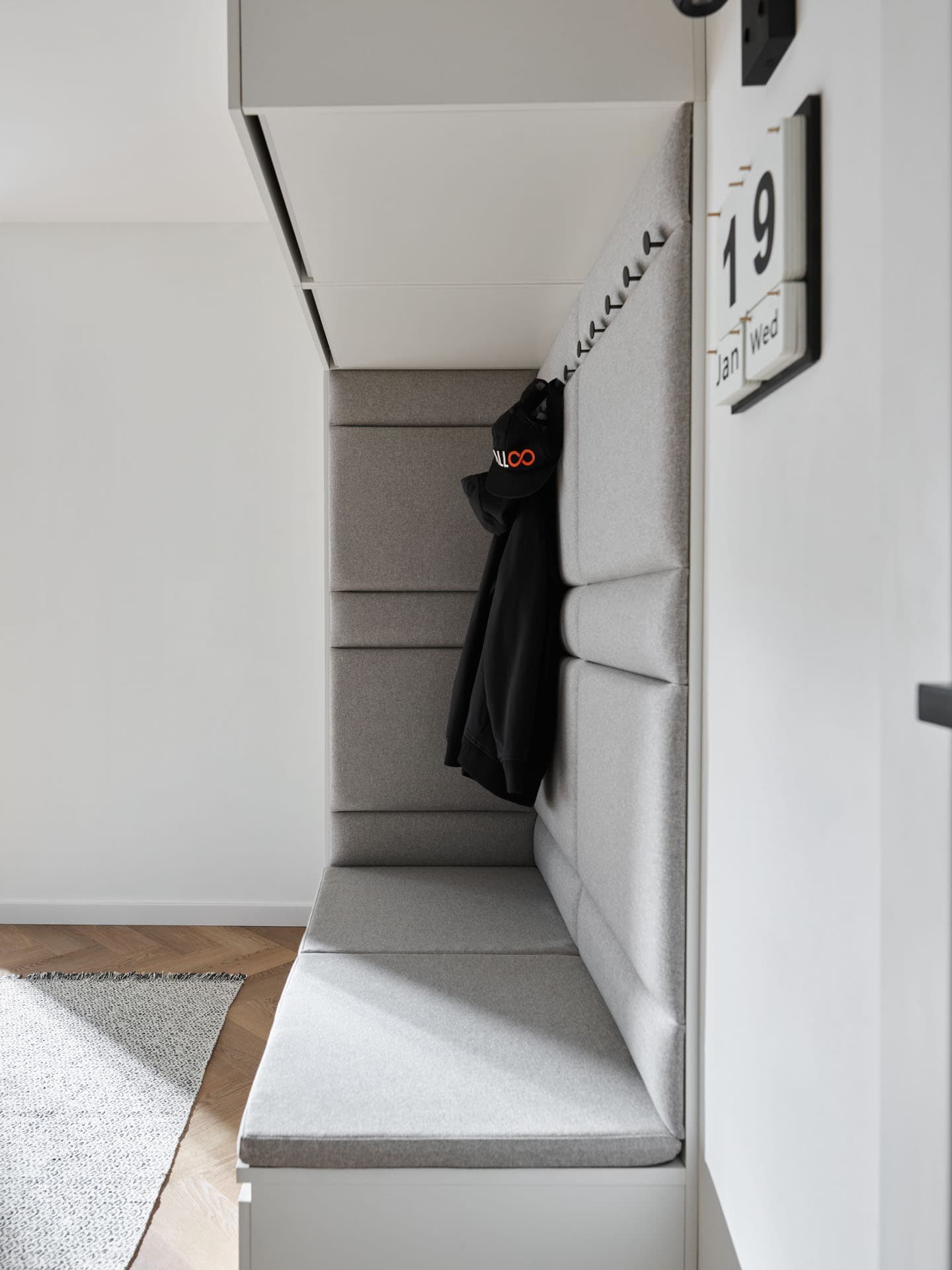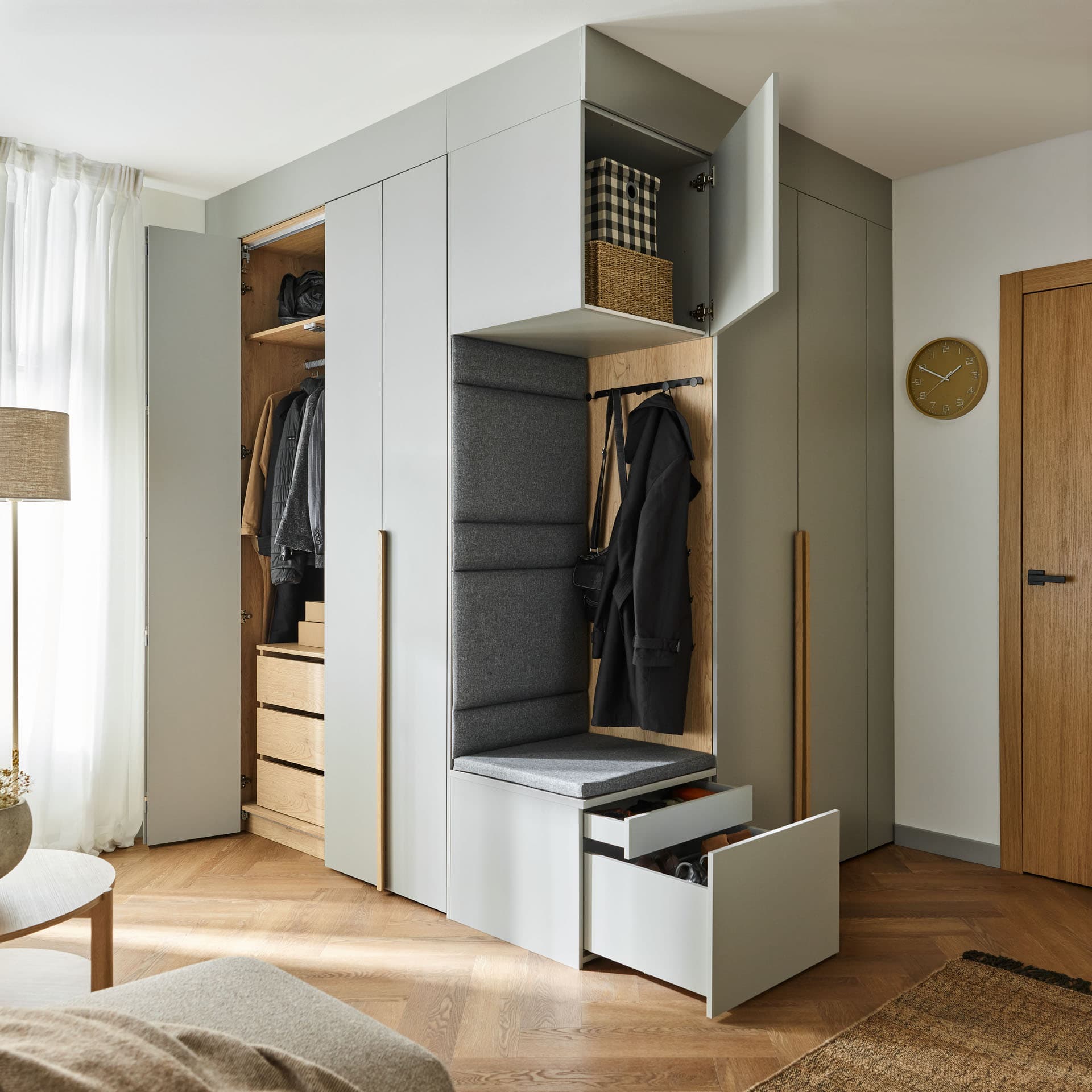 This compact hallway wardrobe set helps organize your daily exits and returns, offering storage space, seating and aesthetically pleasing built-ins. It keeps all your essentials close at hand and keeps your hallway tidy and stylish. The pedestal can be easily expanded with other Stor closets and create the perfect hallway closet.