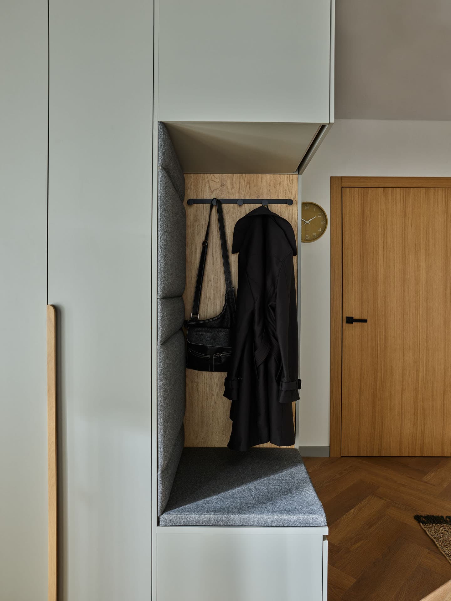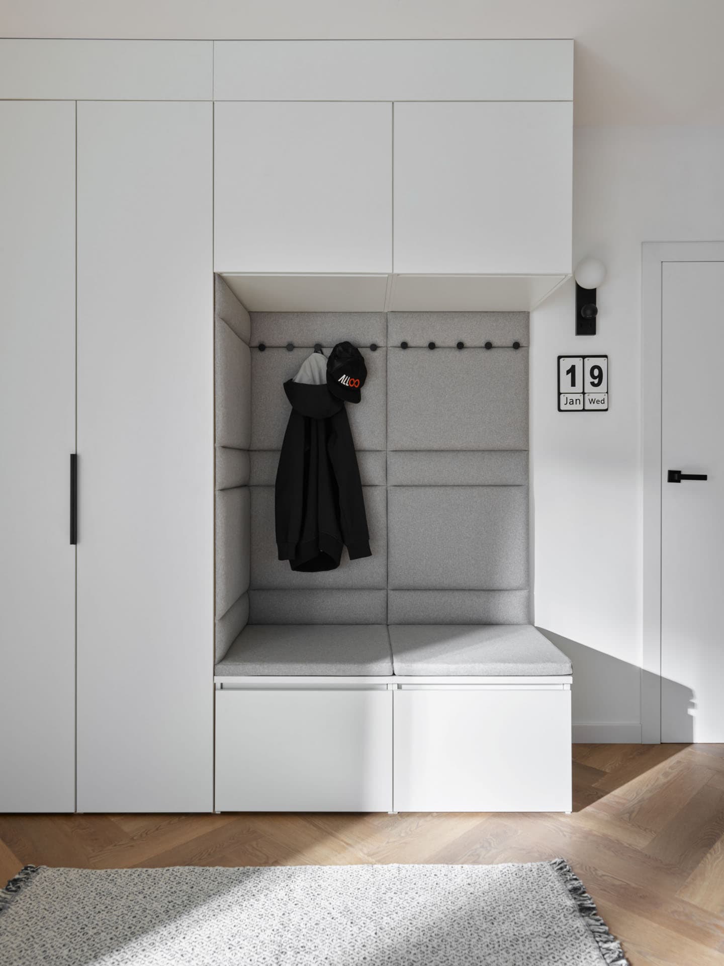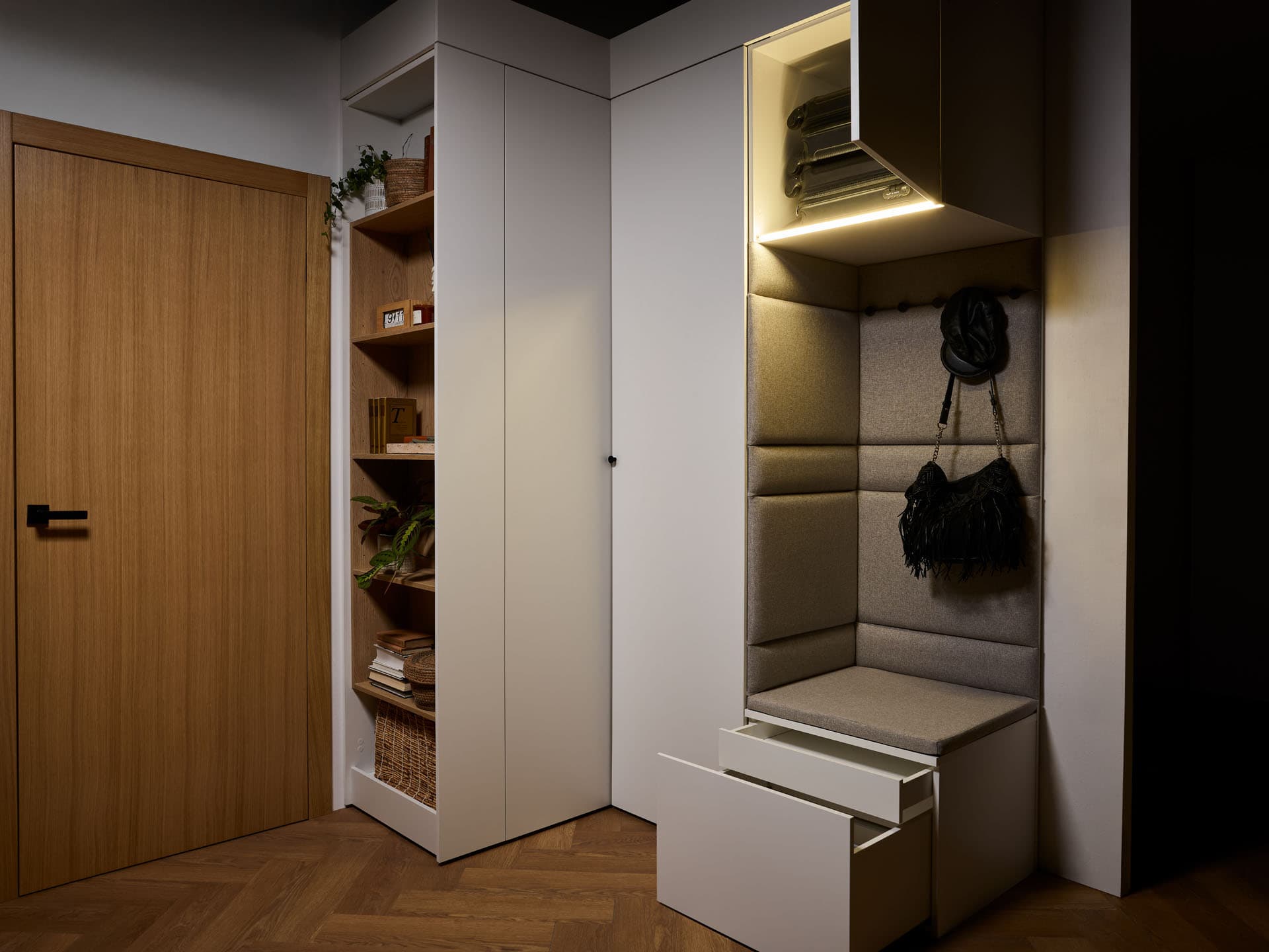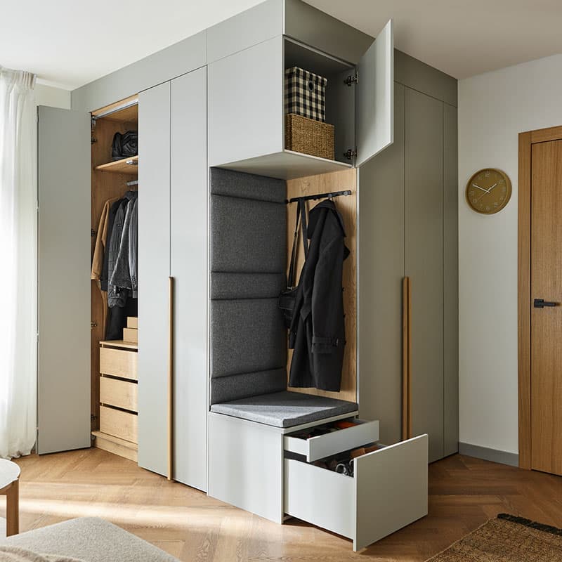 - Comfort Package - The equipment includes a soft-seat cabinet with a bottom drawer for shoes and an inner drawer for small accessories, such as umbrellas, keys and small accessories. Also included is a back panel of the board with a lath with hooks, and a top pavilion with LED lighting on the front. In addition, the rear surface of the built-in has been finished with upholstered panels, which increase the comfort of use and give the whole unit a cozier feel.