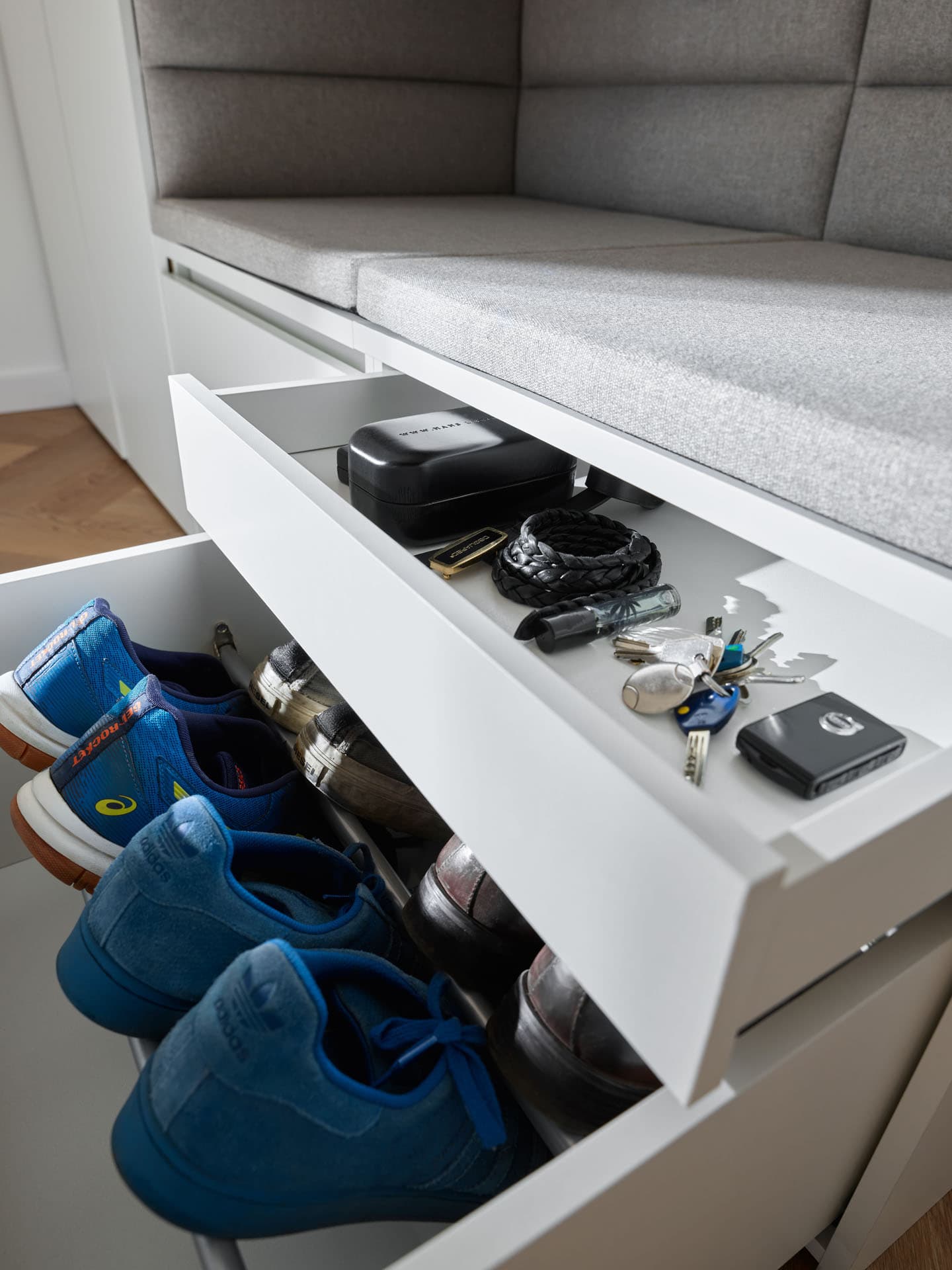This compact hallway wardrobe set helps organize your daily exits and returns, offering storage space, seating and aesthetically pleasing built-ins. It keeps all your essentials close at hand and keeps your hallway tidy and stylish. The pedestal can be easily expanded with other Stor closets and create the perfect hallway closet.