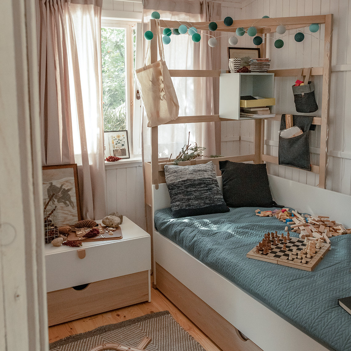The denim hanging organizer can be easily attached to bed ladders, sofas or desks from the Stige collection.