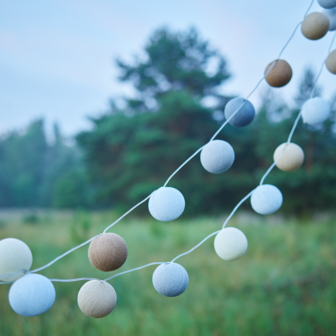The set consists of 20 spheres with LED-type lighting, as well as a USB power supply and a dedicated cable. The diameter of each ball is 6.5 cm. The length of the double cable with lights is 150 cm. The total length of the cable is 290 cm. The length of the cable from the plug to the switch, is 120 cm. The warm light of the happy lights will bring a unique mood to the interior. The possibility of any arrangement of the lights - whether on the dresser, floor or hanging them on the wall allows you to arrange the space in many ways. Other color variants are also available in the VOX offer.