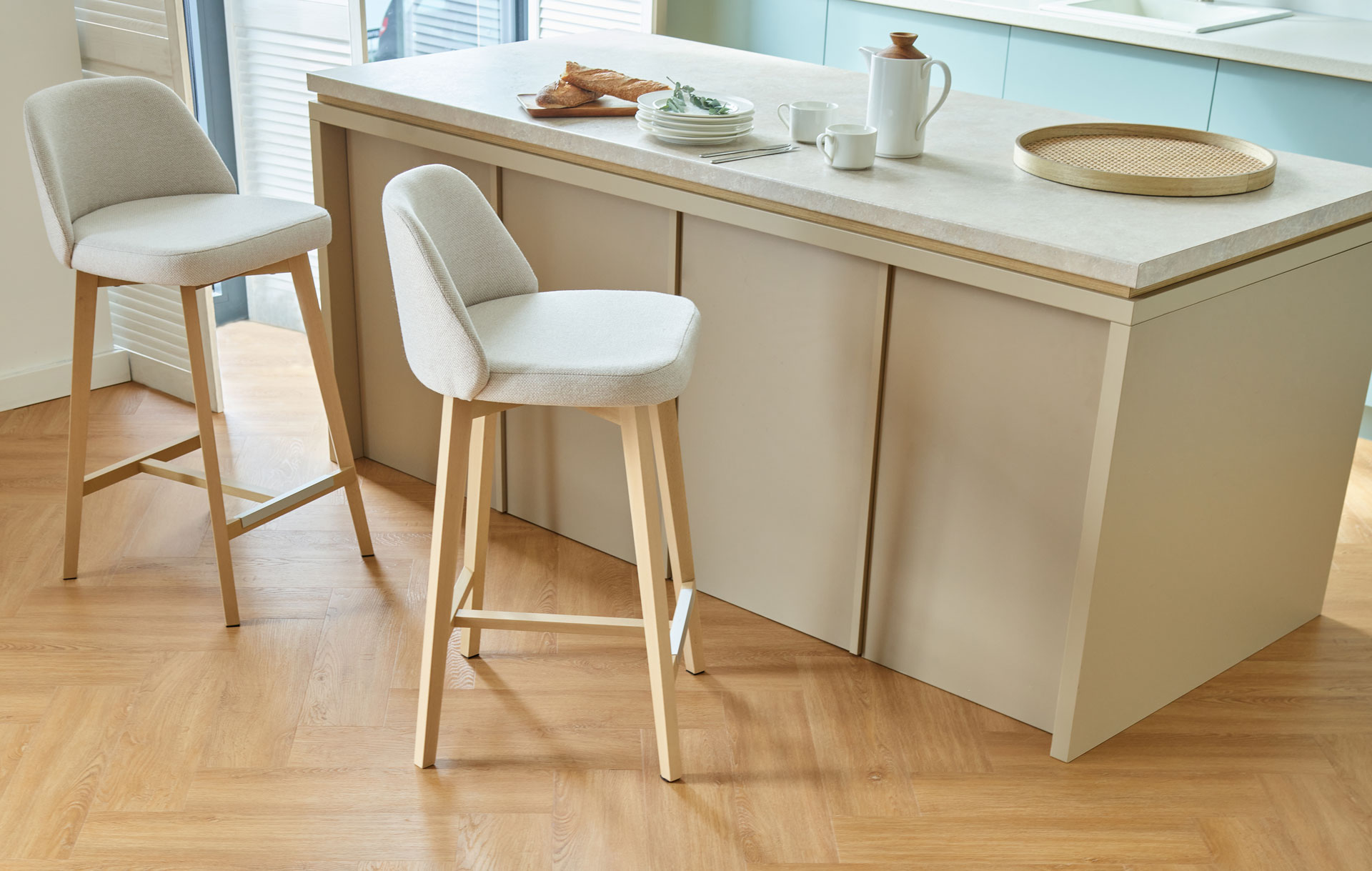 The Komm upholstered hocker with a seat height of 75 cm is an excellent choice for high tables and kitchen islands with a height of 100-105 cm, providing seating comfort and leg support.